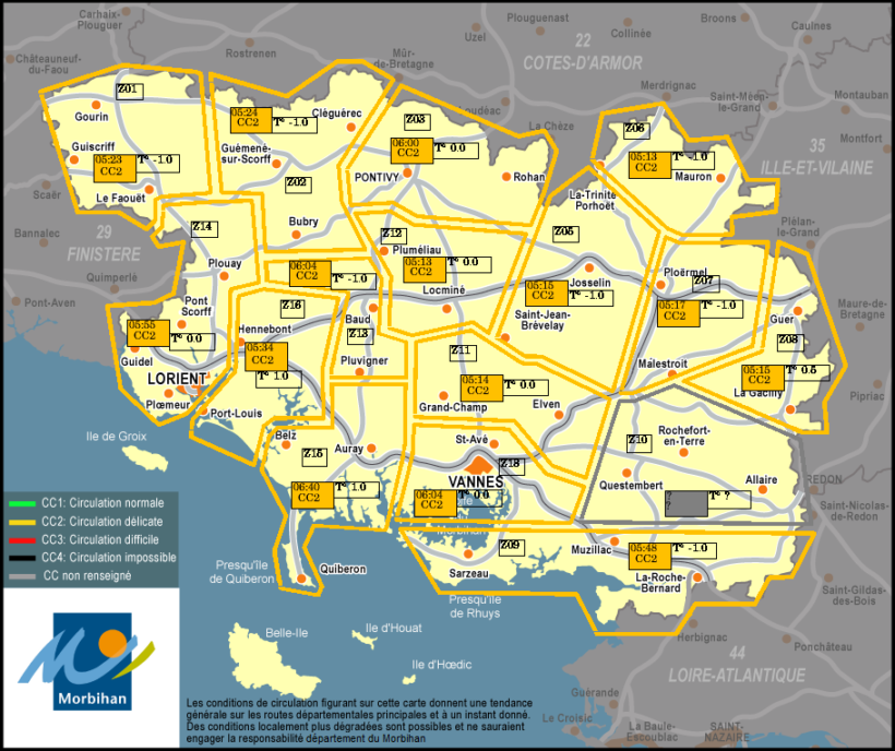 Voici la carte de l’état des routes et des conditions de circulation dans le Morbihan, diffusée par le PC routes du conseil départemental, ce vendredi matin 25 décembre. Attention, la situation est délicate sur tout le département.