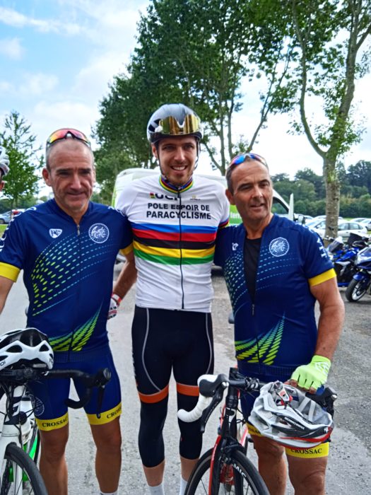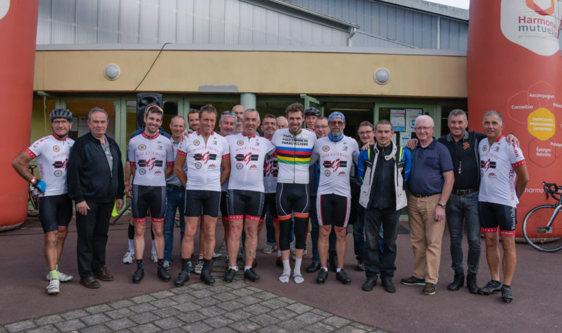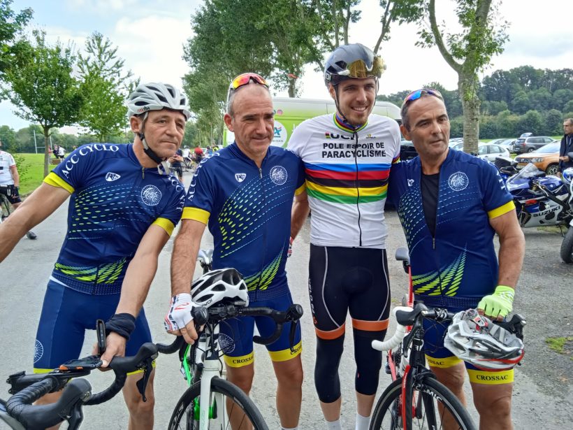 Après une première annulation le 4 juillet dernier pour raison sanitaire, la Coeur de Bretagne s’est déroulée ce dimanche 26 septembre avec une fréquentation satisfaisante de 325 cyclistes venus pédaler pour la cause de l’Autisme. Et parmi les sportifs en selle on retrouvait bien évidemment le médaillé d’or paralympique de cyclisme Dorian Foulon qui a tenu sa promesse en partageant la route durant 103 km avec son beau maillot de champion du monde sur les épaules.