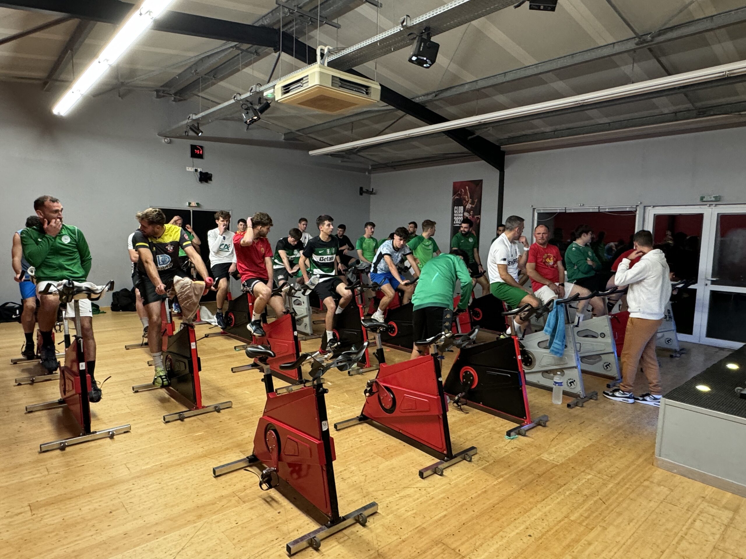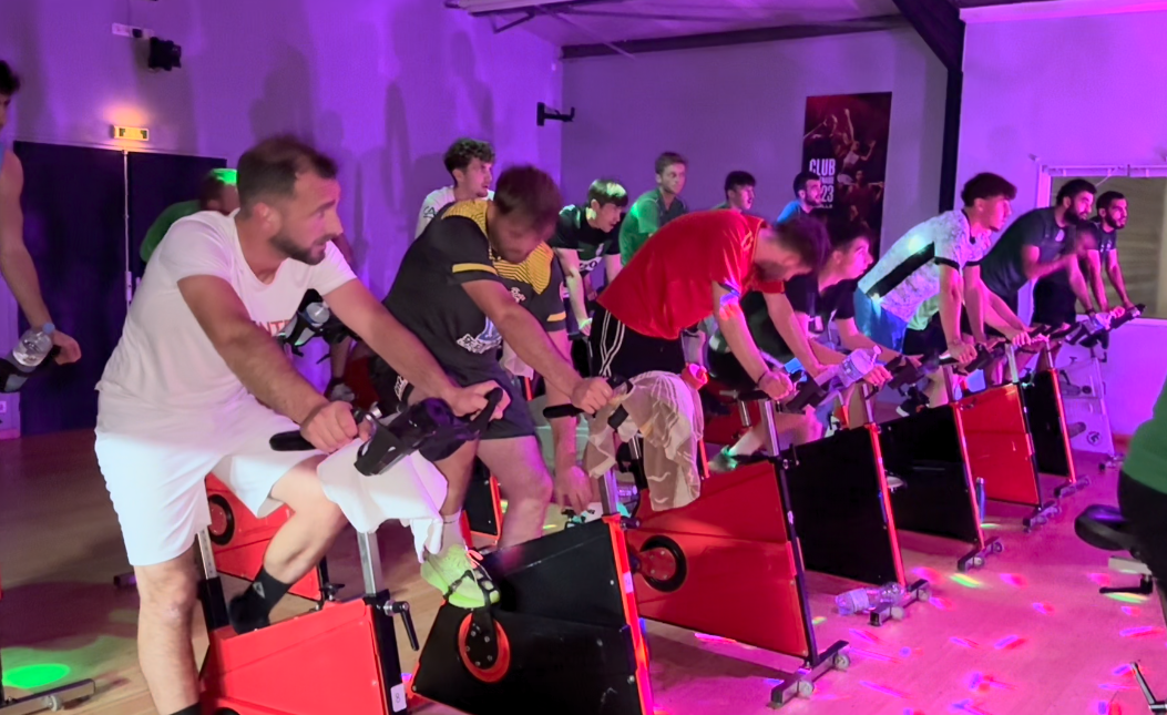 Pas de problème pour ça : les joueurs ont eu droit à une séance de RPM aux petits oignons, traduisez du vélo en indoor, soit 45 minutes de pédalage alternant des rythmes différents. Endurance, cardio, calories… « C’est un très bon complément d’entrainement pour les sports collectifs », commente Romain. Et c’est Valentin qui se colle au coaching. Résultat : ambiance boule à facettes avec musique entrainante pour conserver l’intensité et la cadence et… beaucoup de sueur à l’issue du temps réglementaire. On y était : voyez ce que ça donne dans notre vidéo. Si ça vous fait envie, sachez que ce type de séance est aussi accessible à l’ensemble des adhérents…