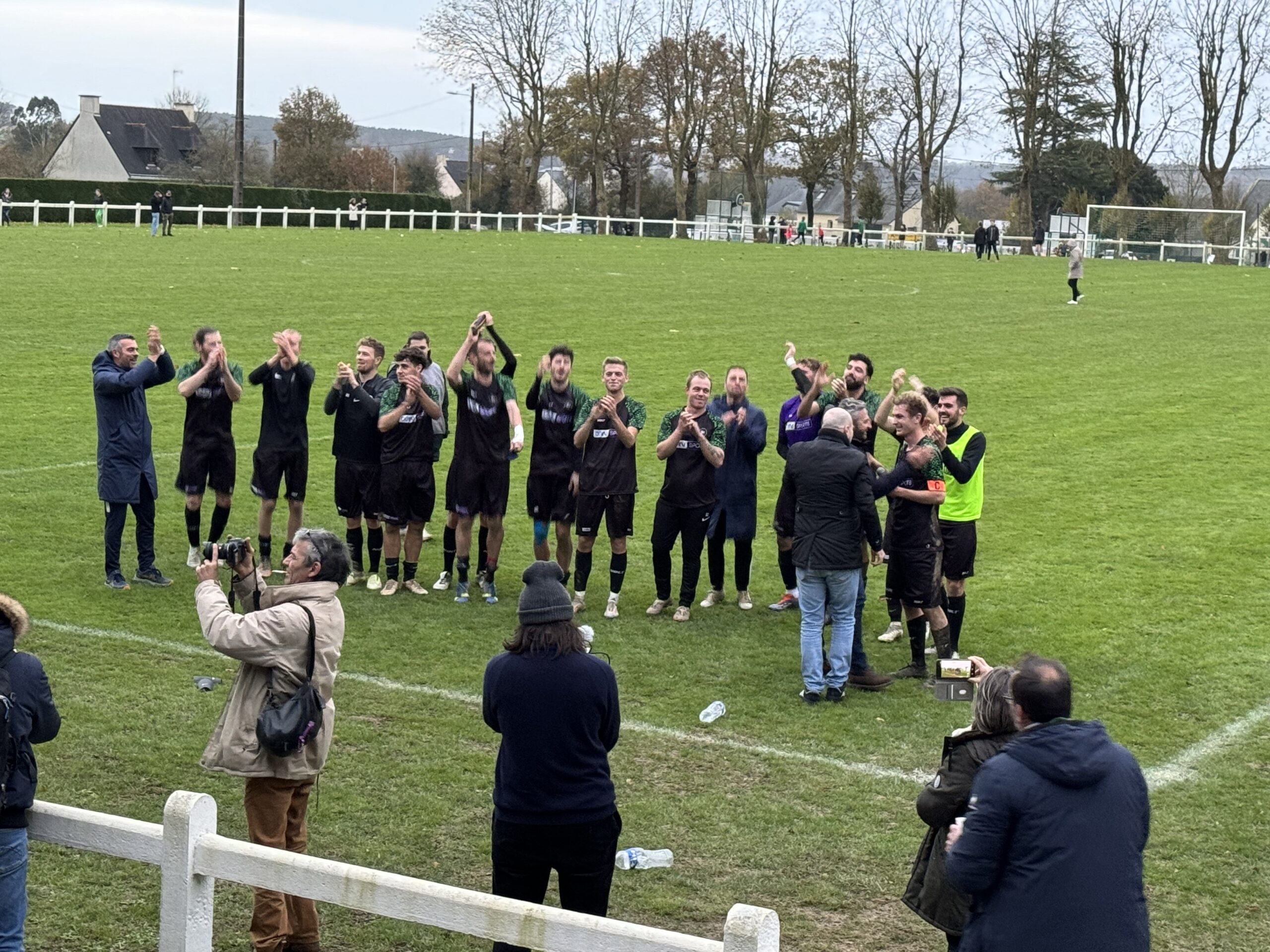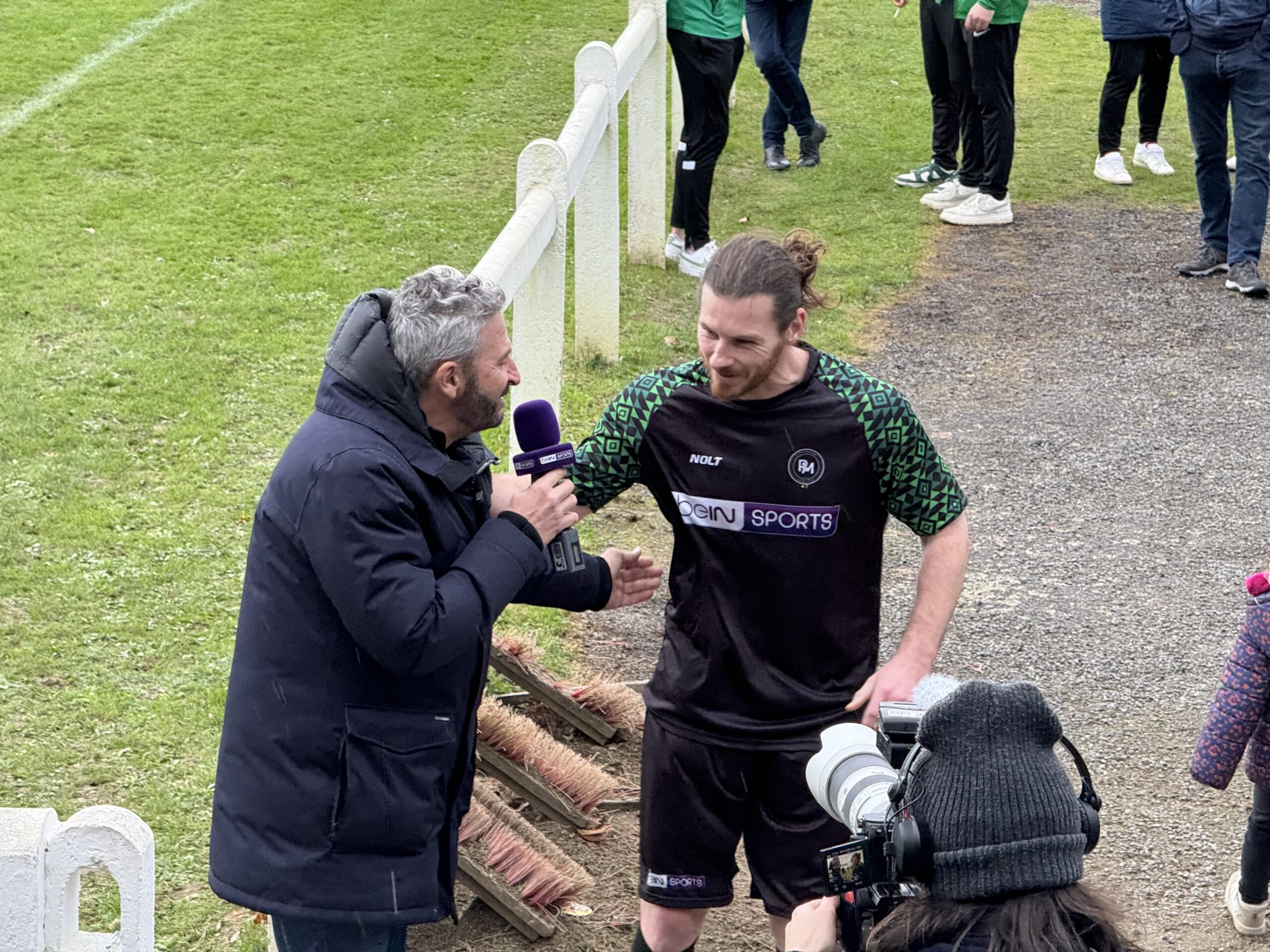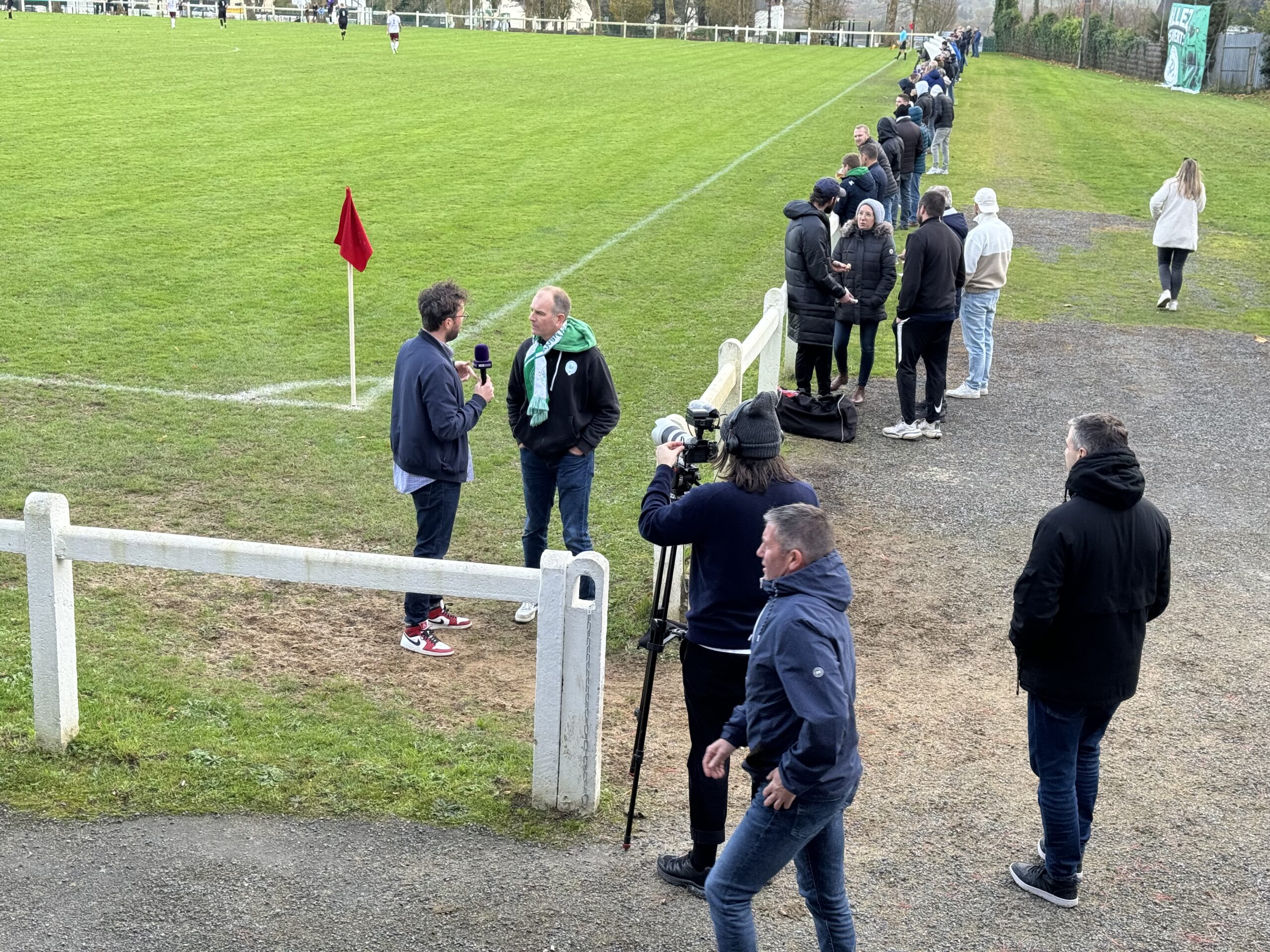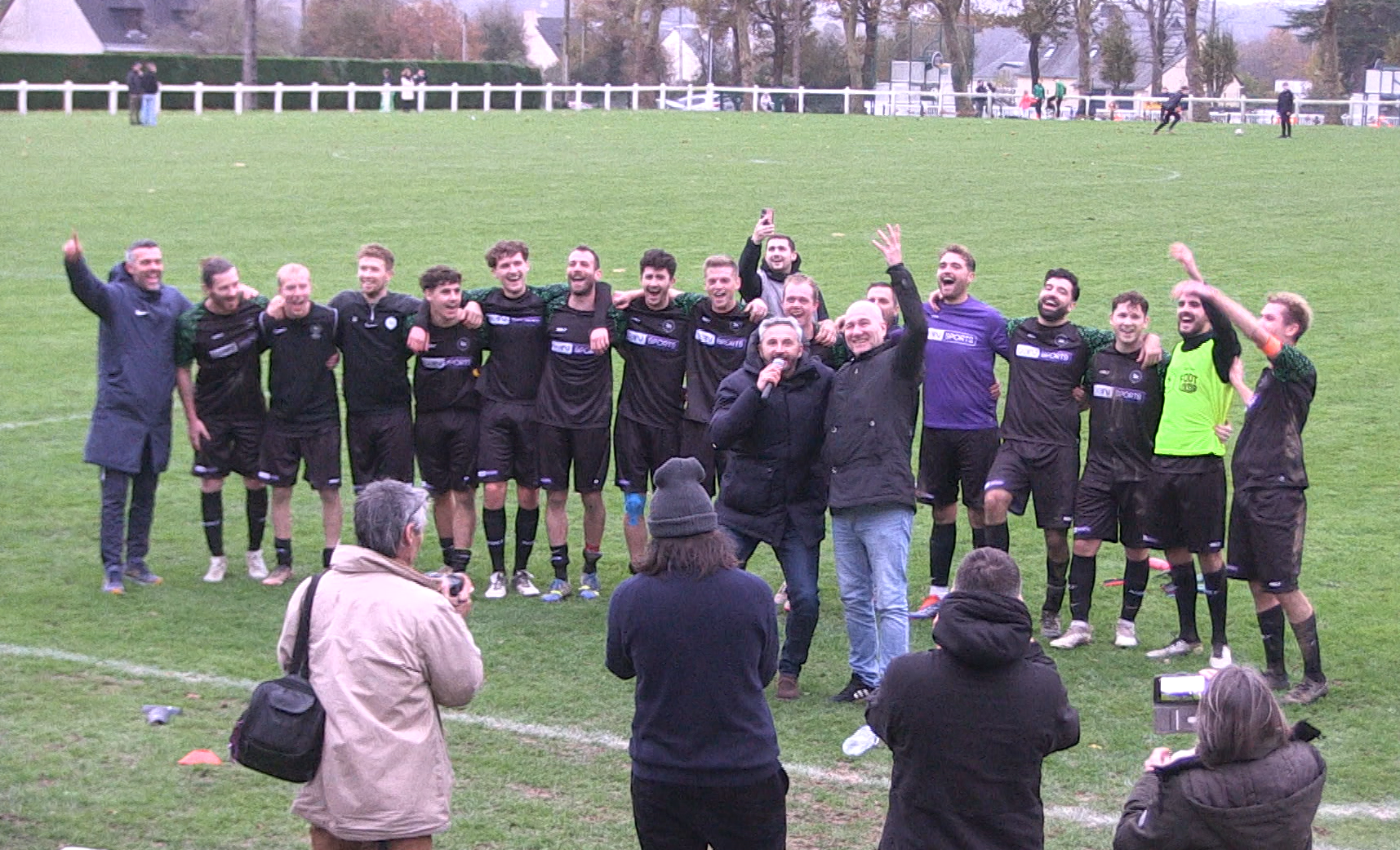Le stade de Ruffiac était bien rempli ce dimanche après-midi pour suivre encore un match exceptionnel de l’équipe de Ruffiac-Malestroit-Foot. Exceptionnel parce qu’il était suivi par une équipe de la chaîne sportive BeIn Sport et notamment par les deux commentateurs vedettes Jean-Charles Sabattier et Patrick Guillou. Une équipe très sympa et professionnelle qui s’est parfaitement fondue dans l’ambiance familiale et passionnée qui fait la renommée de l’équipe de Ruffiac-Malestroit, au-delà de ses exploits sportifs. D’ailleurs Jean-Charles Sabattier et Patrick Guillou n’ont pas hésité à enflammer le stade en participant activement à l’ovation finale des joueurs…