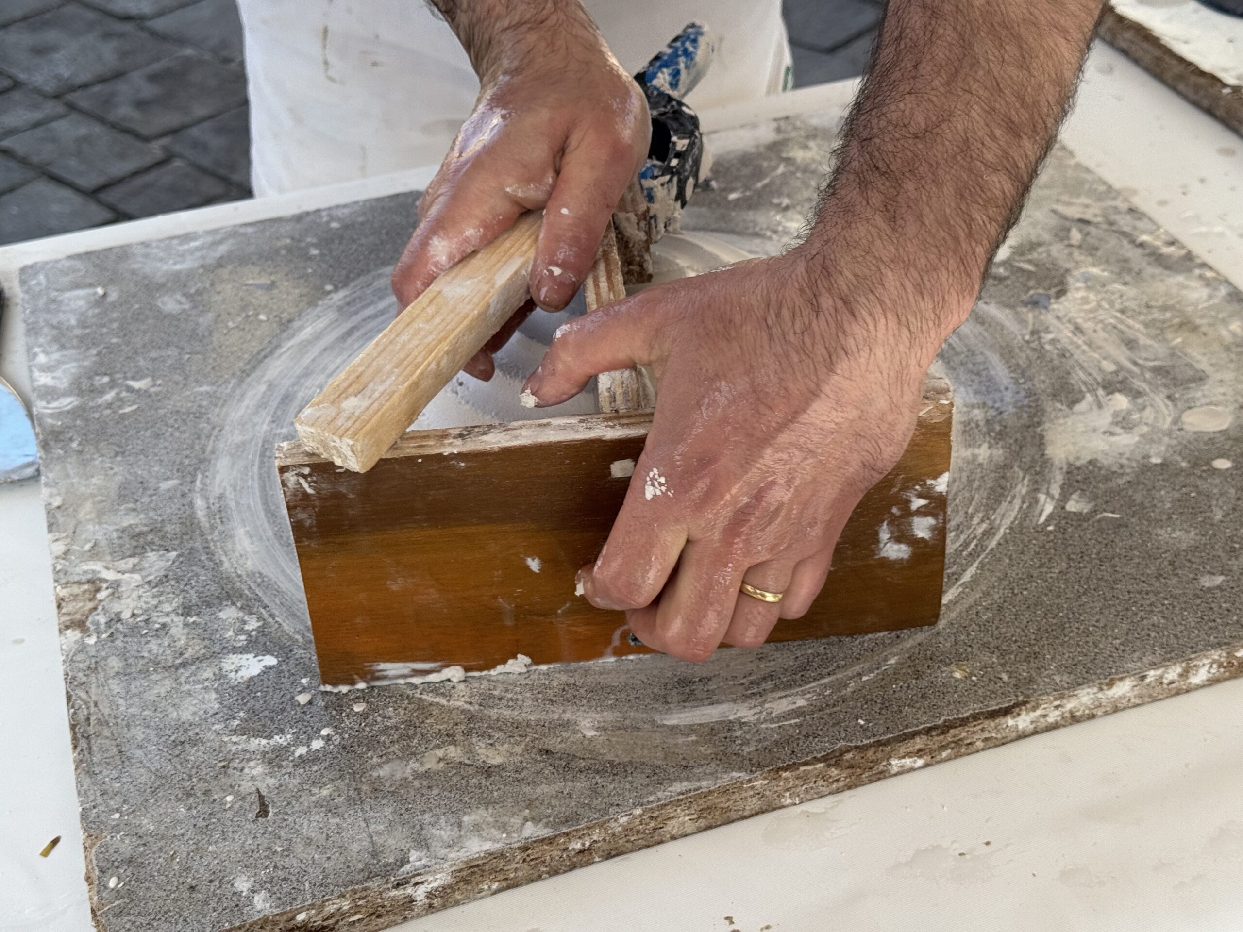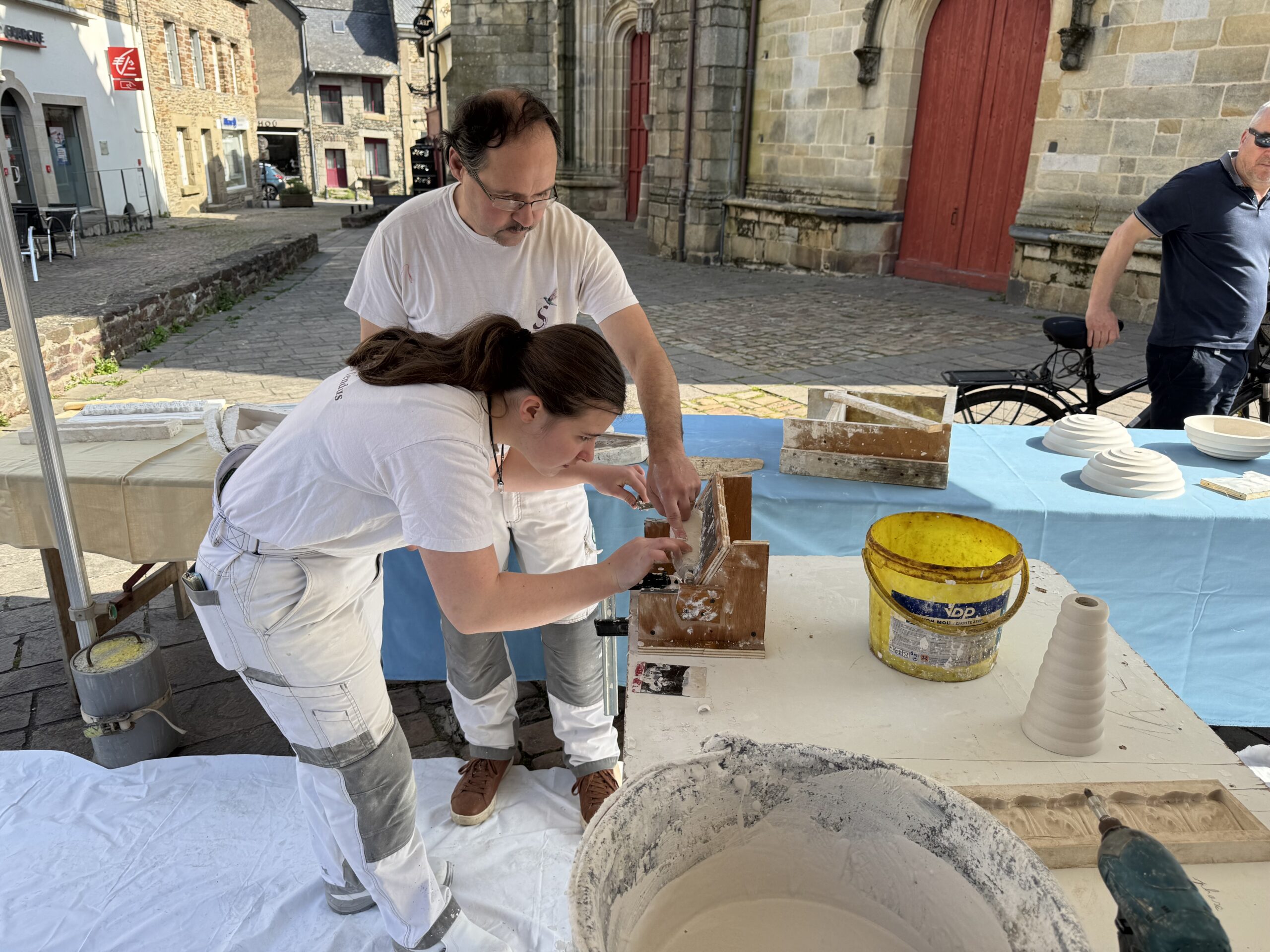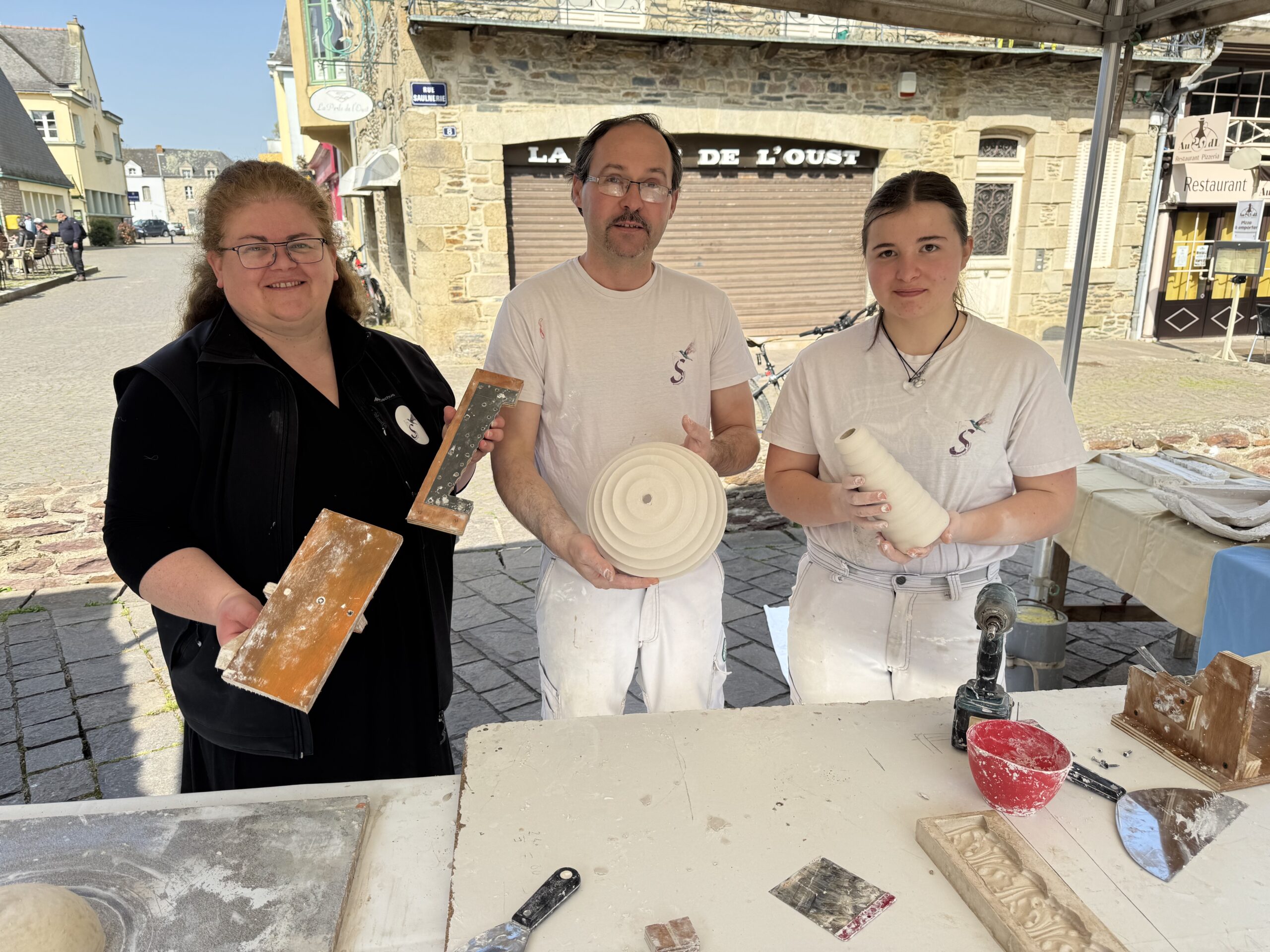 Est-ce que vous connaissez le staff? C’est un métier d’art rare qui consiste à travailler le plâtre mais dans sa version la plus noble. A ce niveau on parle de corniches, de moulures, de statues aux formes élaborées, d’un métier qui prend toute sa dimension dans la rénovation de monuments historiques. C’est le métier de Sylvain Defontaine, cet artisan installé à Caro qui a appris son métier au sein des Compagnons du devoir, après avoir passé son enfance « dans l’auge » paternelle. De son père il a tiré sa passion pour le staff, un métier dont il aime à partager toute la subtilité. Président du cercle des créateurs d’art de l’Hermine (*), il organise chaque année un festival dédié à l’artisanat d’art qui attire des milliers de visiteurs sur la digue de Malestroit. Il ne rate pas une occasion de participer à des séances de démonstration dans les écoles ou sur divers salon. Ce week-end il participait aux Journées Européennes des Métiers d’Art (JEMA). Sur le parvis de l’église de Malestroit, il avait dressé un stand sur lequel il montrait comment on réalise des objets décoratifs à base de plâtre selon deux techniques, le « trainage circulaire » et le « trainage à la broche ». Mais il n’était pas seul. Parce que dans la famille Defontaine, le plâtre c’est une passion intergénérationnelle. Le père de Sylvain Defontaine était plâtrier et sa fille Elise ambitionne d’en faire aussi son métier. Elise a attrapé le virus en voyant son père manipuler cette matière délicate et exigeante. Le plâtre demande du savoir-faire, de la rigueur, de la précision… Du coup, elle a décidé de poursuivre ses études au lycée Joseph Savina de Tréguier pour préparer un BPMA (brevet des métiers d’Art). Elle est en 1ère année et pendant ses vacances et ses week-end, elle affine sa formation aux côtés de son père. Nous les avons rencontrés à Malestroit.