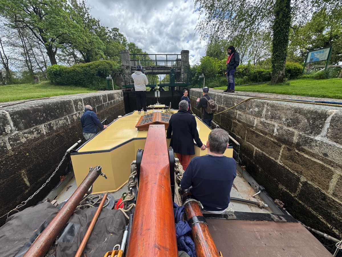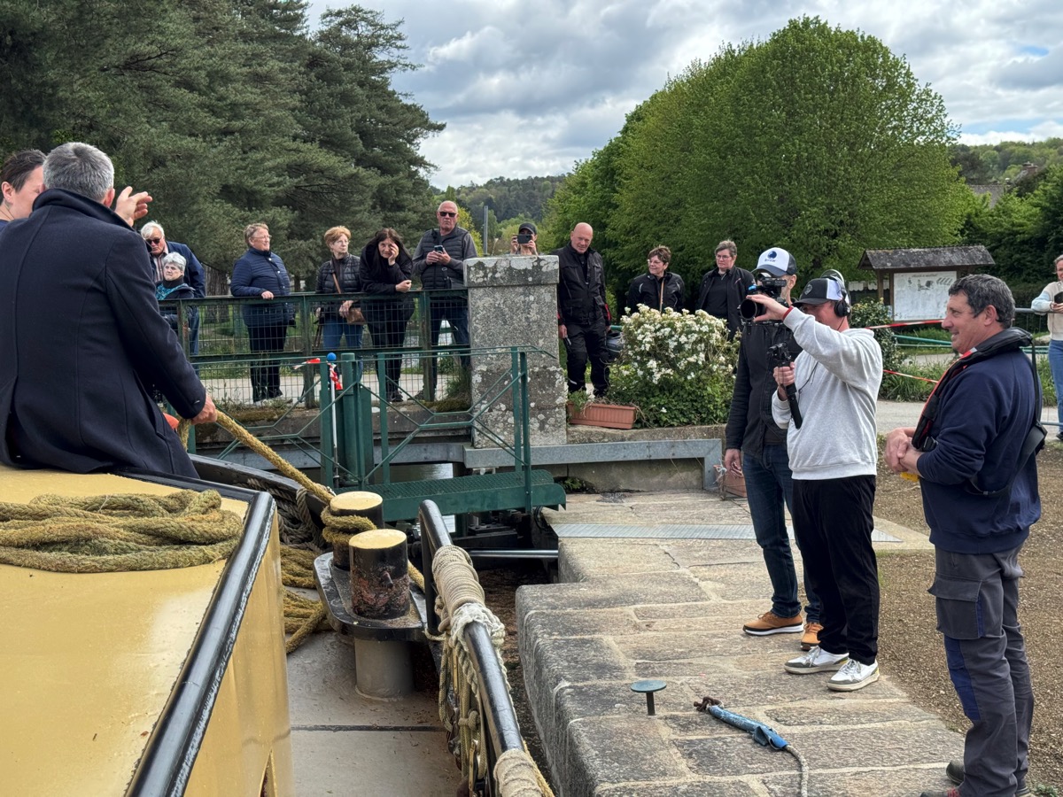 Ce sont donc eux qui ont fait remonter « les Champs Elysées de Malestroit » aux reporters de France Télévision. Une balade bucolique guidée par Anthony Serazin, un comédien qui joue le rôle de fil rouge de ce reportage face aux caméras de France Télévision que nous avons partagé avec eux. Au cours de ce lent voyage l’équipage a passé deux écluses, celle de la Née, point de départ de leur périple et celle de Malestroit qui est la plus profonde du canal.