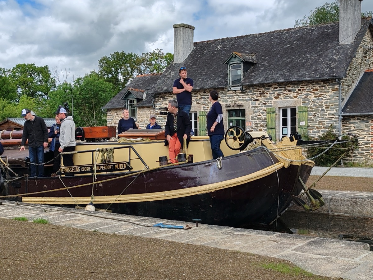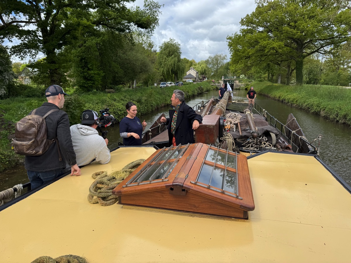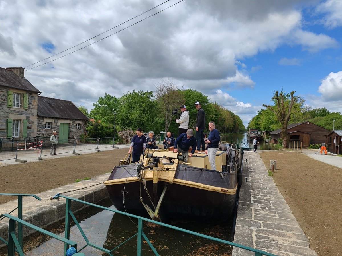 Voilà, c’est « en boite ». L’équipe de France Télévision venue tourner le reportage qui sera diffusé lors de l’émission finale du Village Préféré des Français a quitté Malestroit ce mercredi soir pour aller découvrir un autre village candidat en Normandie. Après avoir exploré toutes les richesses patrimoniales, historiques, culturelles, artisanales, religieuses de la Petite Cité de Caractère, l’équipe a réalisé sa dernière séquence ce mercredi après-midi sur un autre symbole de Malestroit : le canal de Nantes à Brest. Ils sont montés à bord du Verwisseling, un tjalk hollandais amarré près de la maison de la pêche à Malestroit, dont Laura et Tristan Gauthier ont fait leur logement depuis 2021. Les deux jeunes gens ont ramené cet impressionnante péniche à fond plat, capable de naviguer aussi bien sur les canaux qu’en bordure de côte en mer, depuis la Hollande alors que l’on sortait tout juste de la crise du COVID pour mener leur projet de vie. Ils nous avaient alors raconté leur histoire que vous pouvez retrouver en cliquant ici. Et ils ont réussi leur projet. Depuis, l’eau a coulé dans le canal de Nantes à Brest, mais Laura et Tristan sont toujours là et bien intégré. Ils ont même réalisé un 2è projet qui était de créer une association, la Compagnie des Gréements qui organise des animations et dont les activités sont en plein essor.