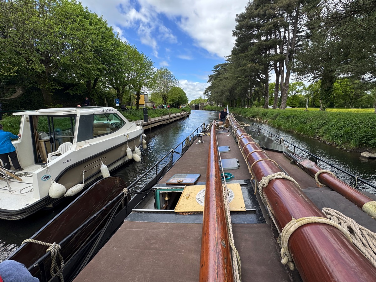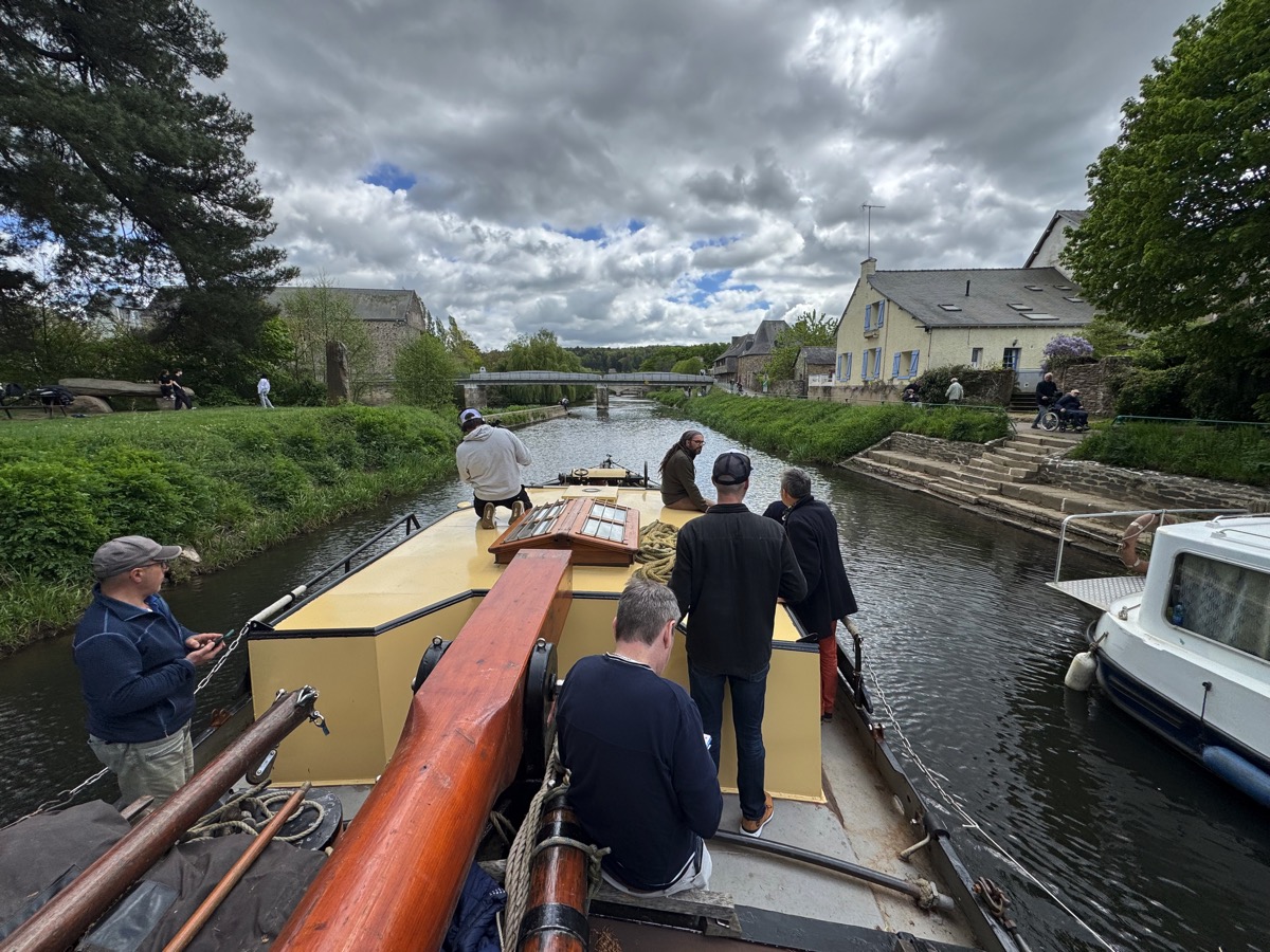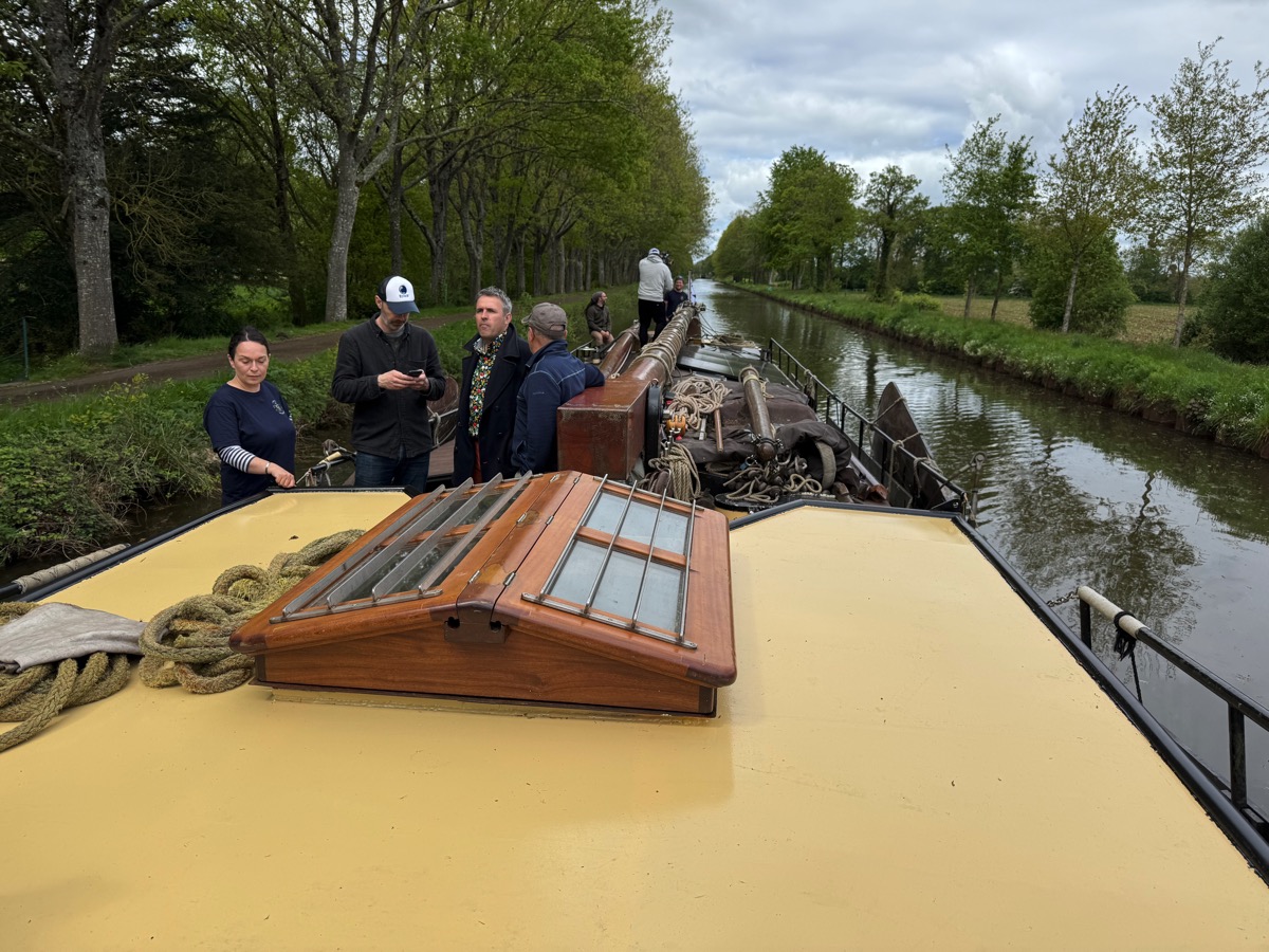 Voilà, c’est « en boite ». L’équipe de France Télévision venue tourner le reportage qui sera diffusé lors de l’émission finale du Village Préféré des Français a quitté Malestroit ce mercredi soir pour aller découvrir un autre village candidat en Normandie. Après avoir exploré toutes les richesses patrimoniales, historiques, culturelles, artisanales, religieuses de la Petite Cité de Caractère, l’équipe a réalisé sa dernière séquence ce mercredi après-midi sur un autre symbole de Malestroit : le canal de Nantes à Brest. Ils sont montés à bord du Verwisseling, un tjalk hollandais amarré près de la maison de la pêche à Malestroit, dont Laura et Tristan Gauthier ont fait leur logement depuis 2021. Les deux jeunes gens ont ramené cet impressionnante péniche à fond plat, capable de naviguer aussi bien sur les canaux qu’en bordure de côte en mer, depuis la Hollande alors que l’on sortait tout juste de la crise du COVID pour mener leur projet de vie. Ils nous avaient alors raconté leur histoire que vous pouvez retrouver en cliquant ici. Et ils ont réussi leur projet. Depuis, l’eau a coulé dans le canal de Nantes à Brest, mais Laura et Tristan sont toujours là et bien intégré. Ils ont même réalisé un 2è projet qui était de créer une association, la Compagnie des Gréements qui organise des animations et dont les activités sont en plein essor.