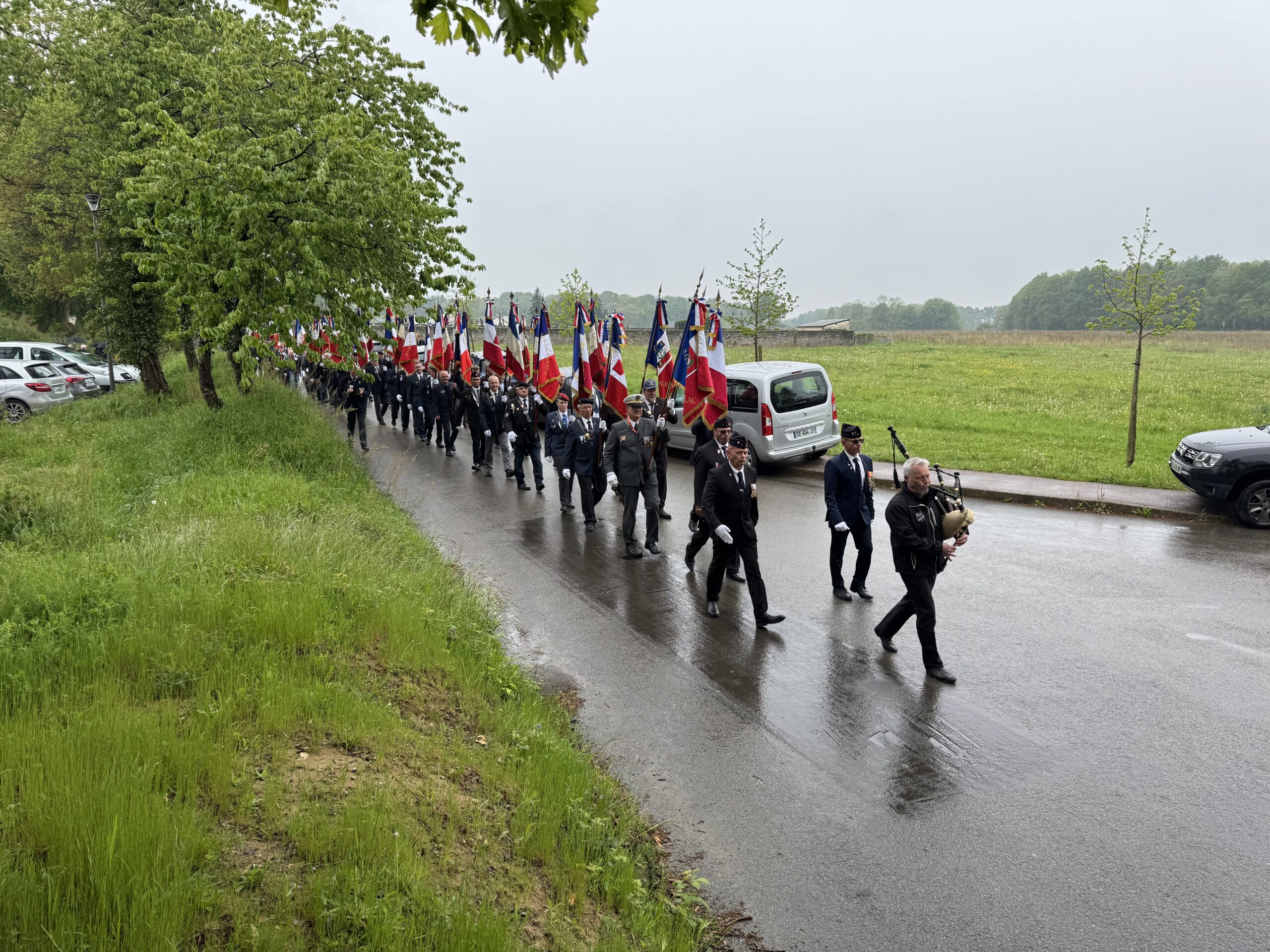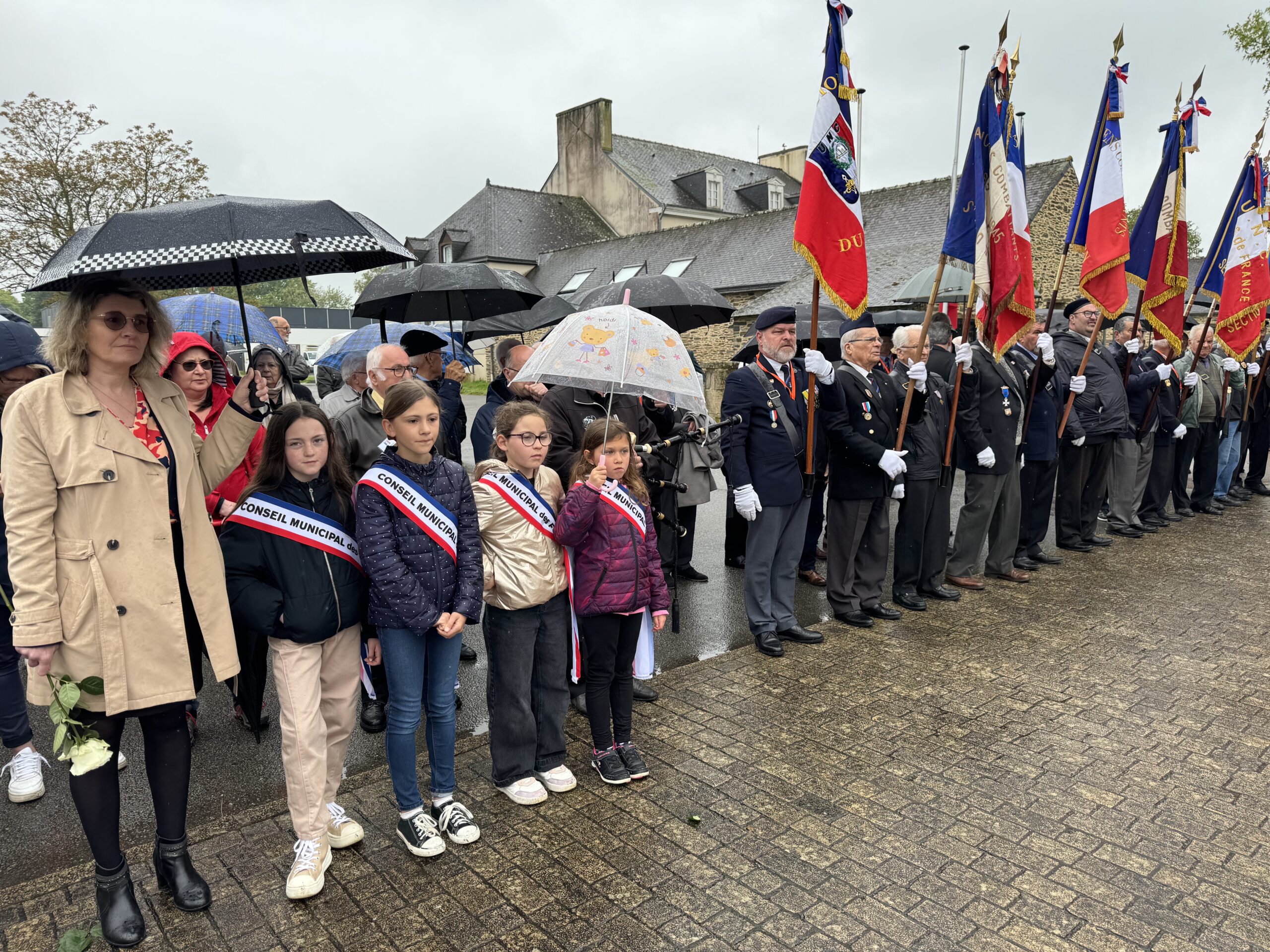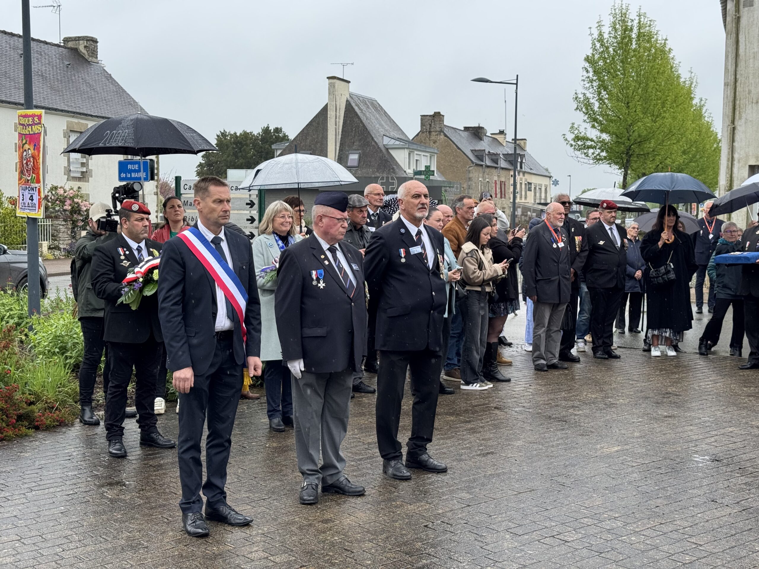 Au niveau départemental, l’UNC compte 2470 adhérents répartis dans 70 associations. Après la réunion et les élections internes à l’UNC, les participants défilent sous une pluie battante, depuis la salle Lénivel jusqu’au monument aux morts de la commune. Le cortège est emmené par le président départemental de l’UNC, Jean-Claude Maillard et le maire de Taupont, Jean-Charles Sentier et Eric Delsaut. Dans le cortège se trouvent également les jeunes élu(e)s du conseil municipal des enfants qui ont participé au dépôt de gerbes et de fleurs.