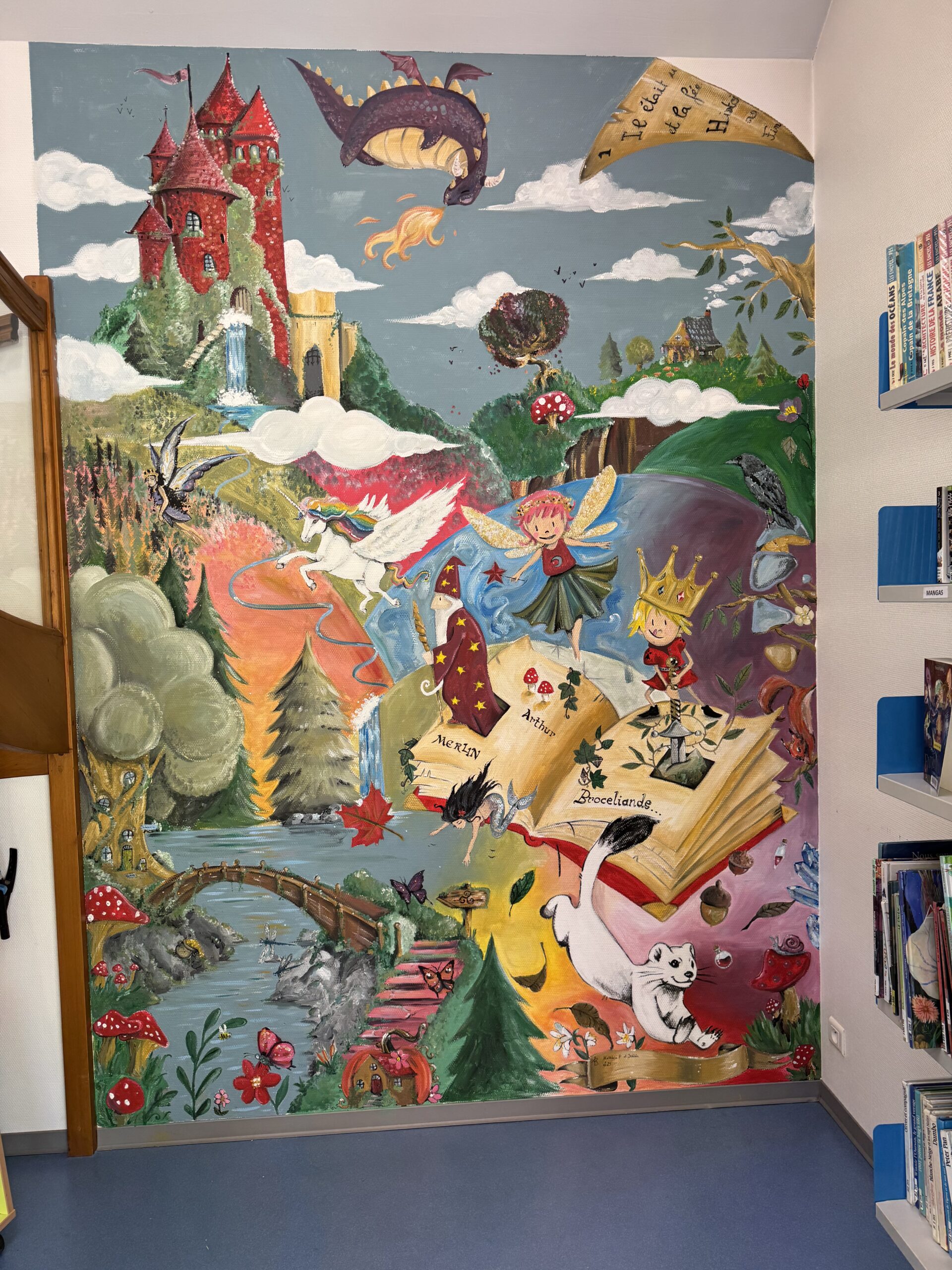 Réaliser une fresque dans la médiathèque municipale… C’est le projet qui figurait dans le programme d’Eloa Lambert, candidate au conseil municipal des jeunes de Saint-Guyomard. En septembre dernier, les élues du CMJ décident de concrétiser ce projet. Encore fallait-il trouver l’artiste susceptible d’aider les jeunes à le mettre en oeuvre. Le bouche-à-oreille a fait son travail. Saint-Guyomard est une commune dynamique qui recèle des talents parmi ses habitants. C’est le cas de Kathleen Peugnet qui n’est pas artiste professionnelle mais cette maman d’élève nourrit depuis sa tendre enfance une passion pour le dessin et l’envie de créer. Les élus du CMJ et Kathleen se sont mis autour de la table pour élaborer le projet. Celui-ci est né d’un mélange des souhaits des jeunes, de l’inspiration créatrice de Kathleen mais aussi des ouvrages de la bibliothèque. Plusieurs semaines de réflexion et d’échanges ont été nécessaires pour qu’enfin la fresque prenne forme. « C’est une première pour moi… », indique Kathleen qui de son vrai métier est aide-soignante. Pendant des journées entières elle a travaillé sur le mur de la médiathèque recevant pendant les vacances scolaires l’aide du conseil des jeunes, mais aussi des usagers de la mairie ou de l’agence postale dont certains ont aussi mis leur grain de sel dans l’élaboration de la fresque.