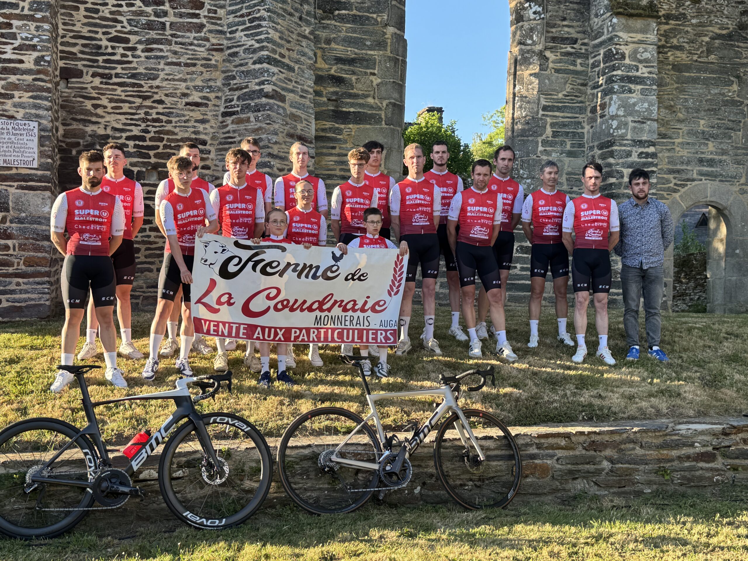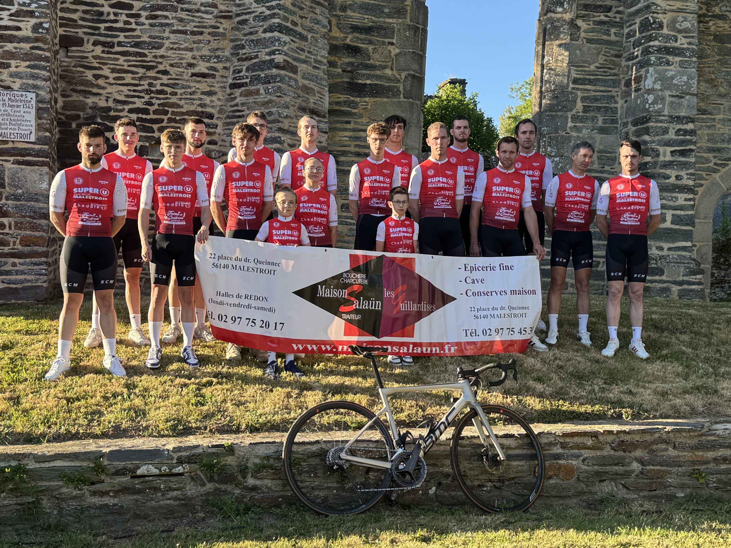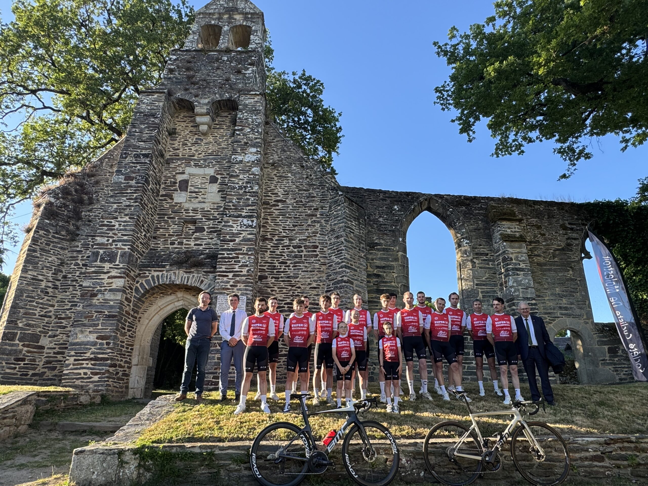 Un évènement soigneusement mis en scène pour la société cycliste de Malestroit qui vient de recevoir ses nouvelles tenues. C’est dans les ruines de la Madeleine que la présentation de ces tenues s’est déroulée, ce vendredi soir, au cours d’un show savamment orchestré par Jean Giguet, commentateur bien connu des courses cyclistes régionales auquel participaient le maire de Malestroit, Bruno Gicquello, le député paul Molac et les sponsors du club. Il faut dire que la conception de ces tenues a donné lieu à un travail de fond et de longue durée au sein de la société que préside Jérome Bihouée. Ce changement devait intervenir en 2026 mais pour répondre à l’impatience des coureurs, le calendrier a été avancé. Mais définir ce qui représentera à la fois un club sportif et à la fois des partenaires financiers, ça ne s’improvise pas. La société cycliste a donc mis en place un groupe de travail de 3 personnes auquel a été adjoint un conseiller technique extérieur, Jérome Tanguy, spécialiste du design. »Il y a eu plein de propositions, beaucoup de discussions parfois très animées. Et finalement on a réussi à trouver un compromis… », explique Jérome Bihouée qui peut compter sur le soutien de plusieurs partenaires : Super U, la ferme de la Coudraie d’Augan; les transports Linevia, les cycles Chedaleux ou bien encore la maison Salaun de Malestroit. Ces derniers ont découvert ce vendredi soir seulement les tenues portées par les coureurs eux-même qui ont été présentés un à un par Jean Giguet. Des tenues que les champions Malestroyens devraient faire briller en compétition. Cette saison, la Société cycliste collectionne déjà 4 victoires chez les seniors et la belle 5è place décrochée à Cruguel par Celian dans la catégorie des U11 laisse espérer de beaux jours pour le club. Il faut dire qu’un gros travail a été fourni pendant l’entrainement hivernal, encadré par Alois Le Breton et Benjamin Lepourreau, avec même un stage d’une semaine en Espagne. Des efforts qui portent leurs fruits. Les cyclistes malestroyens ont notamment à coeur de poursuivre sur cette lancée positive et de porter haut leurs couleurs lors du critérium de Malestroit qui se déroulera le 7 juin prochain avec un départ célébré en plein centre ville puisque le podium sera installé place Queinnec a souligné Bruno Gicquello.