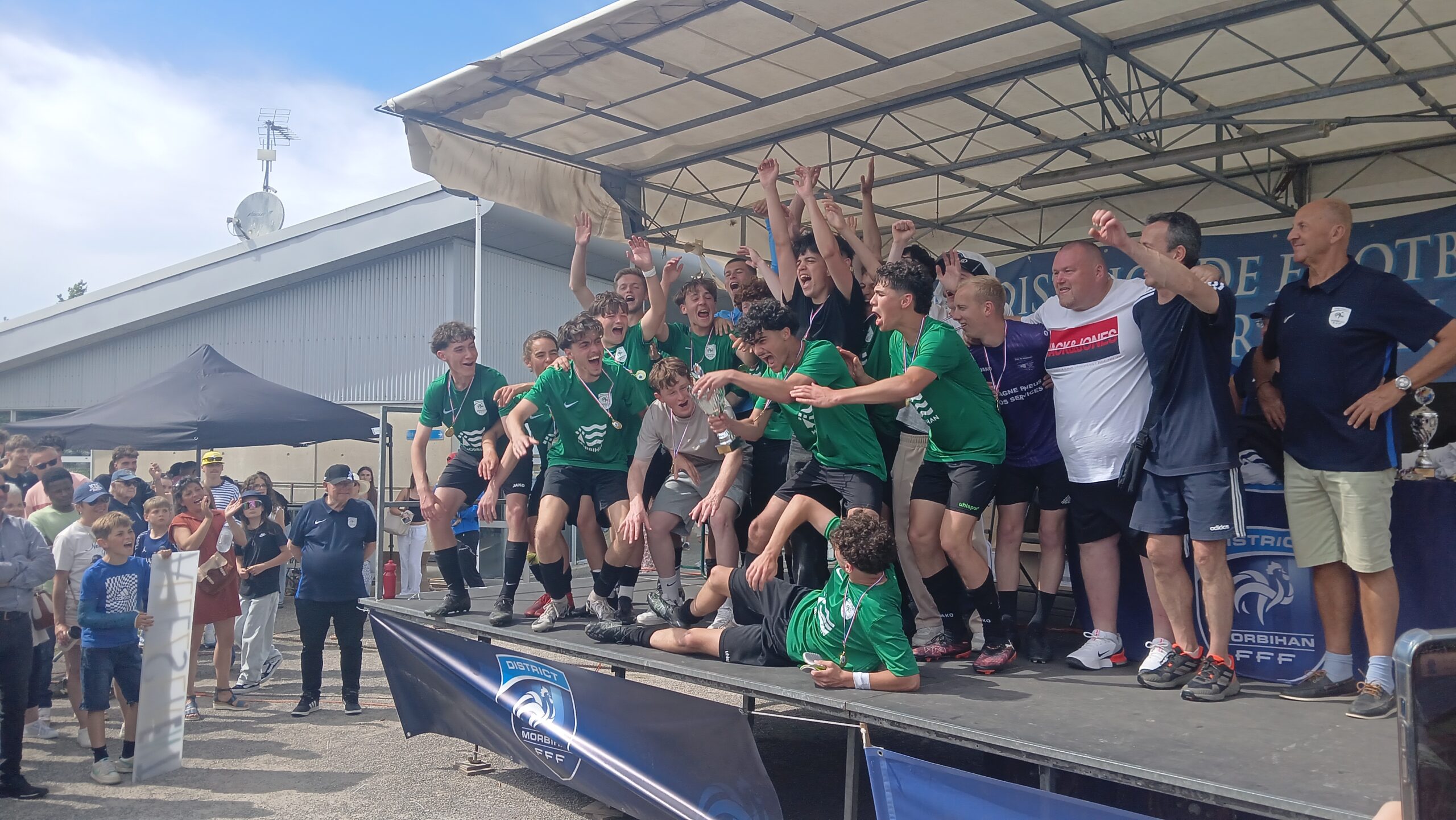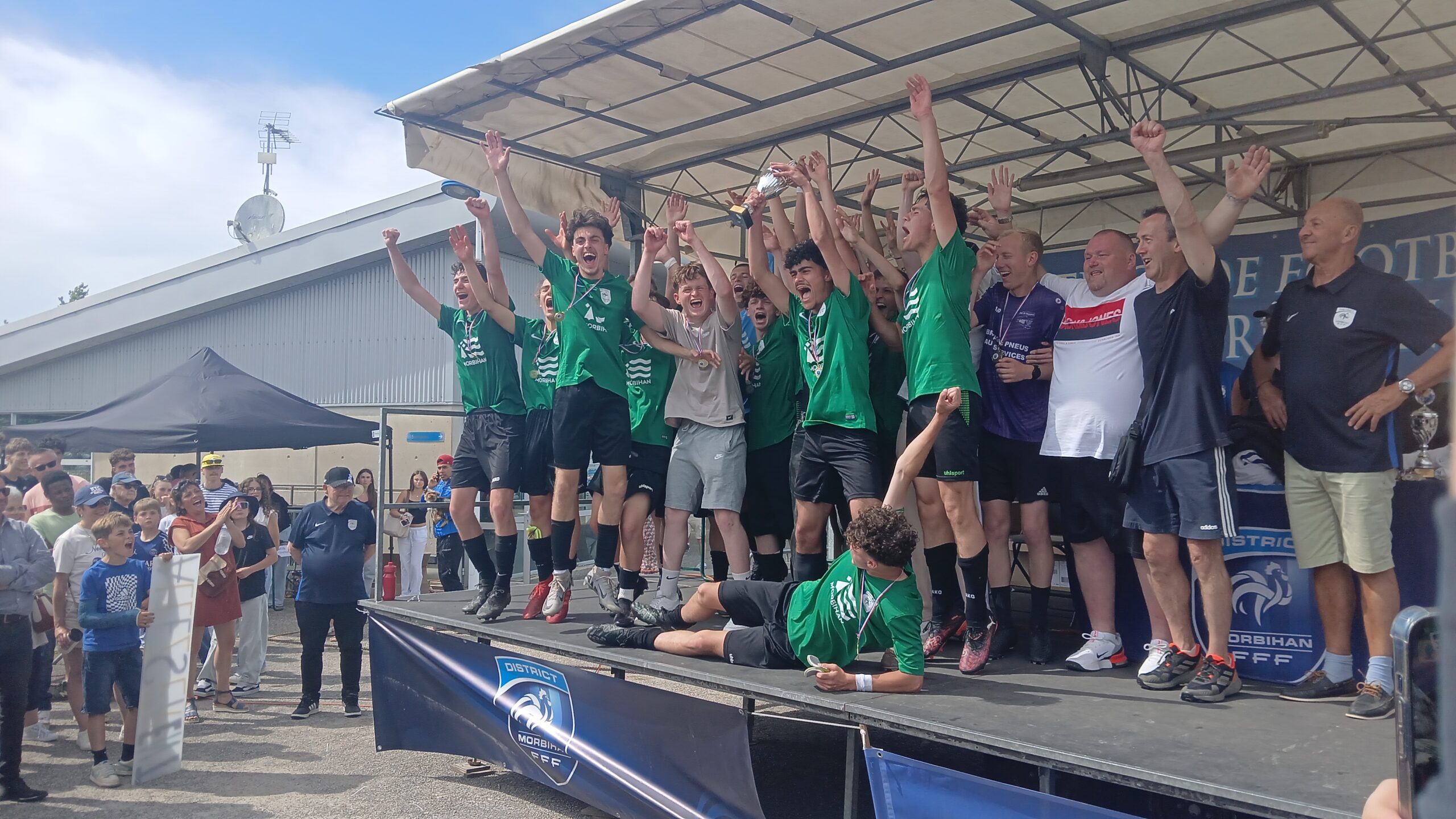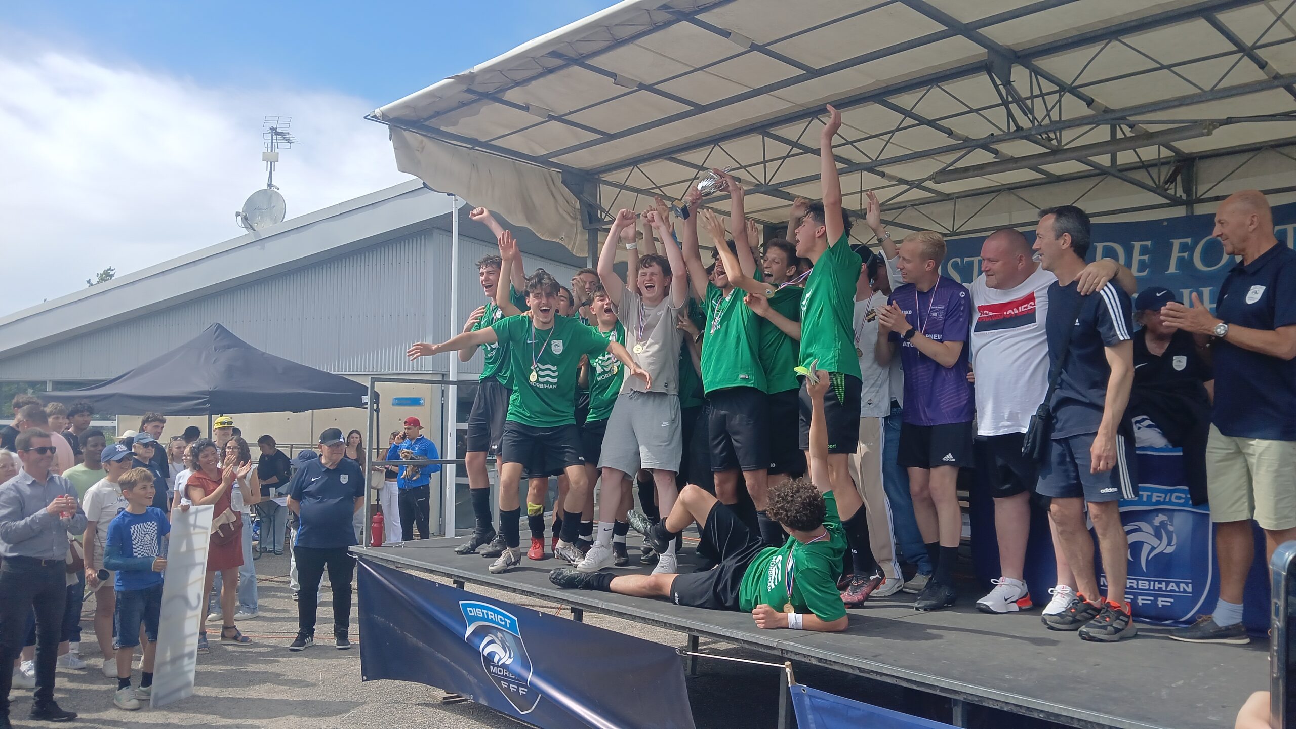 Cette joie a continué jusqu’au podium où ils ont soulevé le trophée de champion du Morbihan devant leurs supporters qui chantaient encore « Allez les verts ». Et dans les vestiaires une joie qui s’est partagée avec les u16 de Séné qui ont eux aussi gagné leur finale.