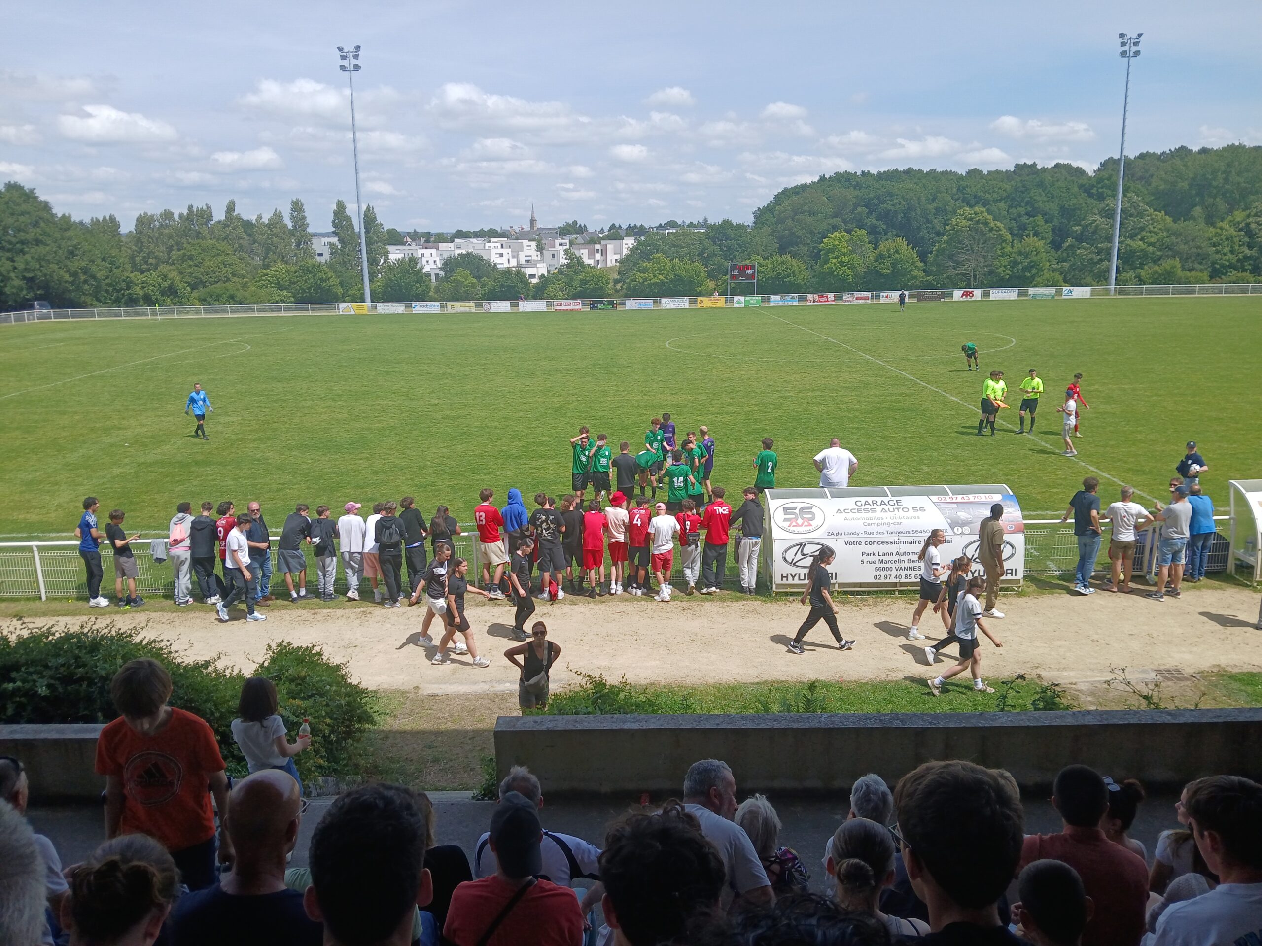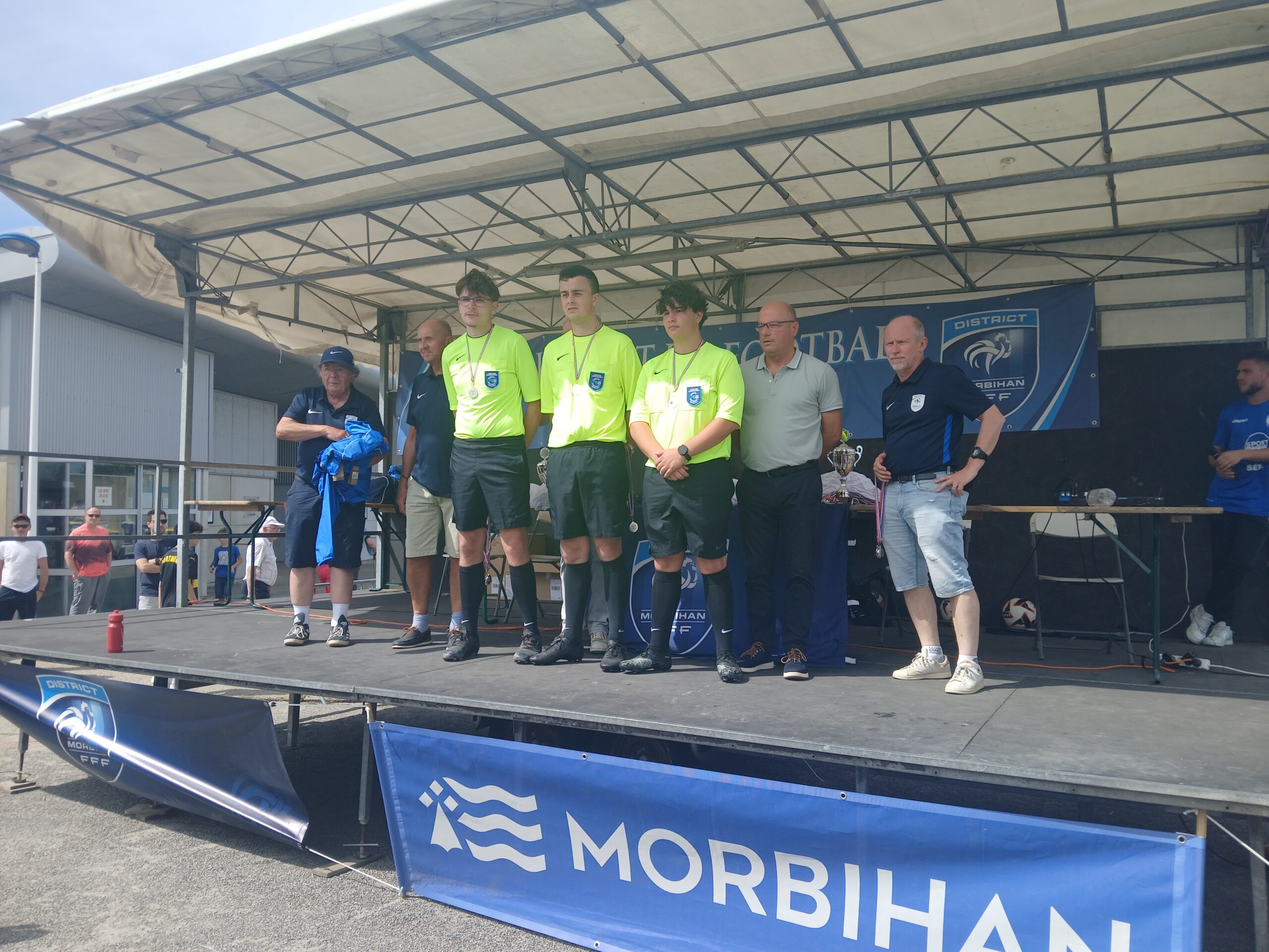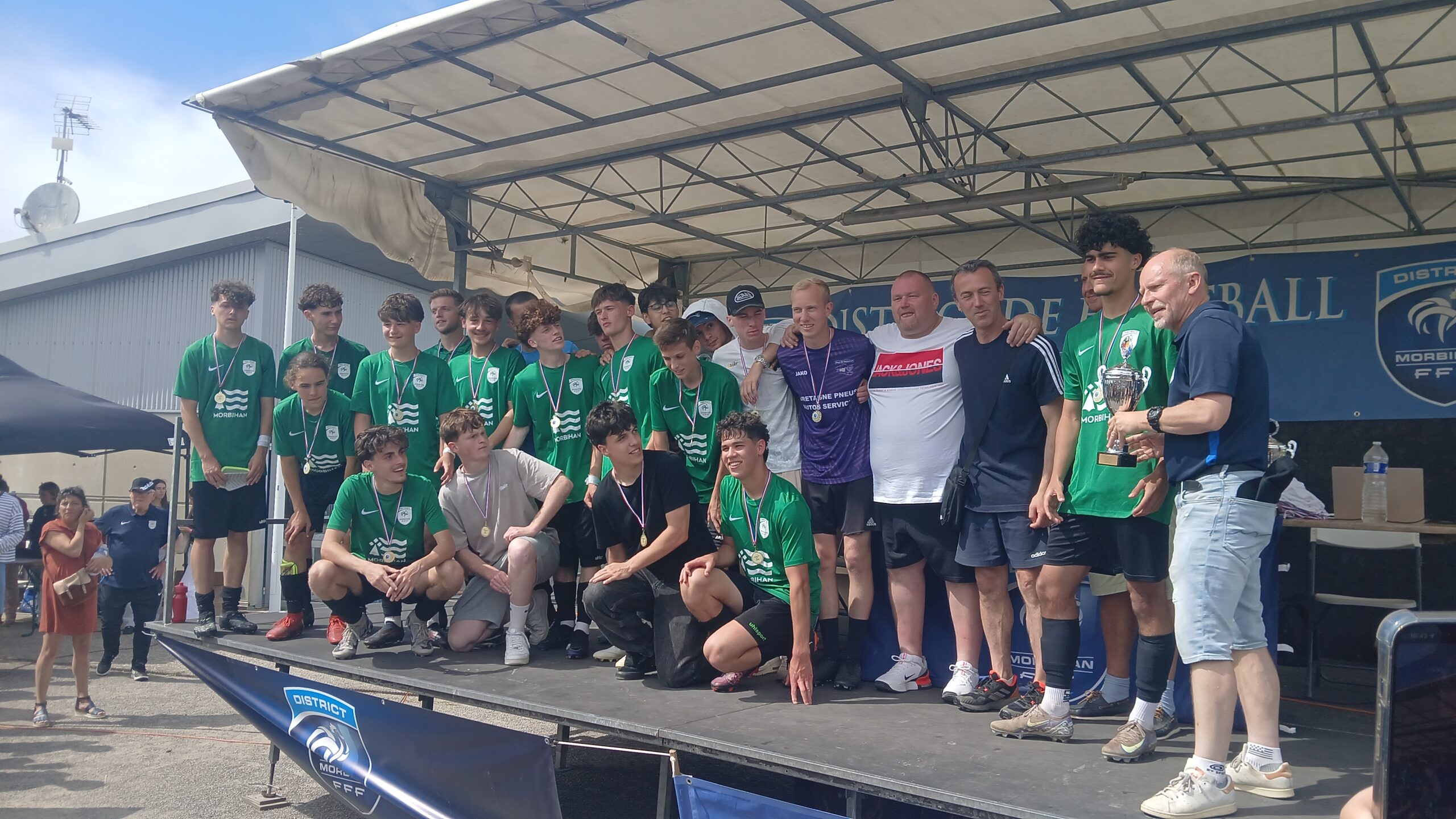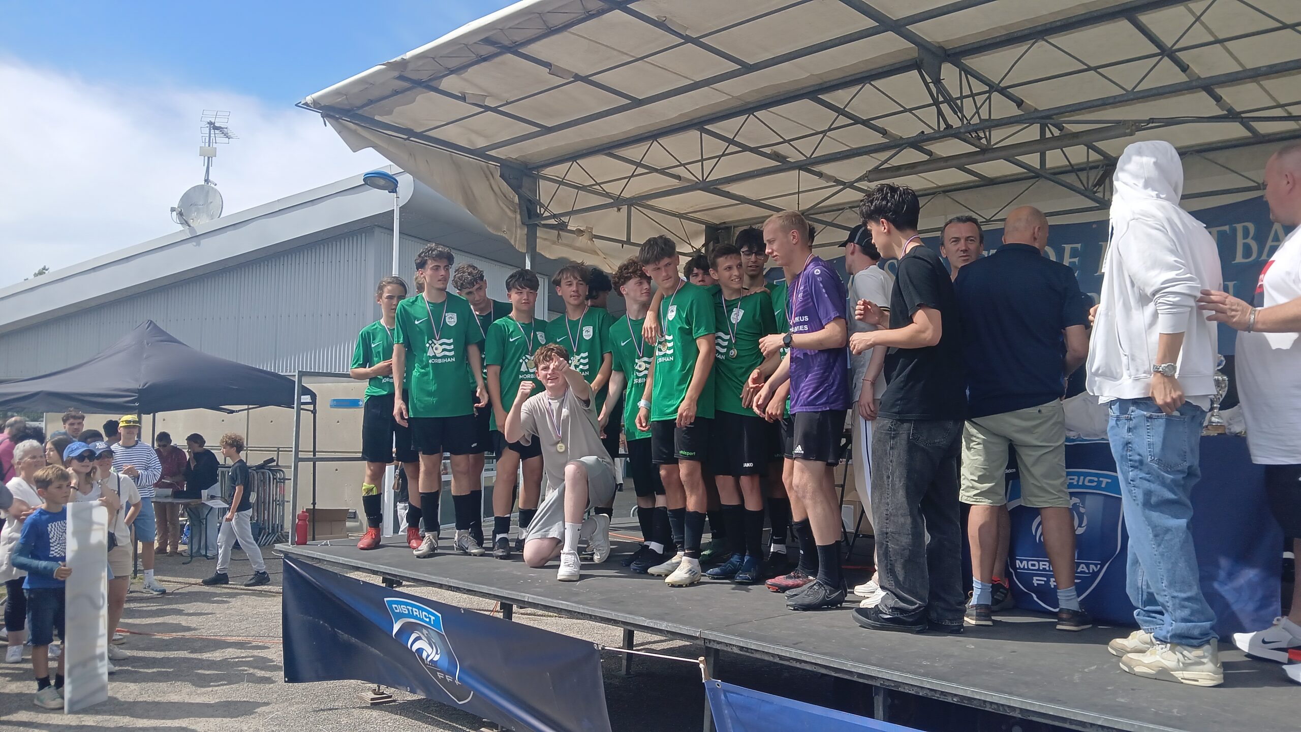 Cette joie a continué jusqu’au podium où ils ont soulevé le trophée de champion du Morbihan devant leurs supporters qui chantaient encore « Allez les verts ». Et dans les vestiaires une joie qui s’est partagée avec les u16 de Séné qui ont eux aussi gagné leur finale.