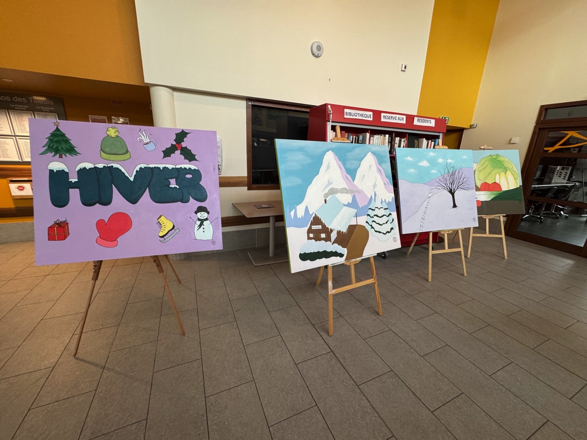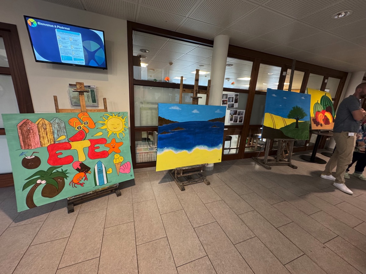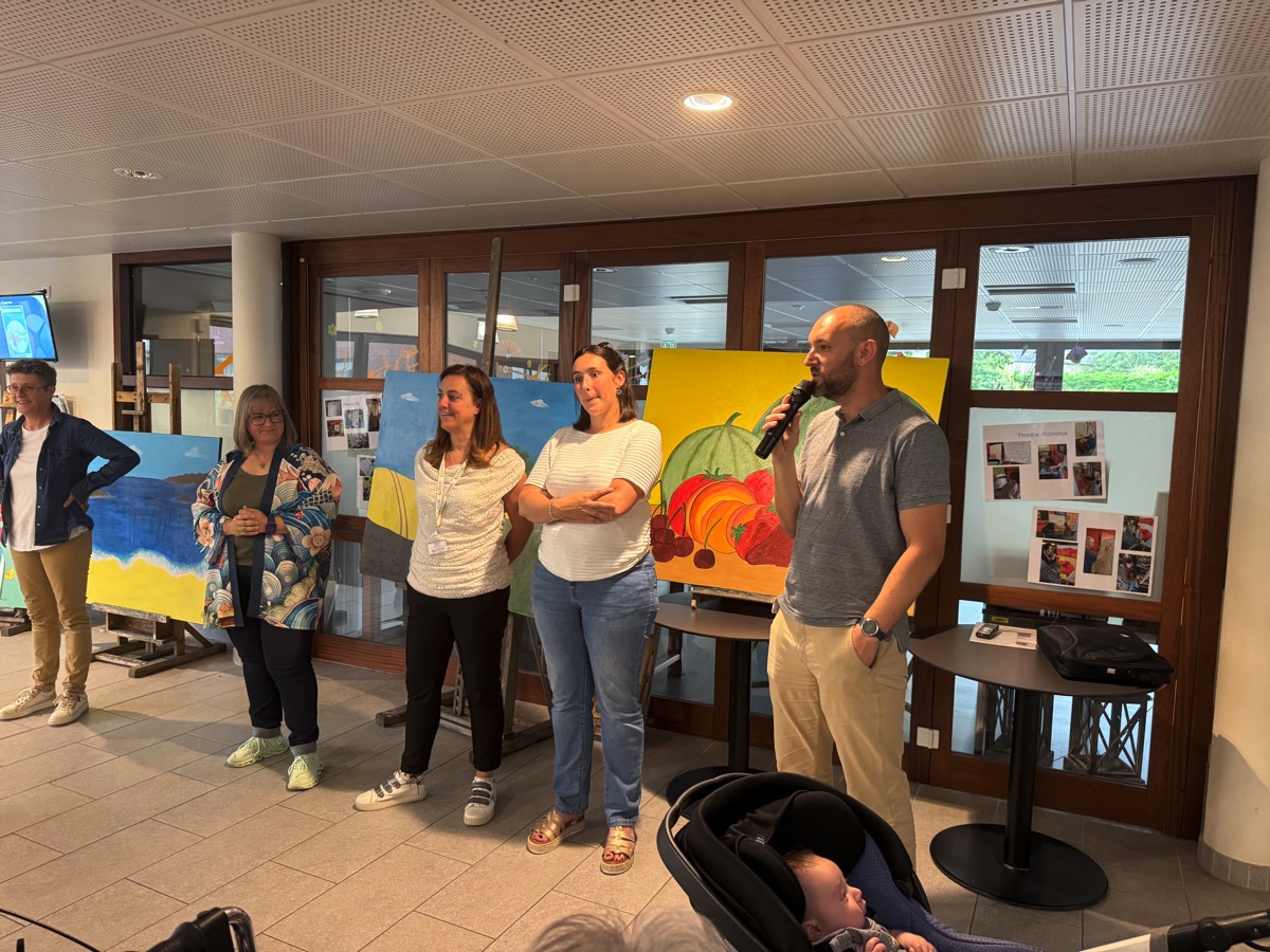 C’est une expérience originale qui vient de s’achever dans les EHPAD de Ploërmel. Vendredi une série de tableaux étaient exposés dans le hall du Clos des Tilleuls. Ils représentent les 4 saisons et ce sont les résidents qui les ont réalisés. Ils ont bien sur reçu les conseils d’une artiste professionnelle, Virginie Gueutal. « Mais moi, je n’ai fait que dessiner… », s’empresse de préciser cette dernière. Pendant un an, Virginie est venue régulièrement, distiller ses conseils aux résidents qui se sont pris au jeu et ont laissé s’exprimer des talents qu’ils ne soupçonnaient peut-être pas. « Je suis venue un peu avant le début de chaque saison et on a travaillé sur ce thème pour poser sur la toile la représentation de la saison à venir », explique Virginie. A chaque séance, 4 toiles grand format ont été réalisées. Celles ci ont été exposées vendredi en début d’après-midi dans le hall d’accueil du Clos des Tilleuls. Lors du vernissage, le directeur de l’EHPAD, Erwan Privat a souligné la qualité du travail accompli et l’intérêt que représente l’accès aux activité culturelles et artistiques. Les trois animatrices de l’établissement, Stéphanie, Béatrice et Claire ont expliqué qu’elles avaient répondu à un appel à projets lancé par le site Famileo, avec pour objectif d’égayer le hall d’accueil. Elles se sont souvenues de Virginie Gueutal, l’artiste qui était venue en stage et ont décidé de faire appel à elle pour mettre en oeuvre ce projet. Mais il manquait une partie du financement que le fonds de dotation Entr’aide d’Armorique a accepté de prendre en charge. Cette association a déjà financé le vélo-pousseur électrique qui équipe depuis deux ans l’EHPAD et qui connait un grand succès auprès des résidents comme l’ont souligné les intervenants. Virginie Gueutal se souvient de « moments de partage » très riches. « Certains d’entre vous n’avaient jamais peint. Vous pouvez être fier de ce que vous avez fait », a-t-elle commenté.