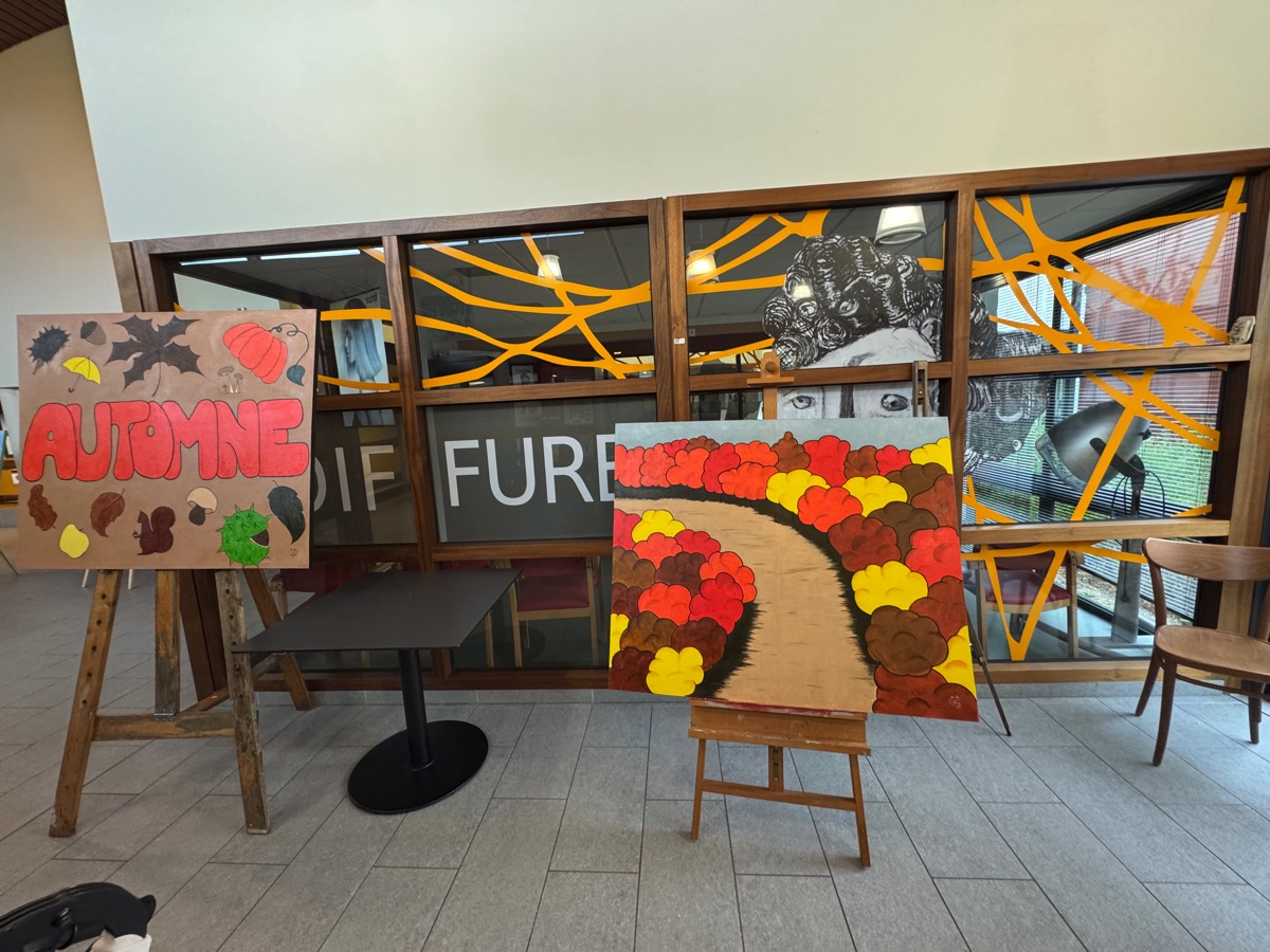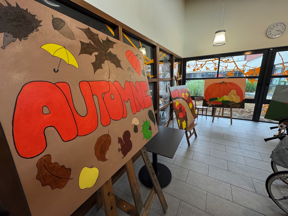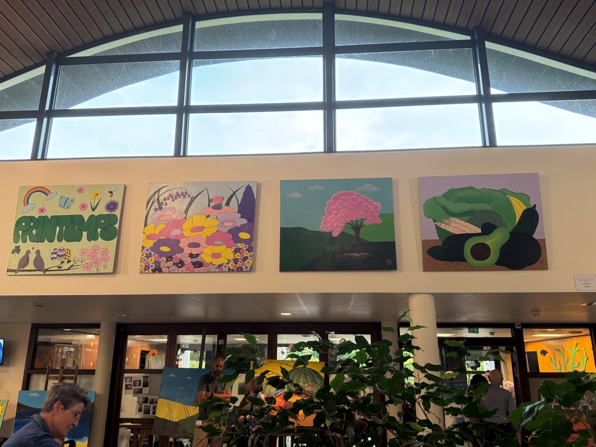 C’est une expérience originale qui vient de s’achever dans les EHPAD de Ploërmel. Vendredi une série de tableaux étaient exposés dans le hall du Clos des Tilleuls. Ils représentent les 4 saisons et ce sont les résidents qui les ont réalisés. Ils ont bien sur reçu les conseils d’une artiste professionnelle, Virginie Gueutal. « Mais moi, je n’ai fait que dessiner… », s’empresse de préciser cette dernière. Pendant un an, Virginie est venue régulièrement, distiller ses conseils aux résidents qui se sont pris au jeu et ont laissé s’exprimer des talents qu’ils ne soupçonnaient peut-être pas. « Je suis venue un peu avant le début de chaque saison et on a travaillé sur ce thème pour poser sur la toile la représentation de la saison à venir », explique Virginie. A chaque séance, 4 toiles grand format ont été réalisées. Celles ci ont été exposées vendredi en début d’après-midi dans le hall d’accueil du Clos des Tilleuls. Lors du vernissage, le directeur de l’EHPAD, Erwan Privat a souligné la qualité du travail accompli et l’intérêt que représente l’accès aux activité culturelles et artistiques. Les trois animatrices de l’établissement, Stéphanie, Béatrice et Claire ont expliqué qu’elles avaient répondu à un appel à projets lancé par le site Famileo, avec pour objectif d’égayer le hall d’accueil. Elles se sont souvenues de Virginie Gueutal, l’artiste qui était venue en stage et ont décidé de faire appel à elle pour mettre en oeuvre ce projet. Mais il manquait une partie du financement que le fonds de dotation Entr’aide d’Armorique a accepté de prendre en charge. Cette association a déjà financé le vélo-pousseur électrique qui équipe depuis deux ans l’EHPAD et qui connait un grand succès auprès des résidents comme l’ont souligné les intervenants. Virginie Gueutal se souvient de « moments de partage » très riches. « Certains d’entre vous n’avaient jamais peint. Vous pouvez être fier de ce que vous avez fait », a-t-elle commenté.