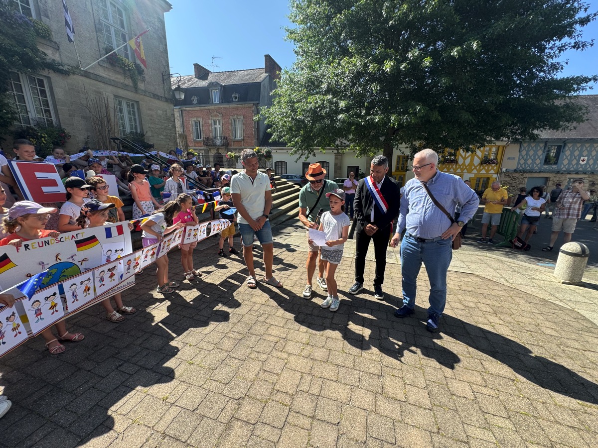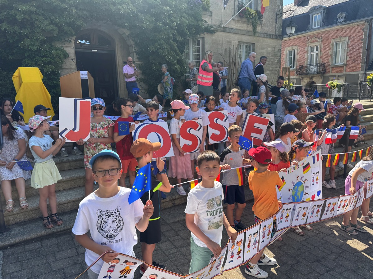 Une délégation de 28 habitants de la commune allemande d’Alzey est accueillie en ce moment à Josselin. Conduit par le maire d’Alzey, le groupe a reçu un accueil exceptionnel ce jeudi matin. De la part du maire, Nicolas Jagoudet, accompagné de Jack Noël, élu en charge des jumelages. Mais ce sont les élèves de l’école Notre dame du Roncier qui ont assuré le spectacle. Ils avaient préparé en classe des banderolles mais aussi des panneaux qui, brandis à bout de bras, formaient les noms des deux communes : Alzey-Josselin. Une jeune élève a même expliqué le sens de ce travail devant les personnalités et souhaité un bon séjour aux habitants d’Alzey. Après les discours officiels, les deux maires, Nicolas Jagoudet pour Josselin et Steffen Junge pour Alzey, ont symboliquement dévoilé une plaque commémorant cet évènement qui sera prochainement installée place d’Alzey.