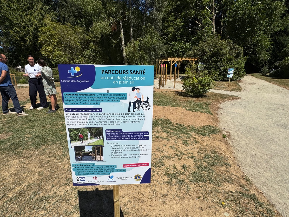 Et ce n’est pas tout puisque la clinique des Augustines a également décroché une autre habilitation, celle de « Maison sport-santé ». Une spécificité qu’illustre l’inauguration ce jeudi matin, parallèlement au scanner, d’un parcours de santé réalisé en partenariat avec le Lycée Professionnel Saint-Joseph à Vannes. Les élèves ont en effet crée les agrés de ce parcours qui se situe dans les jardins de la clinique, alors que l’entreprise adaptée CEM 56 de Ploërmel, impliquant des travailleurs en situation de handicap, en a effectué les travaux d’aménagement et paysagés. Ce parcours santé a été pensé pour permettre une rééducation en conditions réelles, en plein air, quel que soit l’âge ou niveau de mobilité du patient. À travers plusieurs modules adaptés, il est possible de travailler la coordination, l’équilibre ou encore la mémoire. Cet aménagement prolonge diverses initiatives prises par la clinique pour promouvoir une santé préventive, accessible à tous. Car son accès n’est pas réservé aux patients de la clinique, il est ouvert aussi aux personnes de l’extérieur.