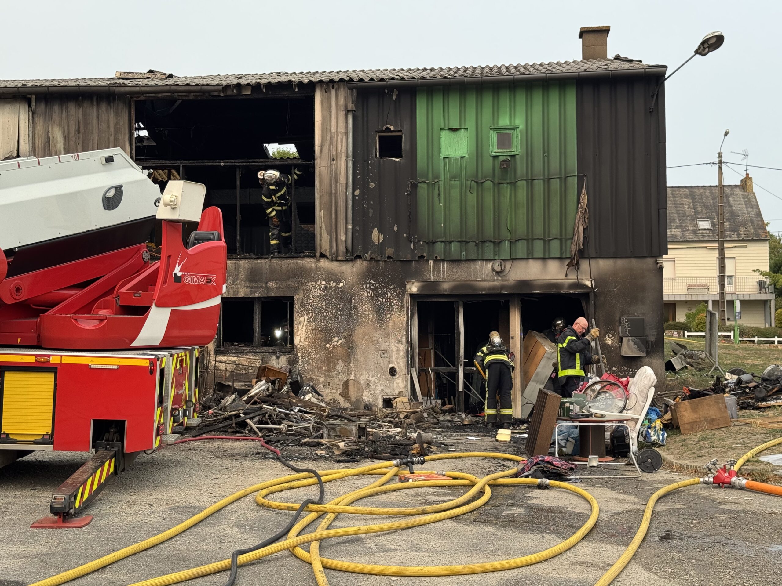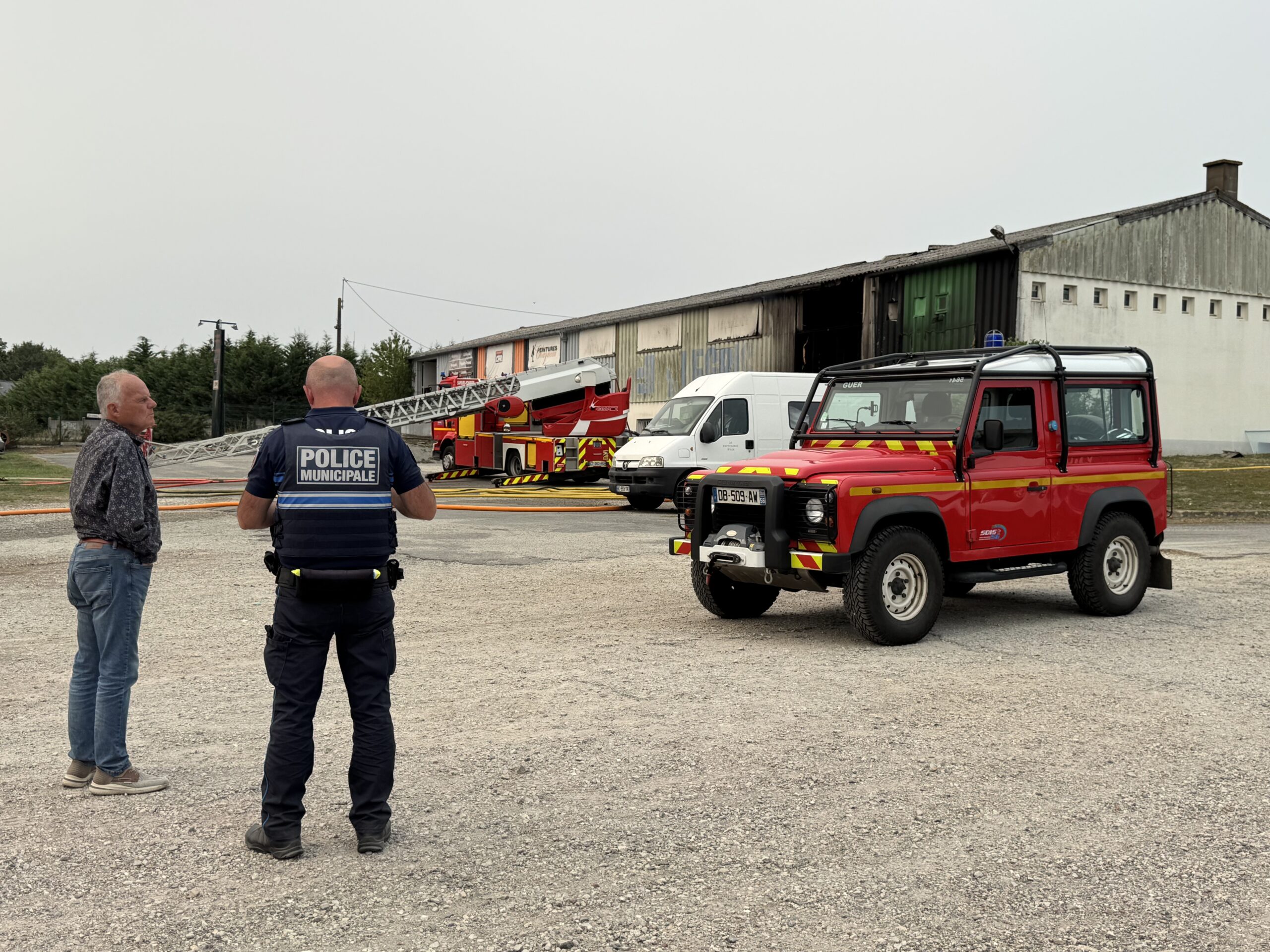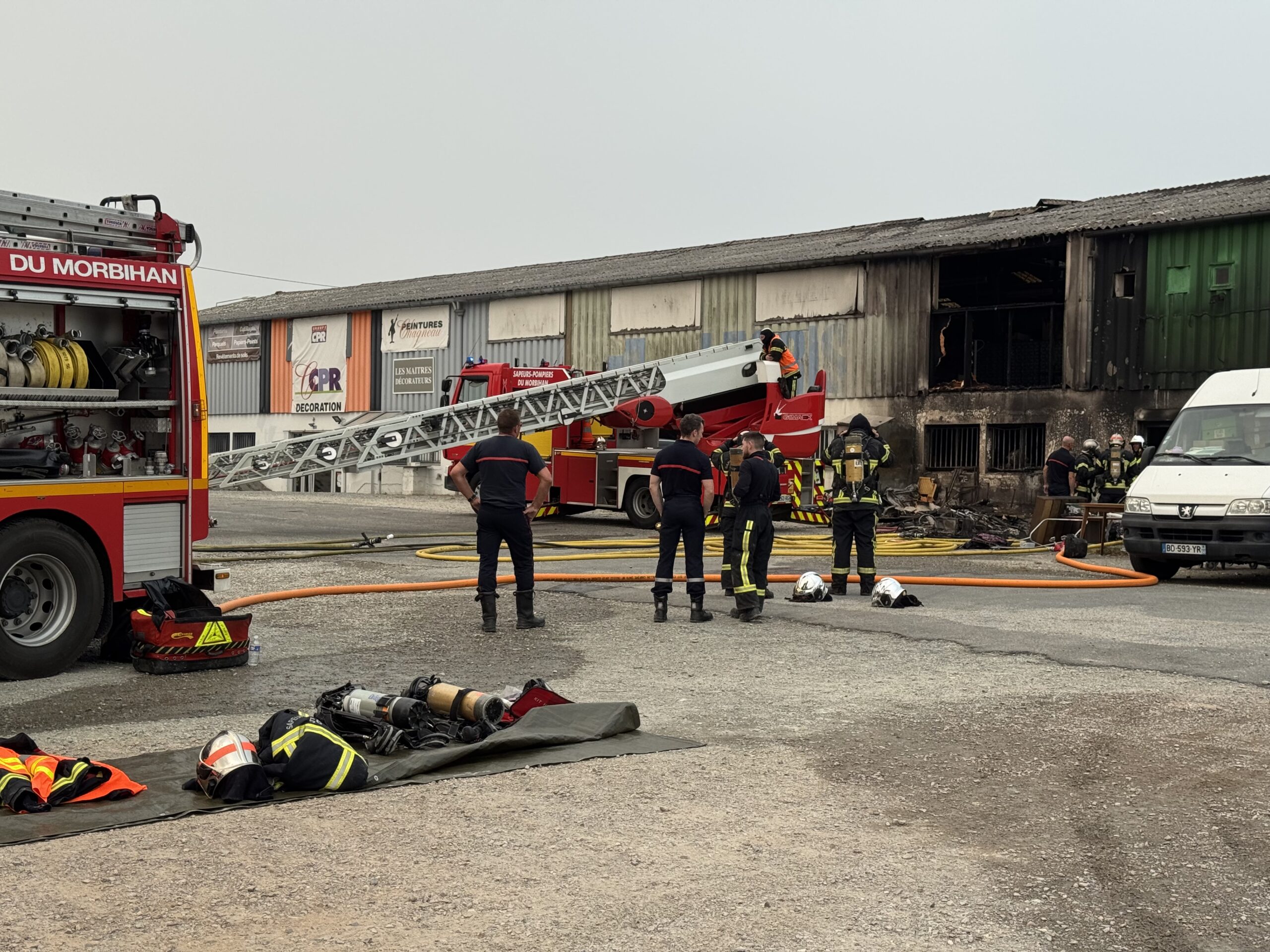 Un violent incendie a éclaté ce samedi 16 août vers 13 heures, dans le bâtiment appartenant à la communauté de communes dans le quartier Saint-Marc à Guer. Ce local d’une superficie de 600 m2 environ abrite une ressourcerie, le local des Restos du Coeur de Guer, mais aussi un entrepôt vente de peintures. L’intervention des pompiers a été très rapide et massive. Huit engins dont une nacelle et une vingtaine de pompiers venus des centres de Guer, Ploërmel, Campénéac, Molac, Malestroit et Plélan le Grand ont été engagés sur ce feu à haut risque. Ils ont mis trois lances en action pour enrayer le plus vite possible l’extension des flammes. Une intervention qui a notamment permis d’éviter la propagation au magasin de peinture. C’est la partie ressourcerie qui a subi les dégâts les plus importants et une centaine de mètres carrés ont été détruits. Environ 70 m2 du local des Restos du Coeur ont également subi des dommages. Un long travail de déblaiement a commencé.
