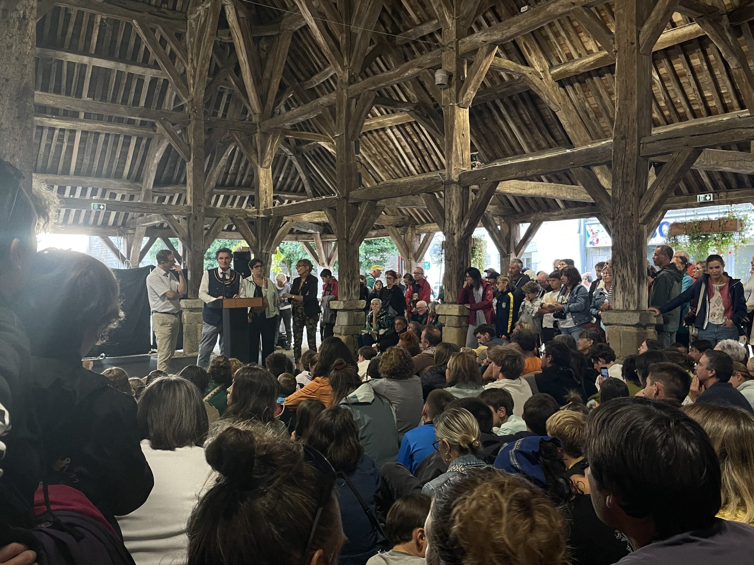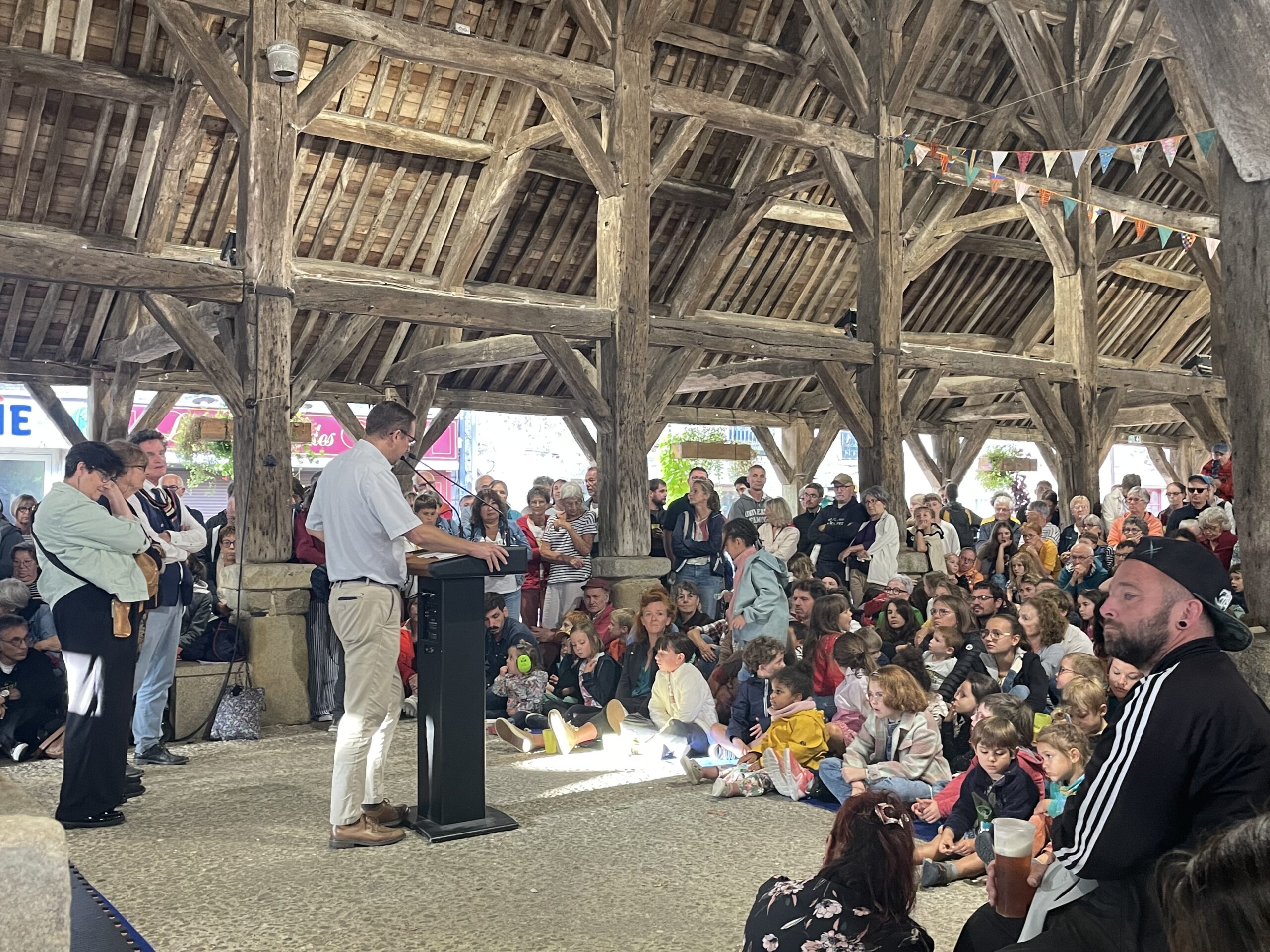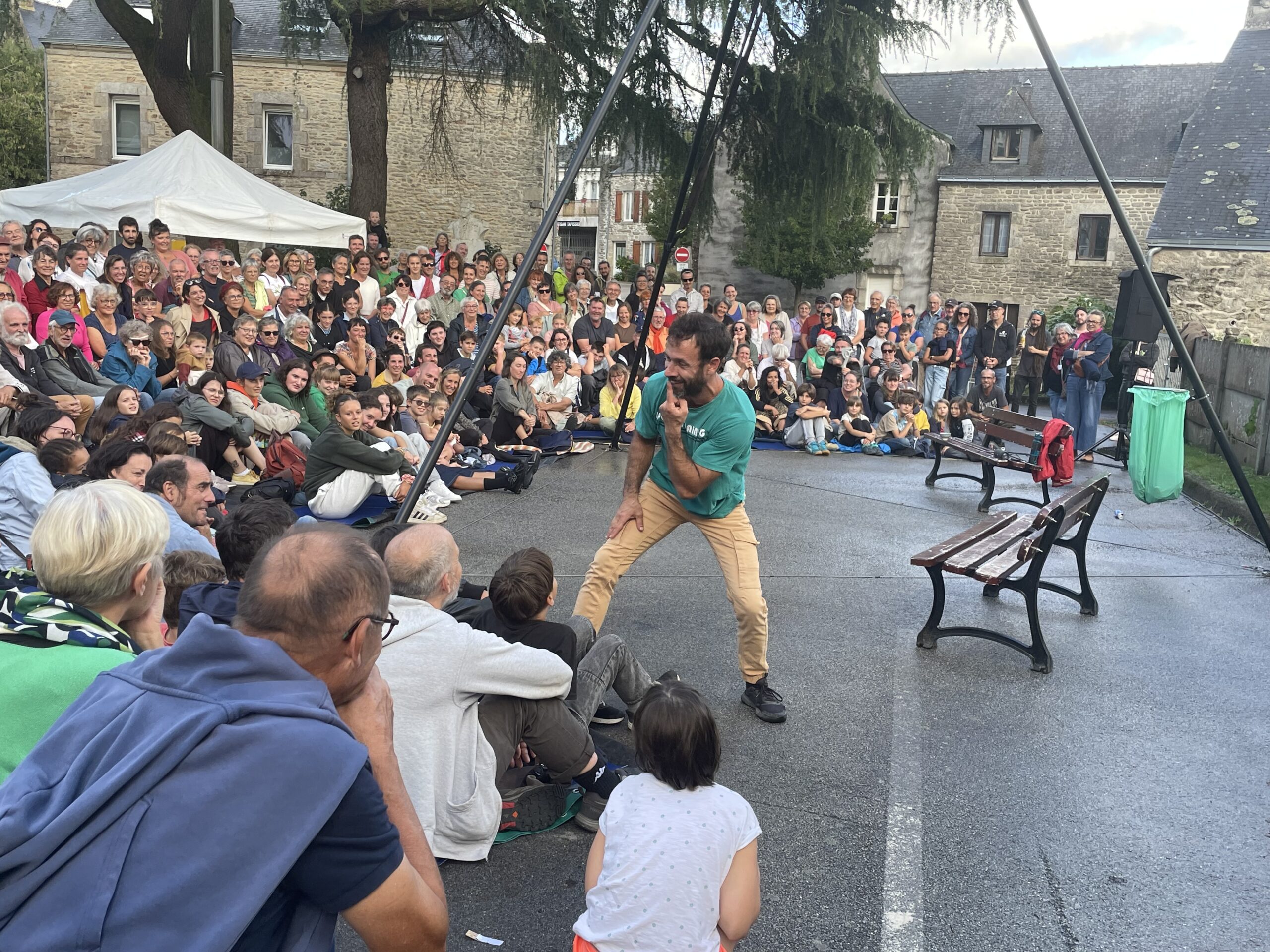 « Il pleut, on va pas le faire. Il pleut, on va le faire », résume Boris Le Maire, maire de Questembert dans sa prise de parole. La munipalité a finalement pris le parti pris de maintenir le festival quoiqu’il en pleuve! Ce choix souligne l’engagement de l’équipe municipale et bénévole dans la volonté de proposer « une fête partagée, gratuite quand elle le peut », indique le maire. Dans le spectacle de 18h, l’intervenant de la compagnie La Dépliante évoquait le rôle crucial du monde associatif dans son métier. Ici c’est la municipalité, accompagnée par les associations locales qui organise.