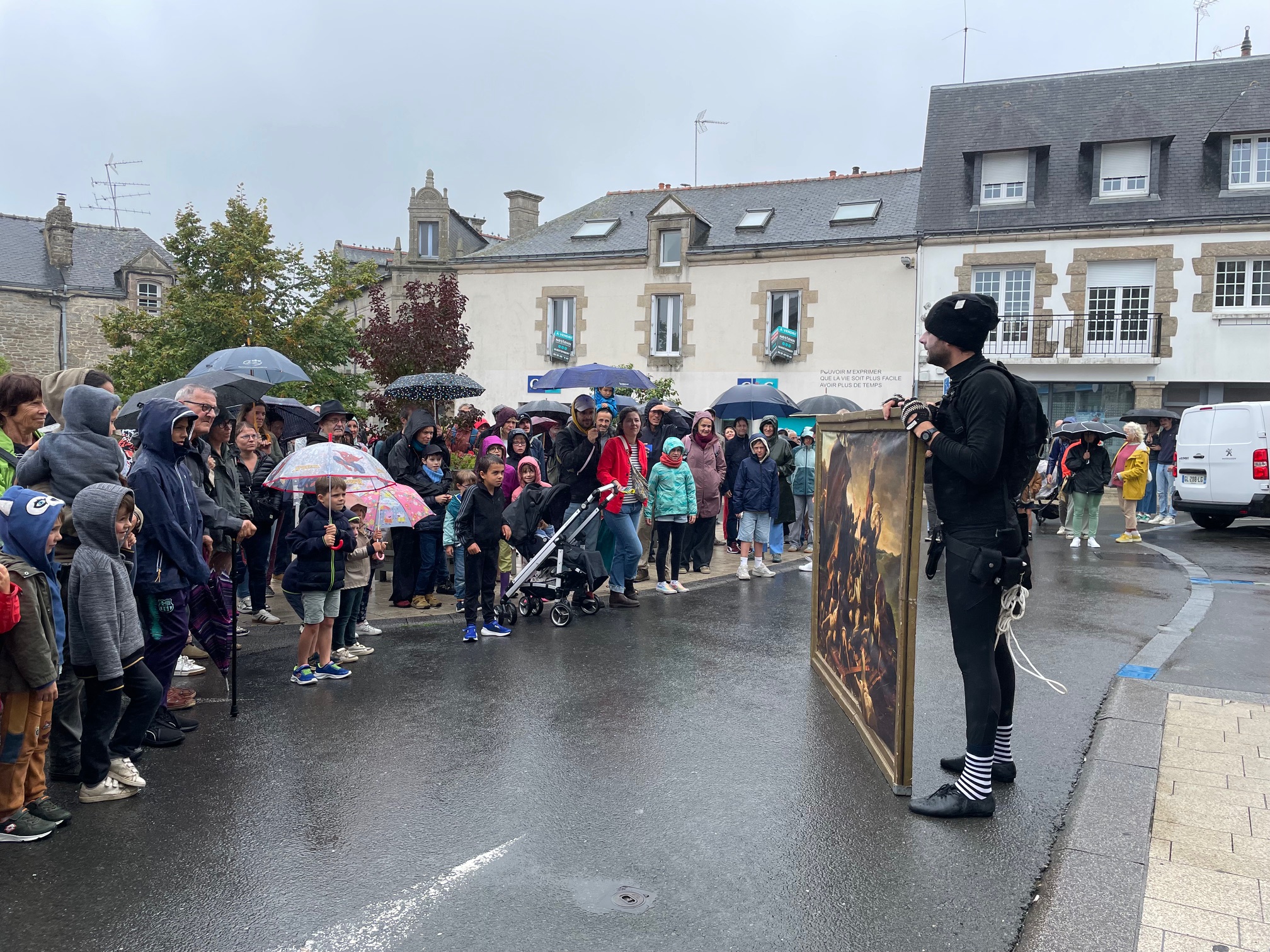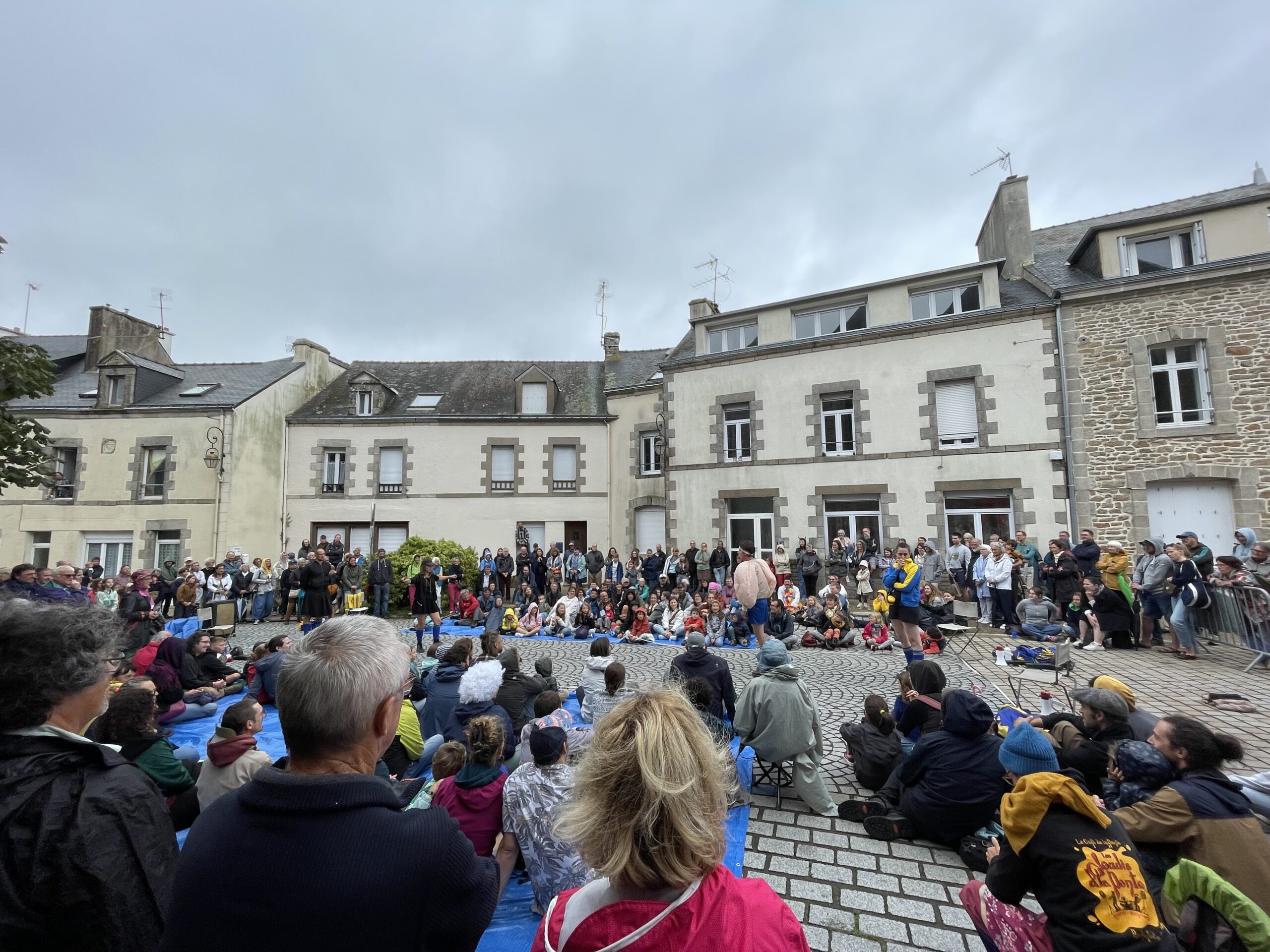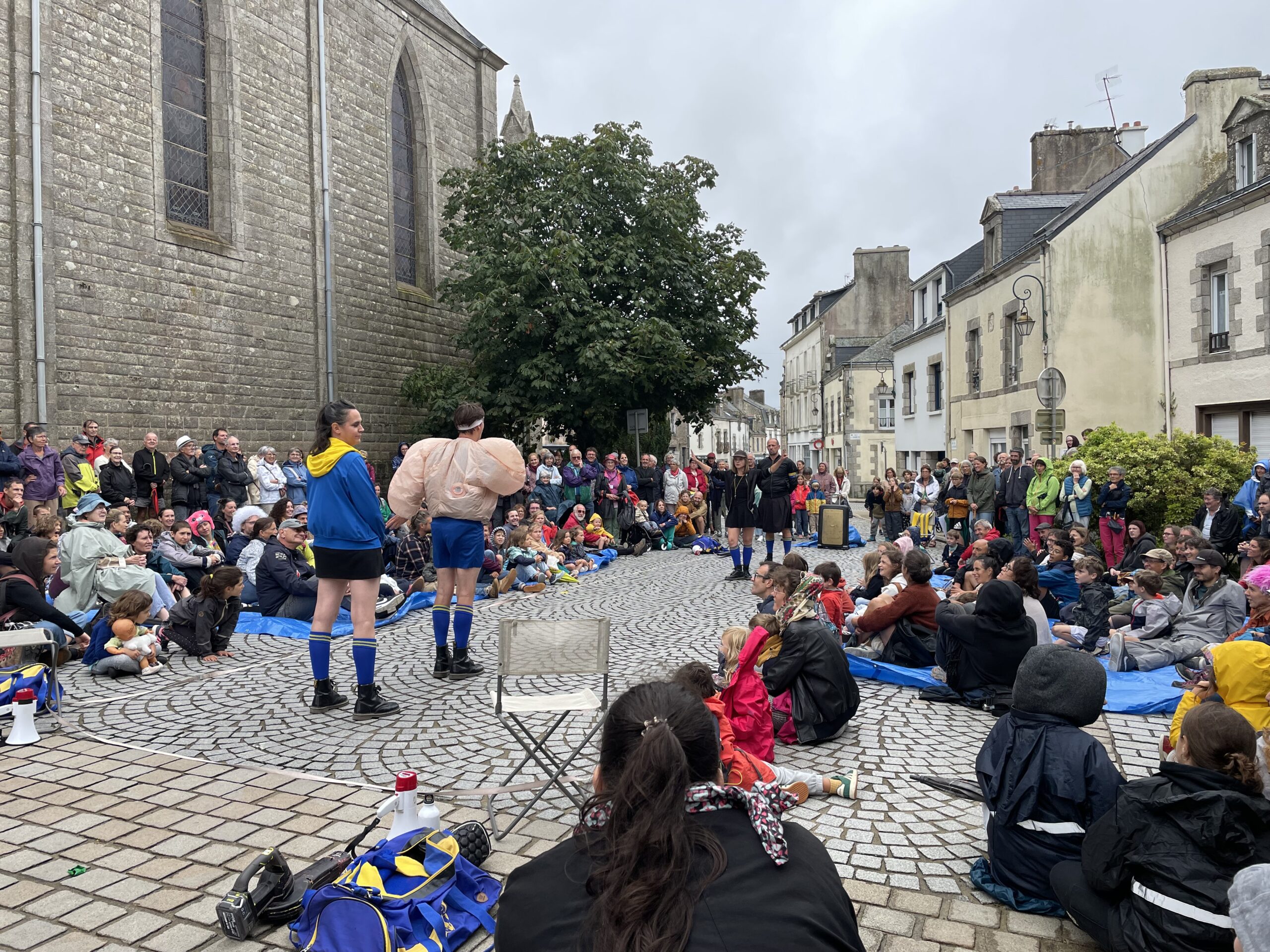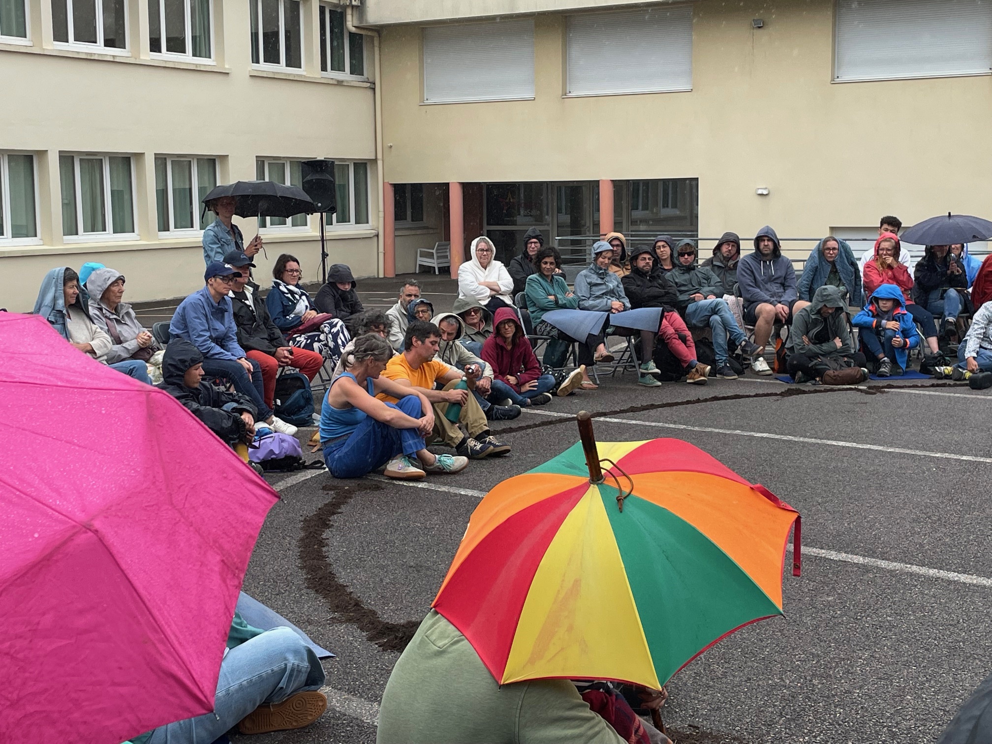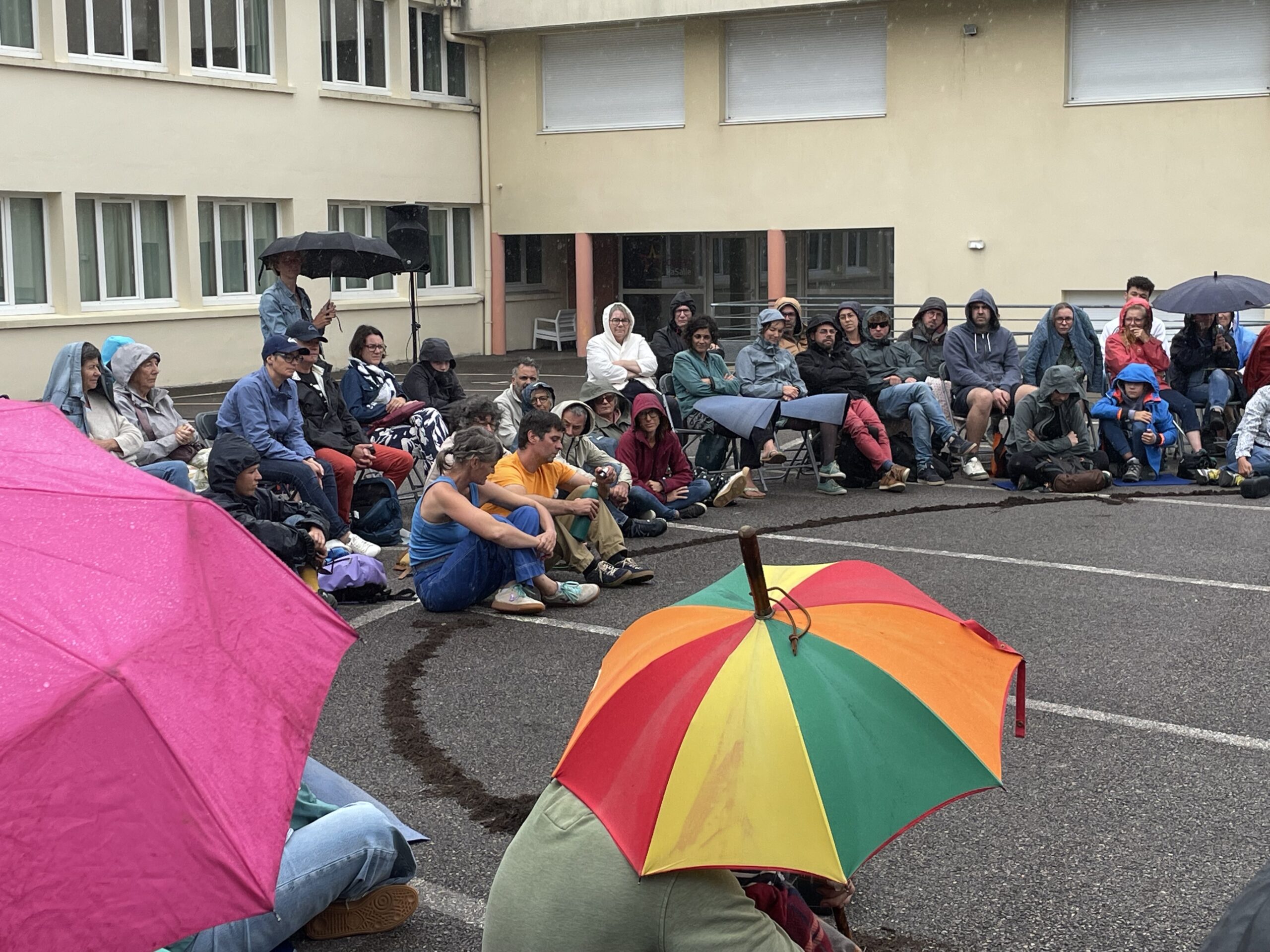 Des bâches étaient disposées par les bénévoles pour que les spectateurs puissent s’assoir par terre… et pour les intervenants, pas d’autre choix que d’être mouillés. Faire face aux aléas climatiques, c’est aussi ça l’art de la rue!