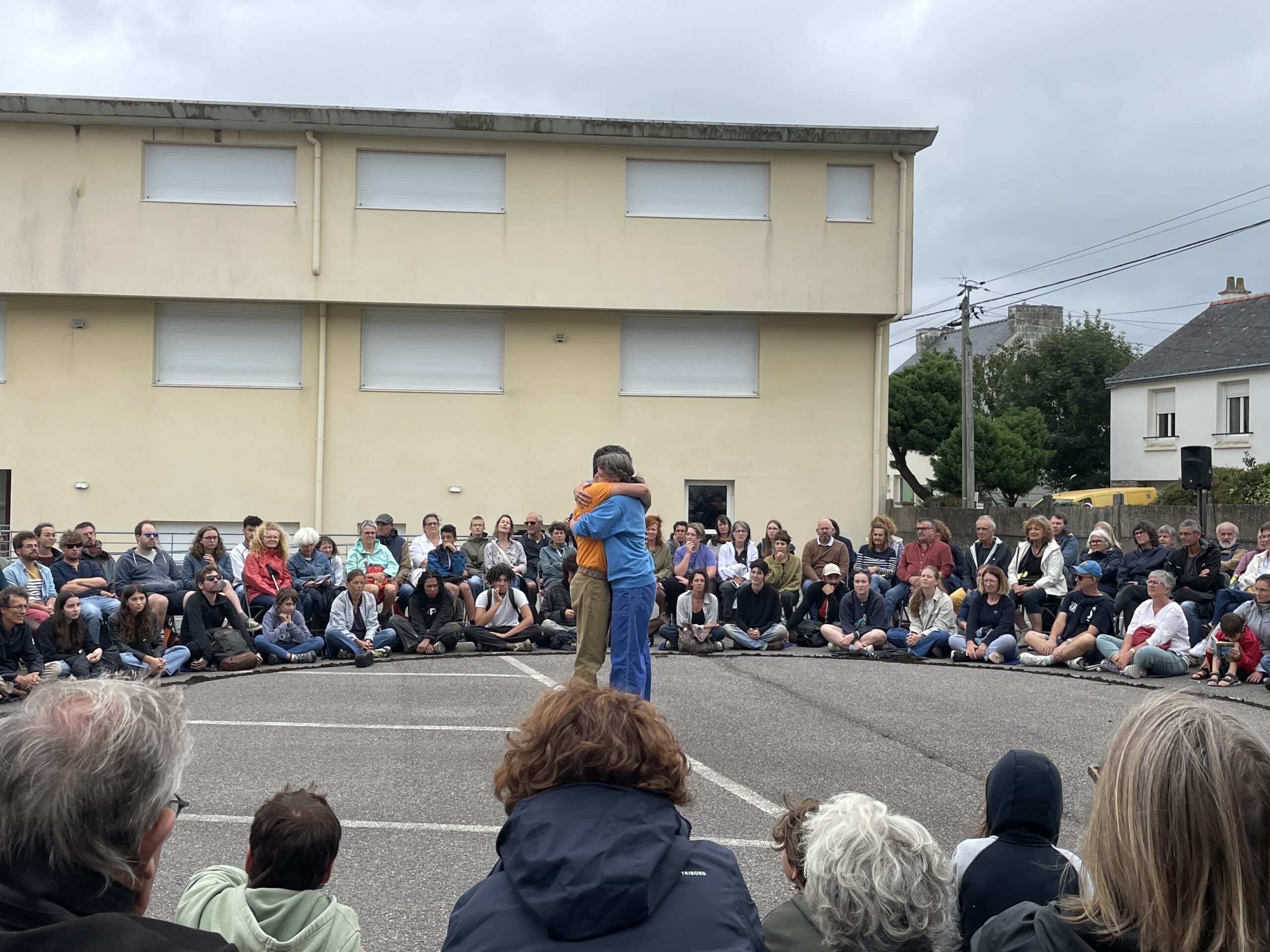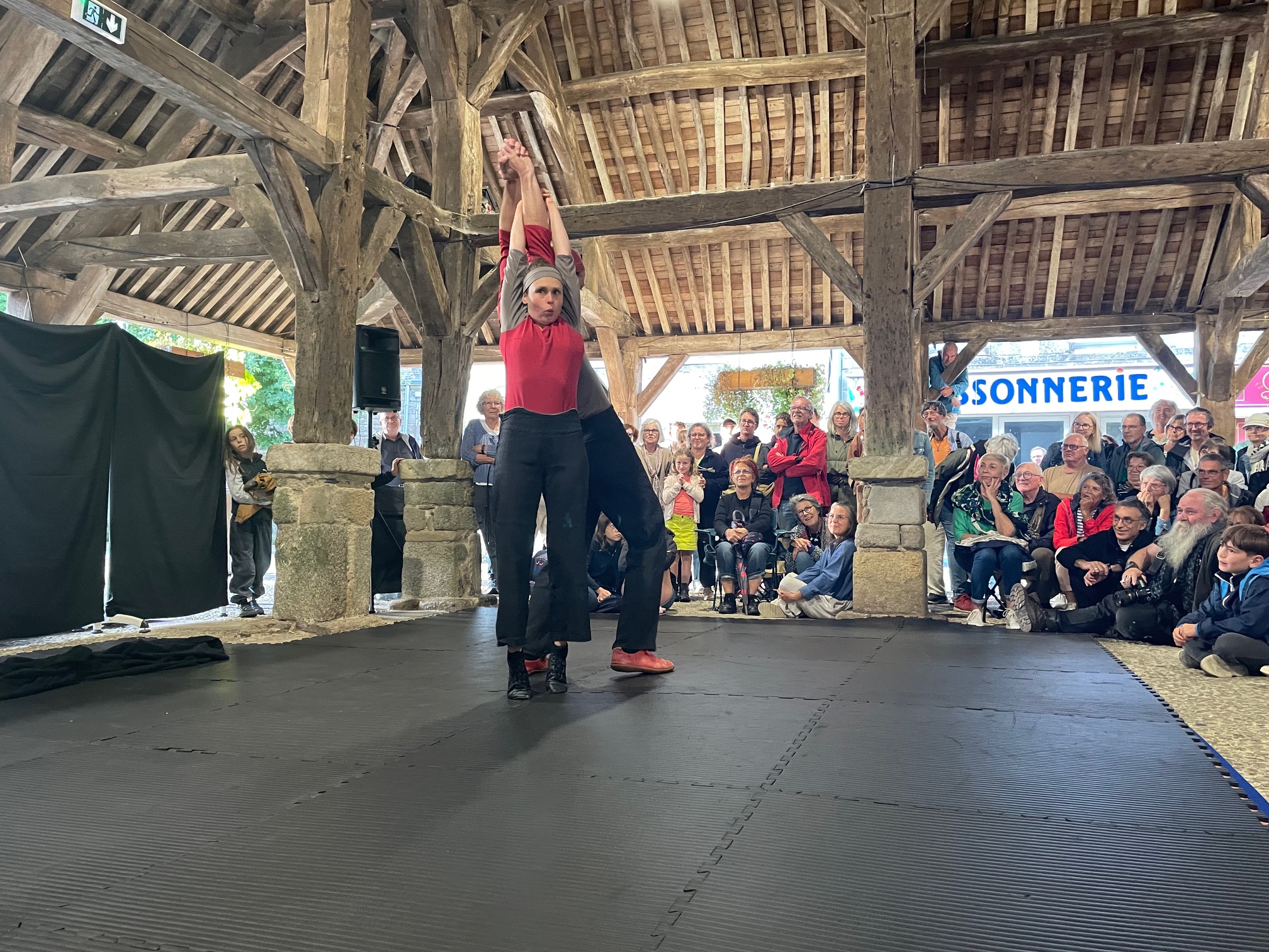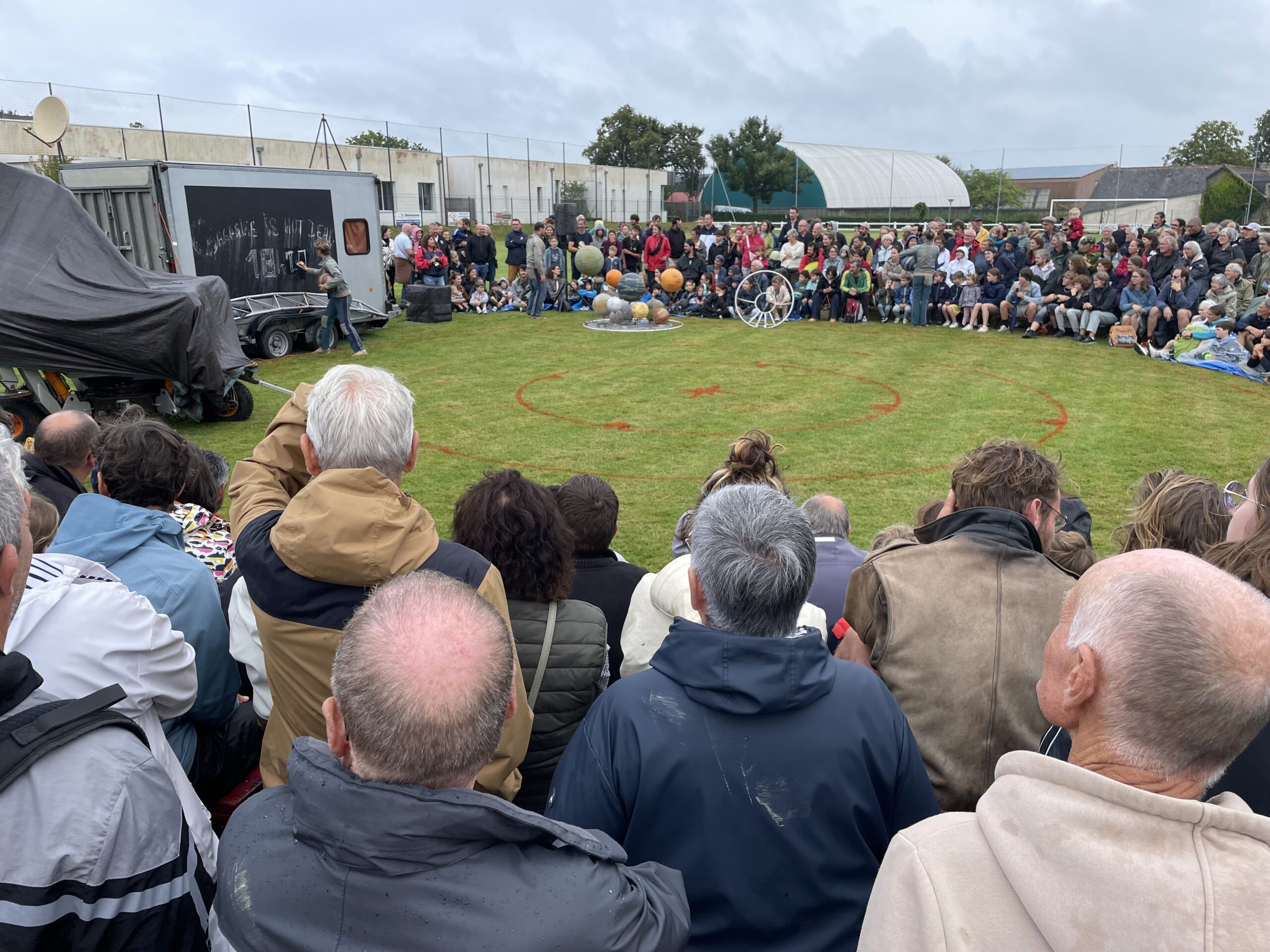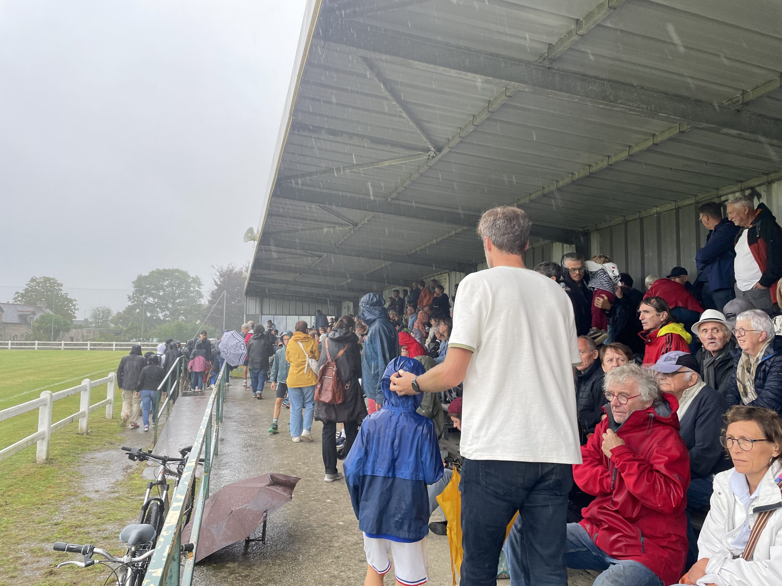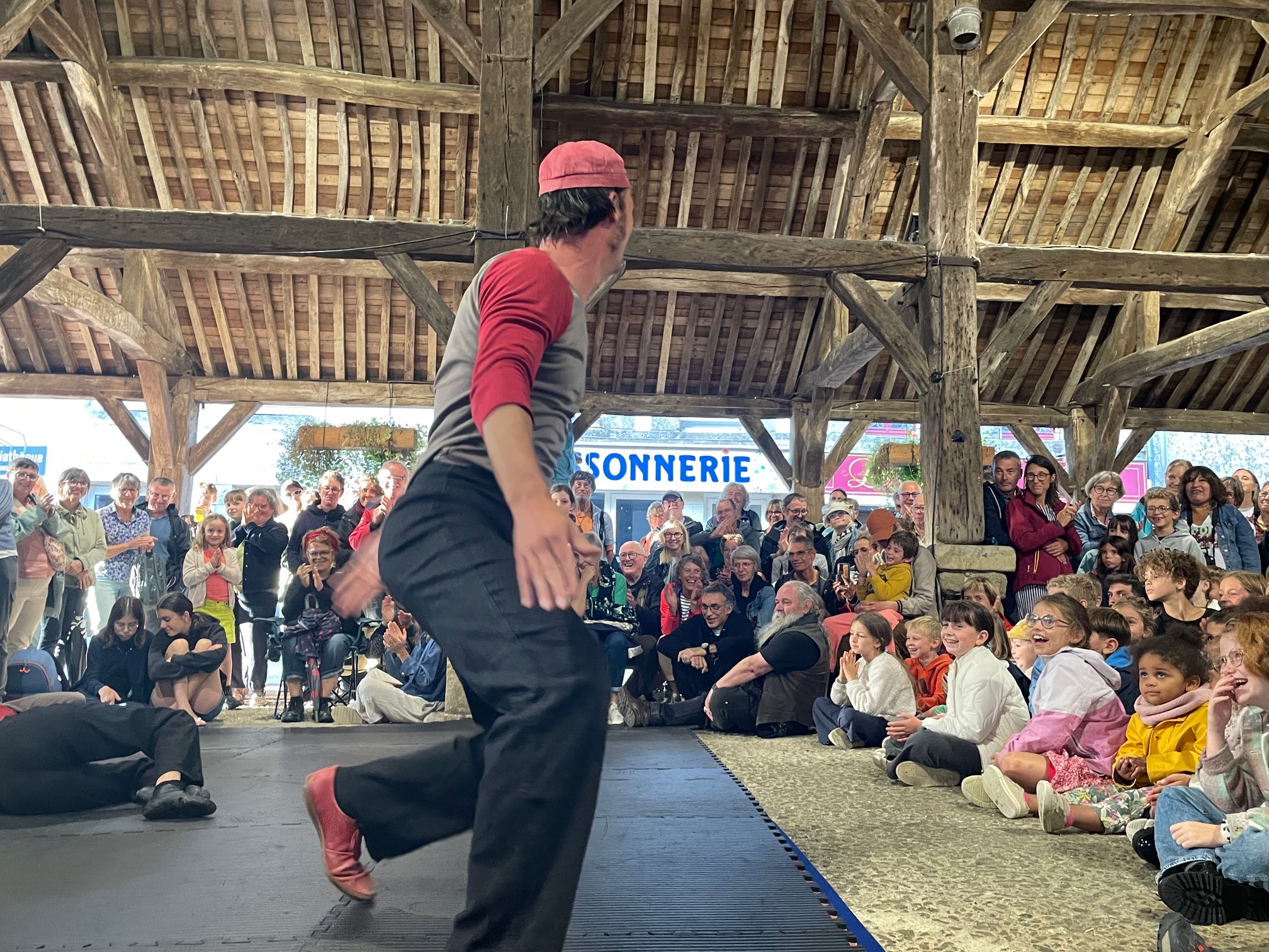 Des bâches étaient disposées par les bénévoles pour que les spectateurs puissent s’assoir par terre… et pour les intervenants, pas d’autre choix que d’être mouillés. Faire face aux aléas climatiques, c’est aussi ça l’art de la rue!