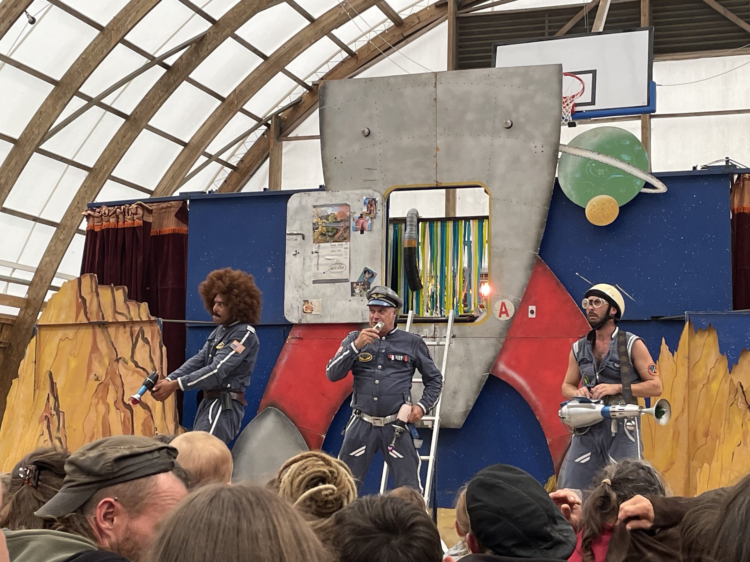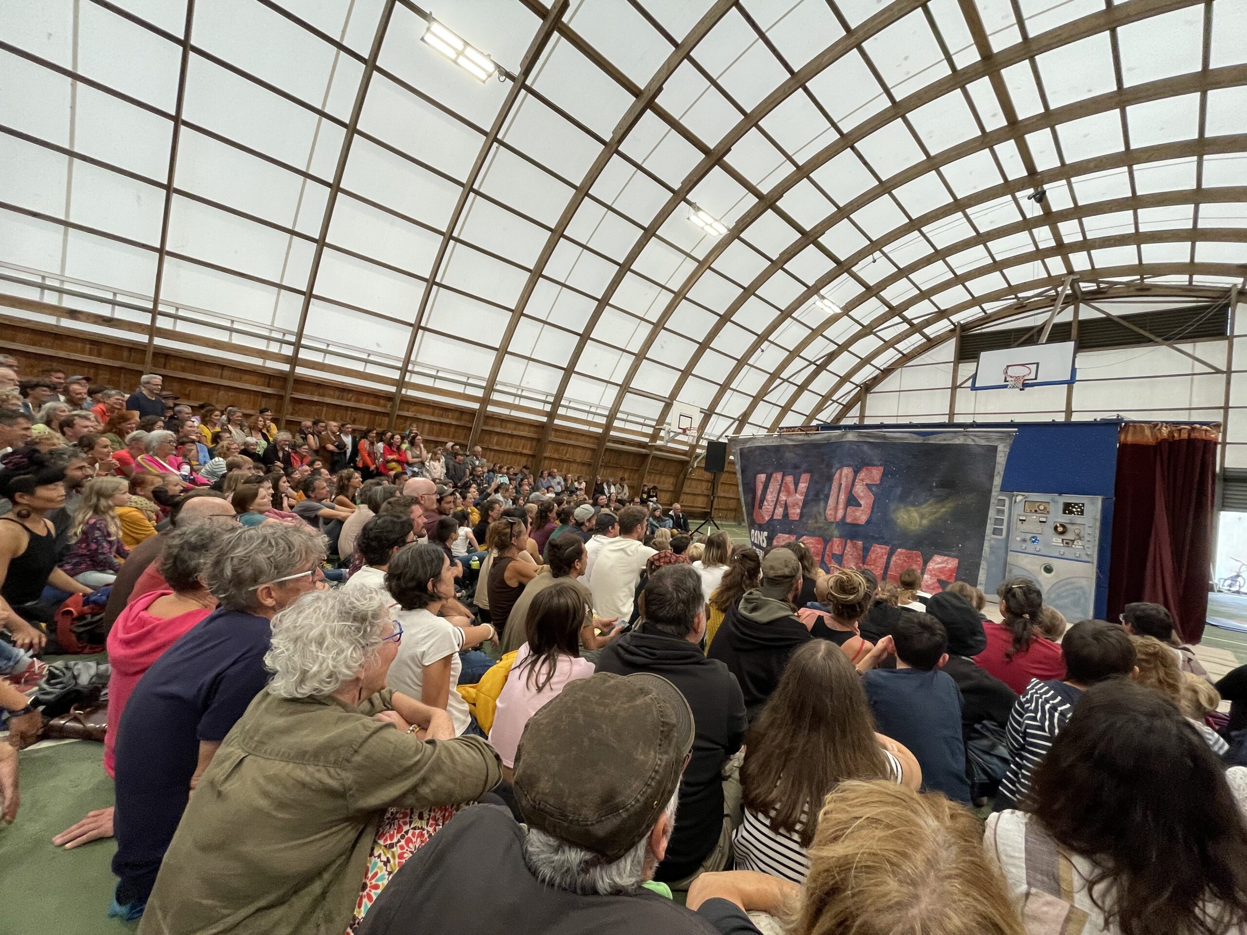 La foule était au rendez-vous. La salle de l’asphodèle a été vite pleine pour le spectacle Jogging à 15h. Le spectacle Un os dans le cosmos à 17h15 a été rapatrié dans le gymnase rue Janvier à cause de la météo. Mais dès 16h30, les festivaliers s’installaient pour assurer leur place!