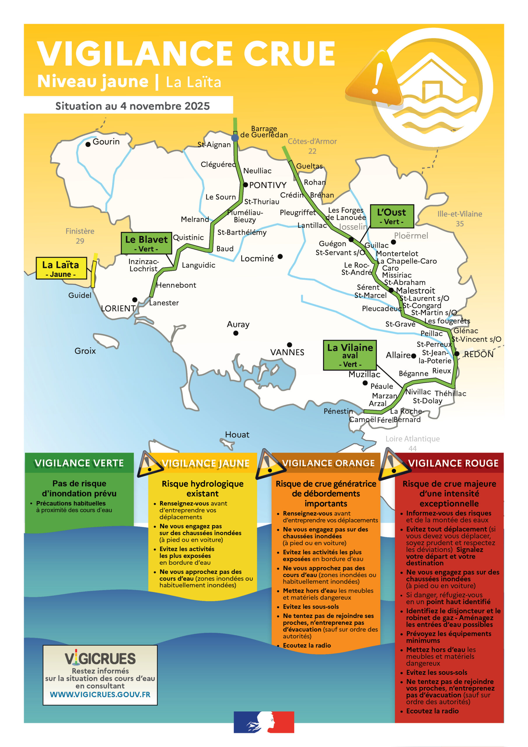 « Le préfet du Morbihan vous informe que le service de prévision des crues « Vilaine et côtiers bretons » vient de placer, ce jour, mardi 4 novembre 2025, le fleuve côtier de la Laïta en état de vigilance « Crues » de niveau jaune (niveau 2 sur une échelle de 4).