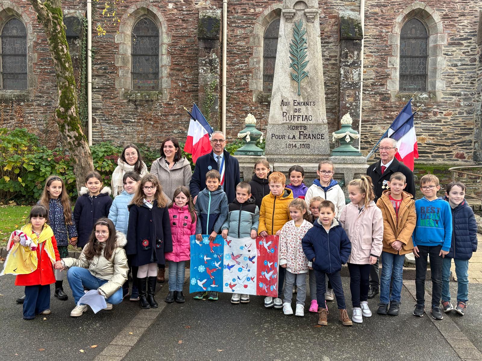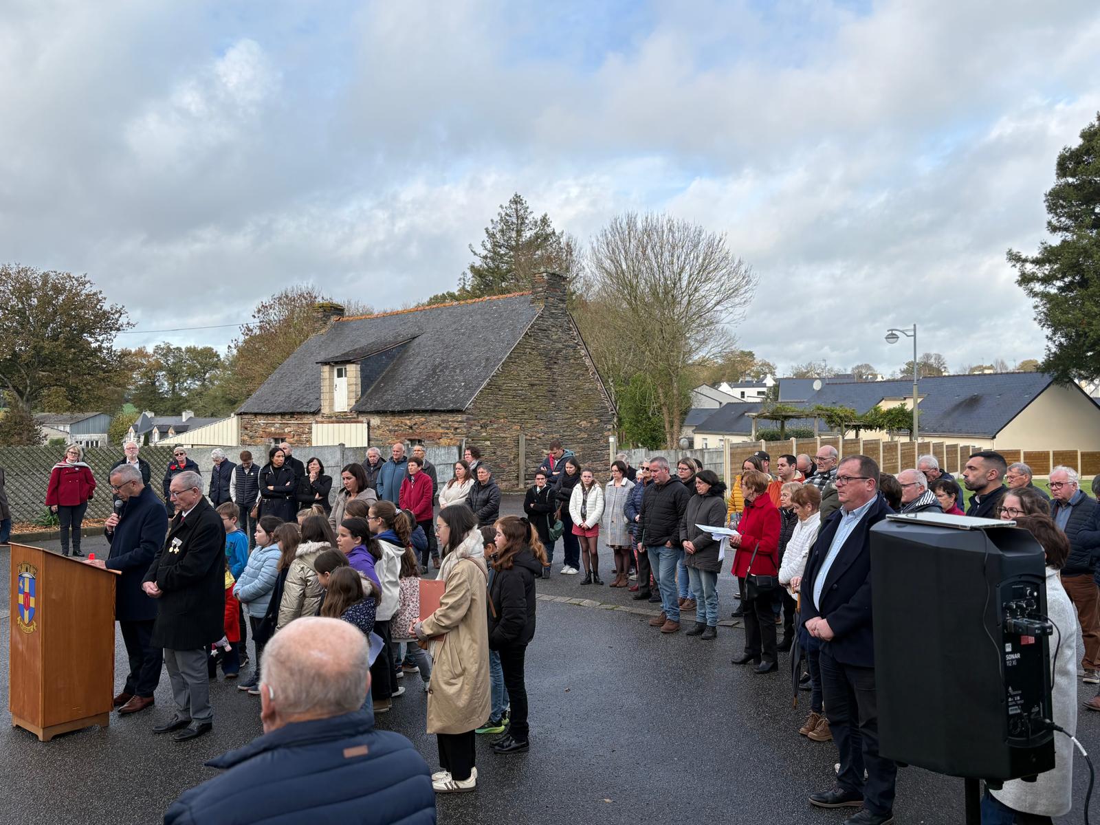 Environ cinquante habitants étaient rassemblés pour cet hommage, accompagnés des élèves de l’école Sainte-Anne. Ces derniers ont tenu un rôle central : ils ont procédé à l’appel aux morts et ont présenté un panneau représentant les Bleuets de France, symbole de mémoire et de solidarité envers les anciens combattants.
