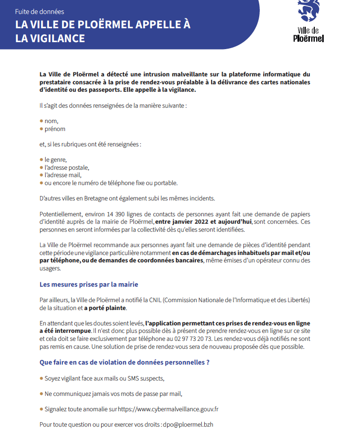 La Ville de Ploërmel annonce avoir été victime d’une intrusion malveillante sur la plateforme informatique utilisée par son prestataire pour la prise de rendez-vous liée aux cartes nationales d’identité et aux passeports. L’incident, qui touche également d’autres communes bretonnes, conduit la municipalité à appeler les usagers à la vigilance. Plus de 14 000 personnes ayant sollicité un titre d’identité entre janvier 2022 et aujourd’hui à la mairie de Ploërmel pourraient être concernées. La mairie qui a porté plainte appelle à la vigilance.