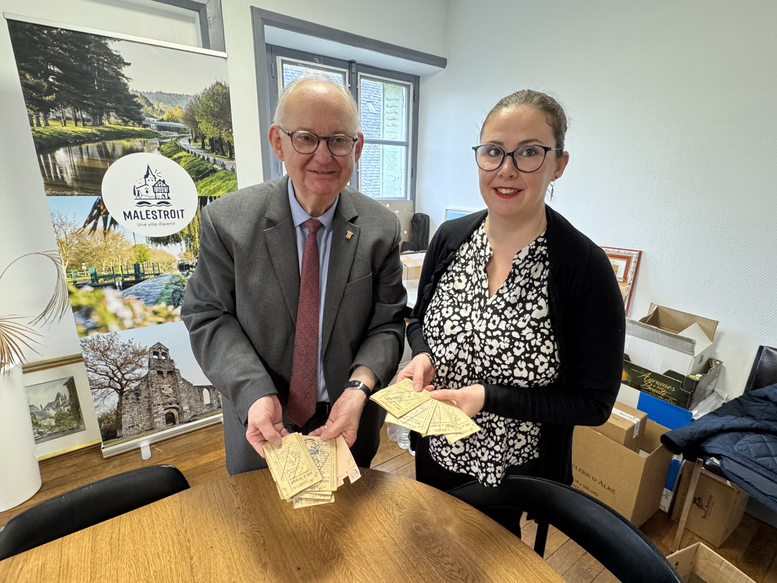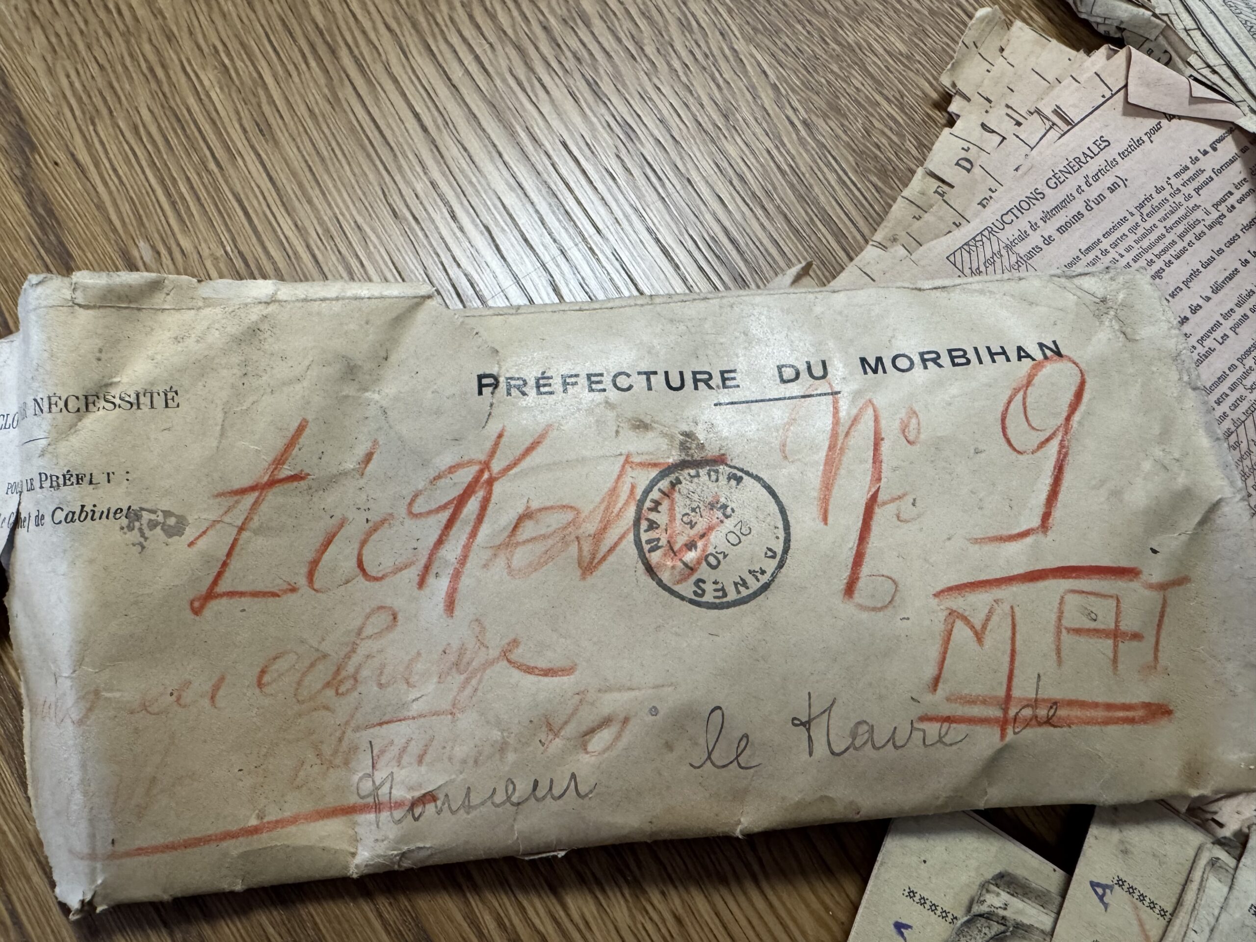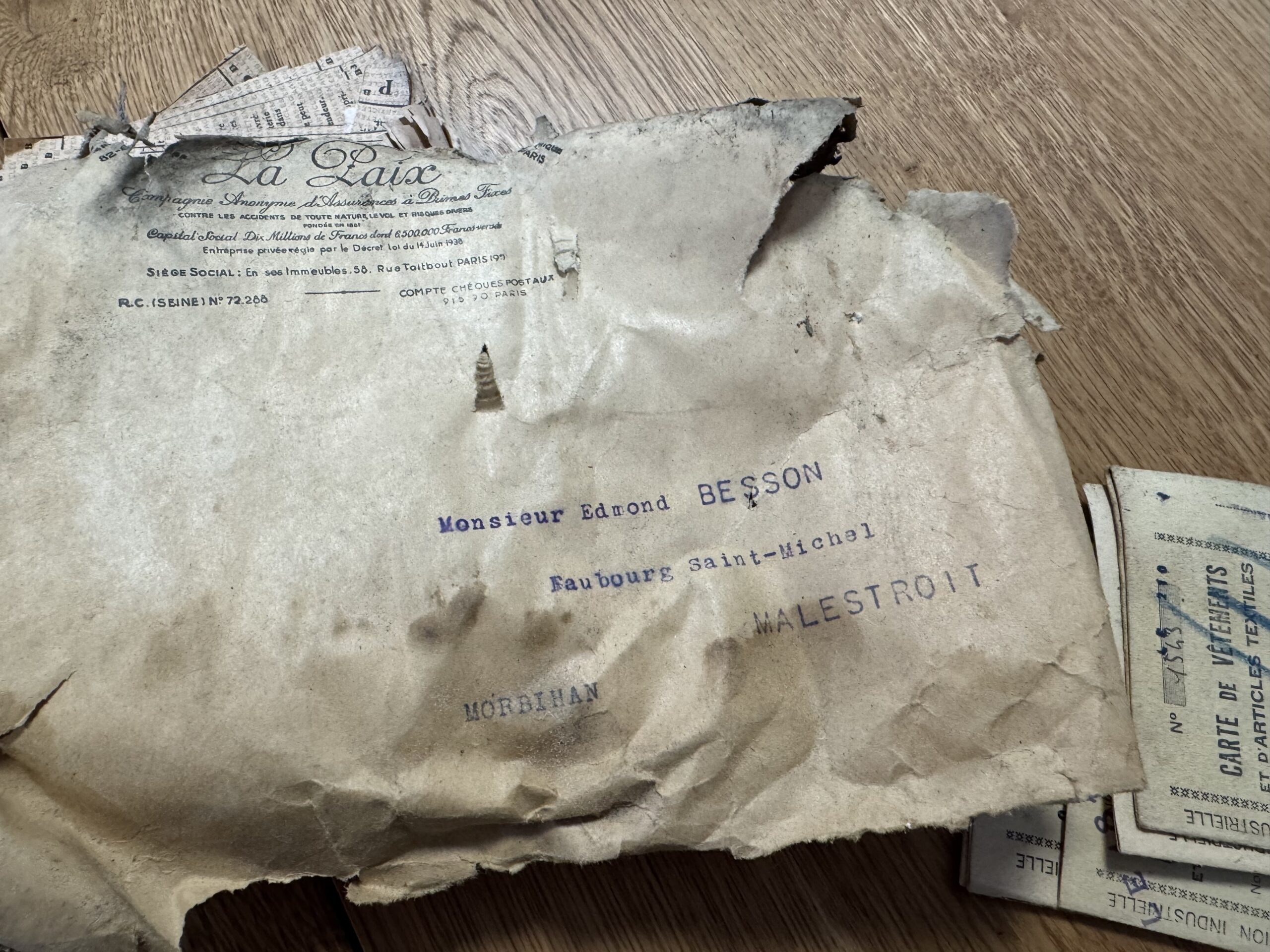 C’est une découverte étonnante et très émouvante qu’ont fait les artisans travaillant à la réfection de la charpente de la mairie de Malestroit en cours de restauration. Cachés dans un recoin de la charpente, ils ont découvert des cartes et des dizaines de tickets de rationnement vestimentaires, datant de 1942/1943. Certains de ces tickets étaient renfermés dans une enveloppe portant le cachet de la préfecture. Une autre portait l’adresse du maire de l’époque, Edmond Besson. Il s’agissait de l’adresse personnelle du maire, la kommandantur étant installée dans la mairie. La plupart des cartes portent le sigle « DCD », laissant penser qu’elles se rapportaient à des personnes décédées. Certaines concernent des personnes domiciliées dans tout le département.