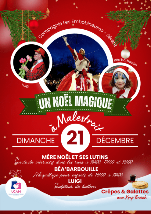 À quelques jours de Noël, Malestroit s’apprête à plonger dans une ambiance chaleureuse et féerique. Ce dimanche 21 décembre, le centre-ville vivra au rythme d’animations gratuites proposées par les commerçants de l’UCAM, avec un objectif clair : faire rêver petits et grands et réveiller l’âme d’enfant de chacun.