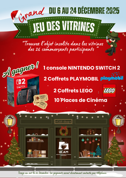 Enfin, le jeu des vitrines se poursuit jusqu’au 24 décembre. Le principe : retrouver l’objet insolite dissimulé dans les vitrines des 26 commerçants participants, avec de nombreux cadeaux à la clé. Il suffit de vous procurer la grille réponse et de la remplir. Ce jeudi matin 18 décembre, une distribution de flyers comportant cette grille se déroulera sur le marché hebdomadaire. Il ne vous restera plus qu’à revenir en famille ce week-end pour partir sur la piste de l’intrus et tenter de gagner un des superbes lots mis en jeu dont une console de jeu Swift, des coffrets Playmobil et Lego.