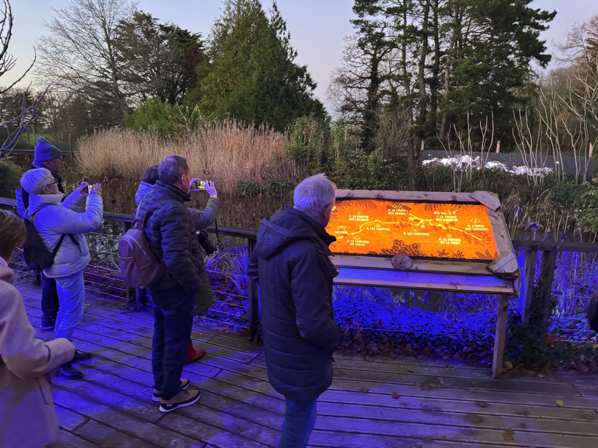 De 17h30 à 20h30, petits et grands sont invités à parcourir les sentiers du parc dans une atmosphère féerique, guidés par une histoire contée par la voix de la chanteuse Cécile Cassel, connue sous le nom de scène Hollysiz. La balade se fait au sol, mais aussi en hauteur, grâce aux filets suspendus du Parcabout, espace de loisirs récemment aménagé à Branféré, offrant un point de vue inédit sur le parc illuminé.