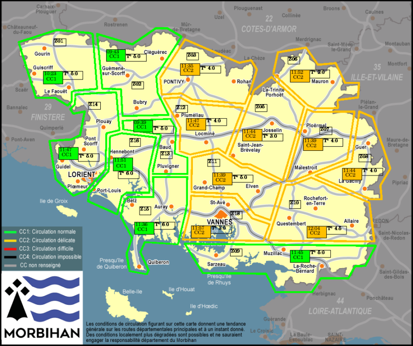 Situation toujours délicate sur une partie du réseau routier morbihannais en cette mi-journée. Voici une nouvelle carte de la situation à midi établie par le PC Routes du Département.
