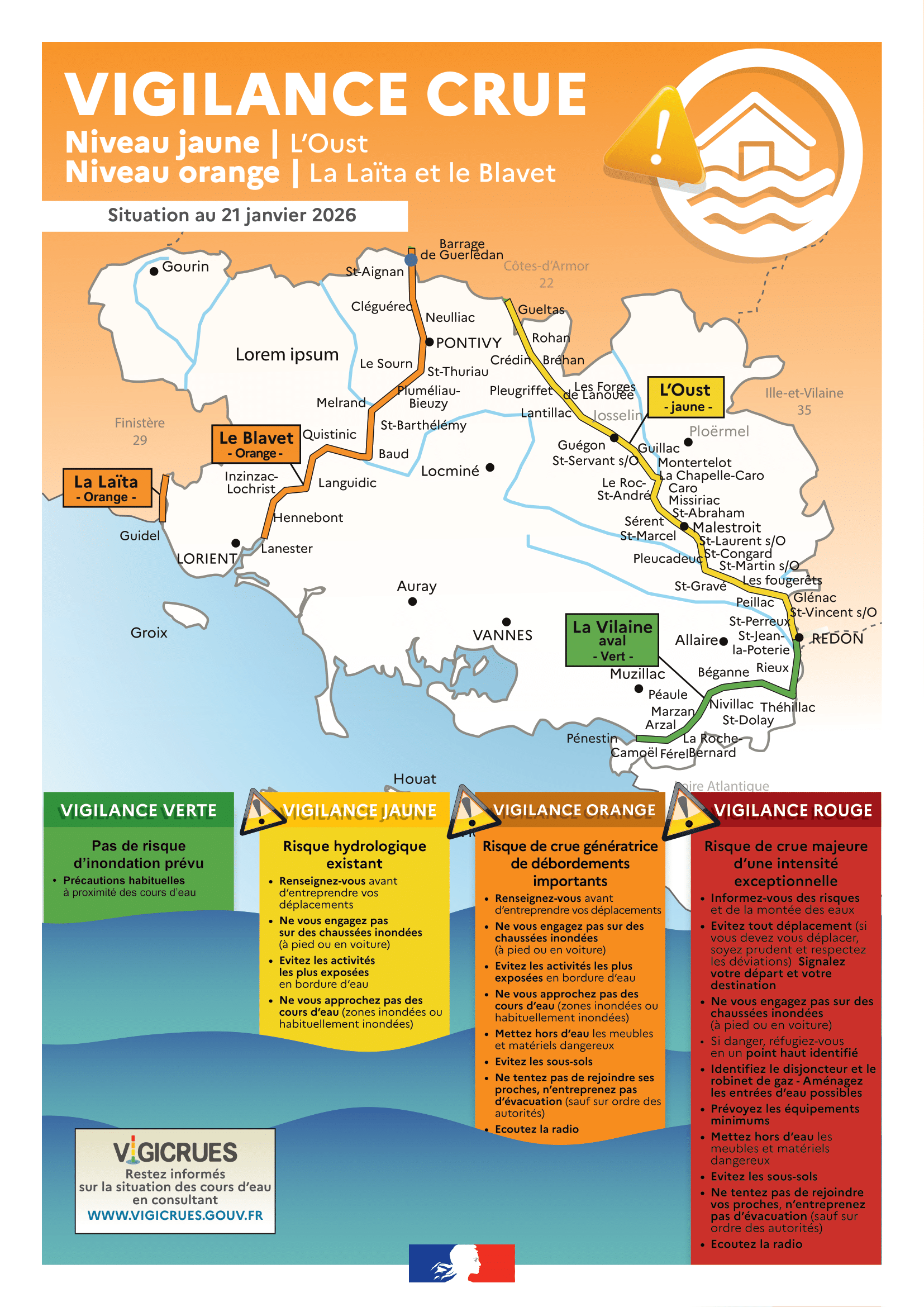 Dans un communiqué, la préfecture du Morbihan fait un nouveau point de situation vers 17 heures : « Le préfet du Morbihan vous informe que le service de prévision des crues « Vilaine et côtiers bretons » vient de placer, ce jour, mercredi 21 janvier 2026, le fleuve côtier du Blavet en état de vigilance « Crues » de niveau orange (niveau 3 sur 4).