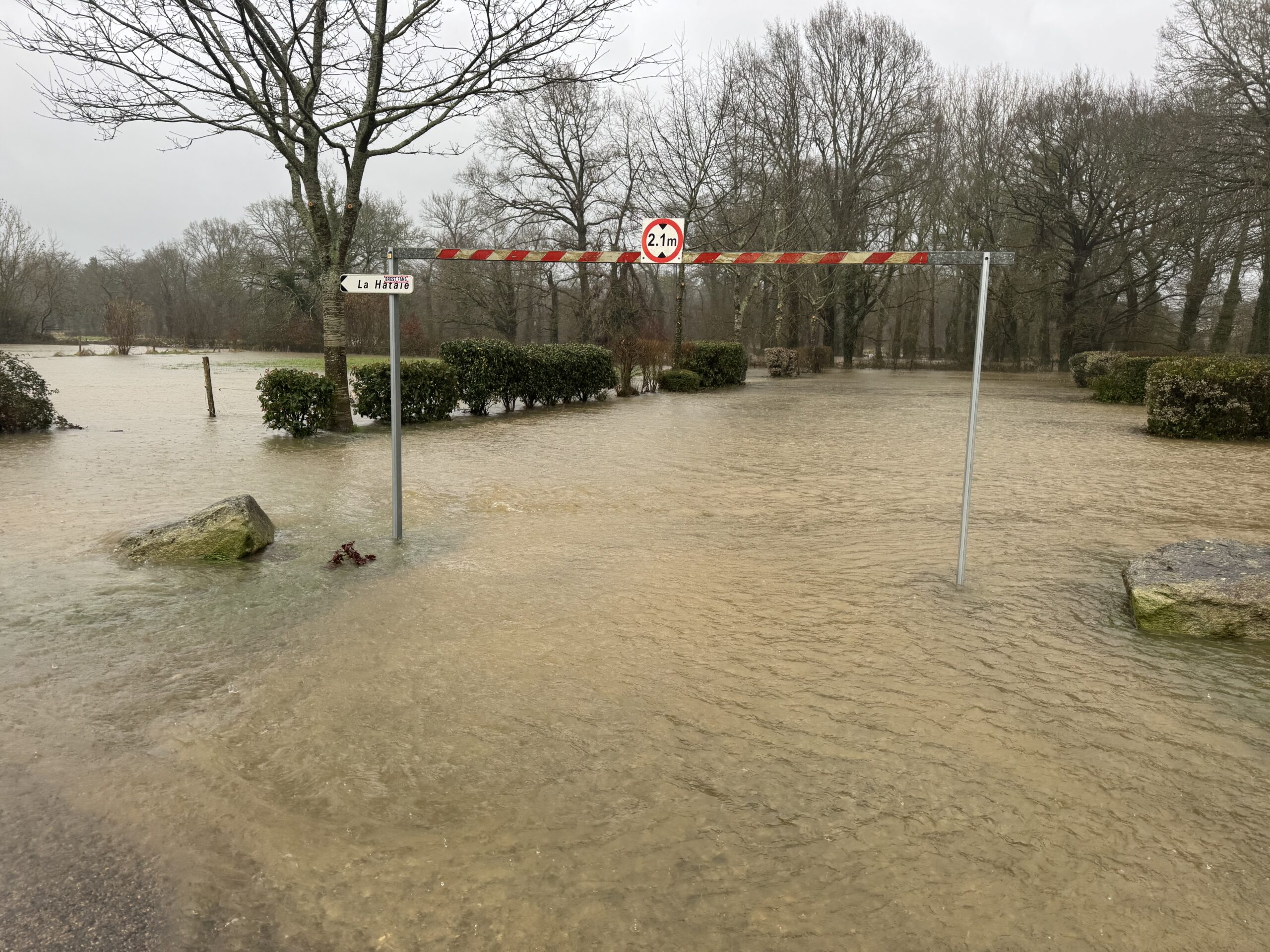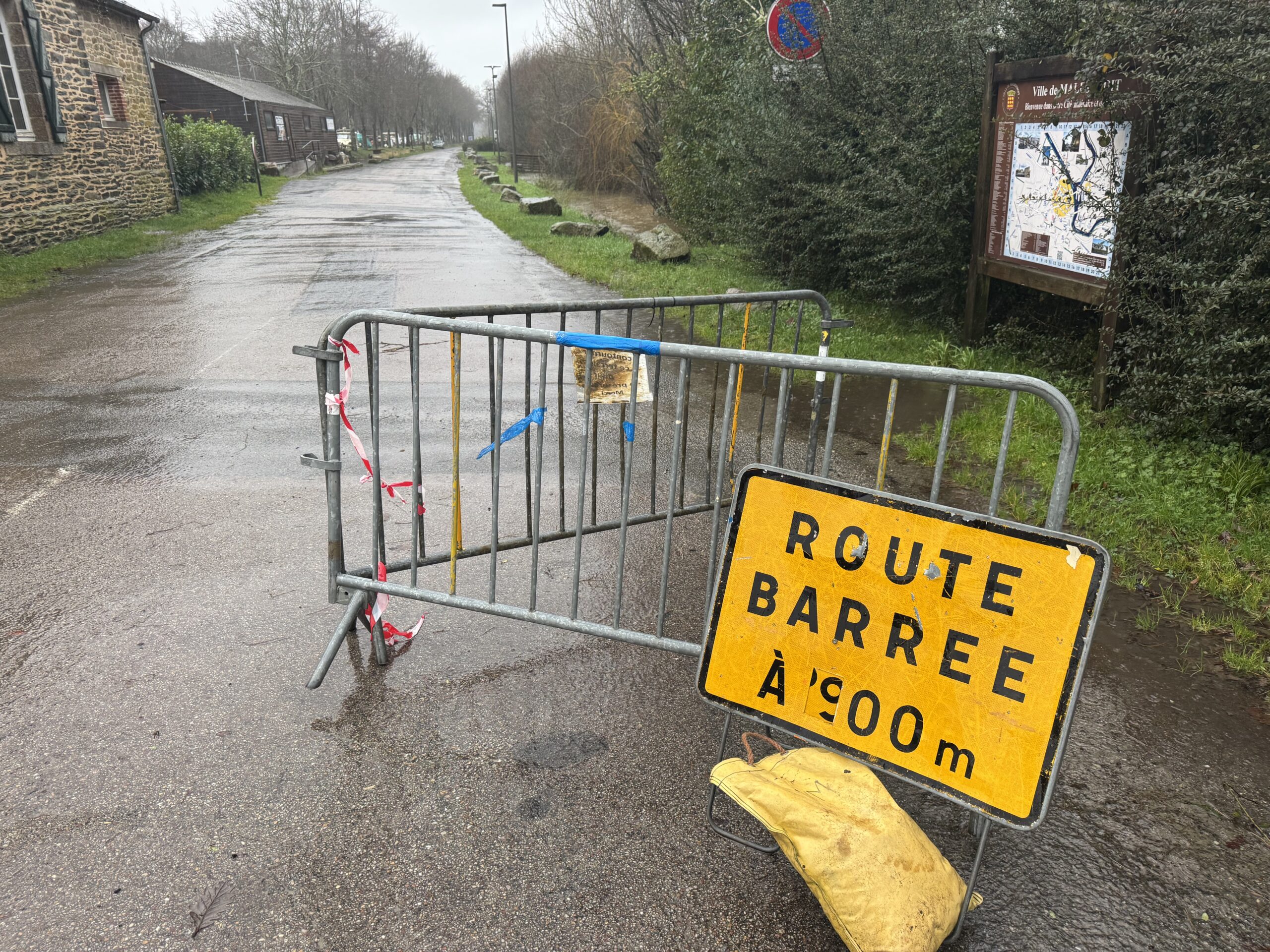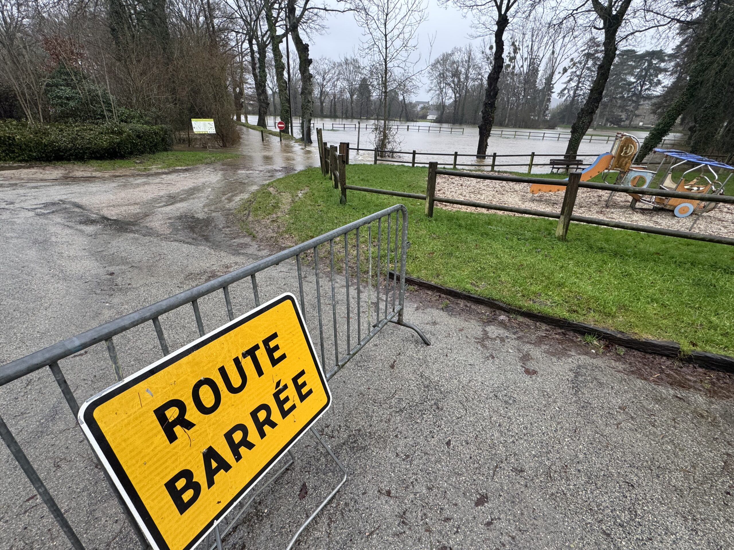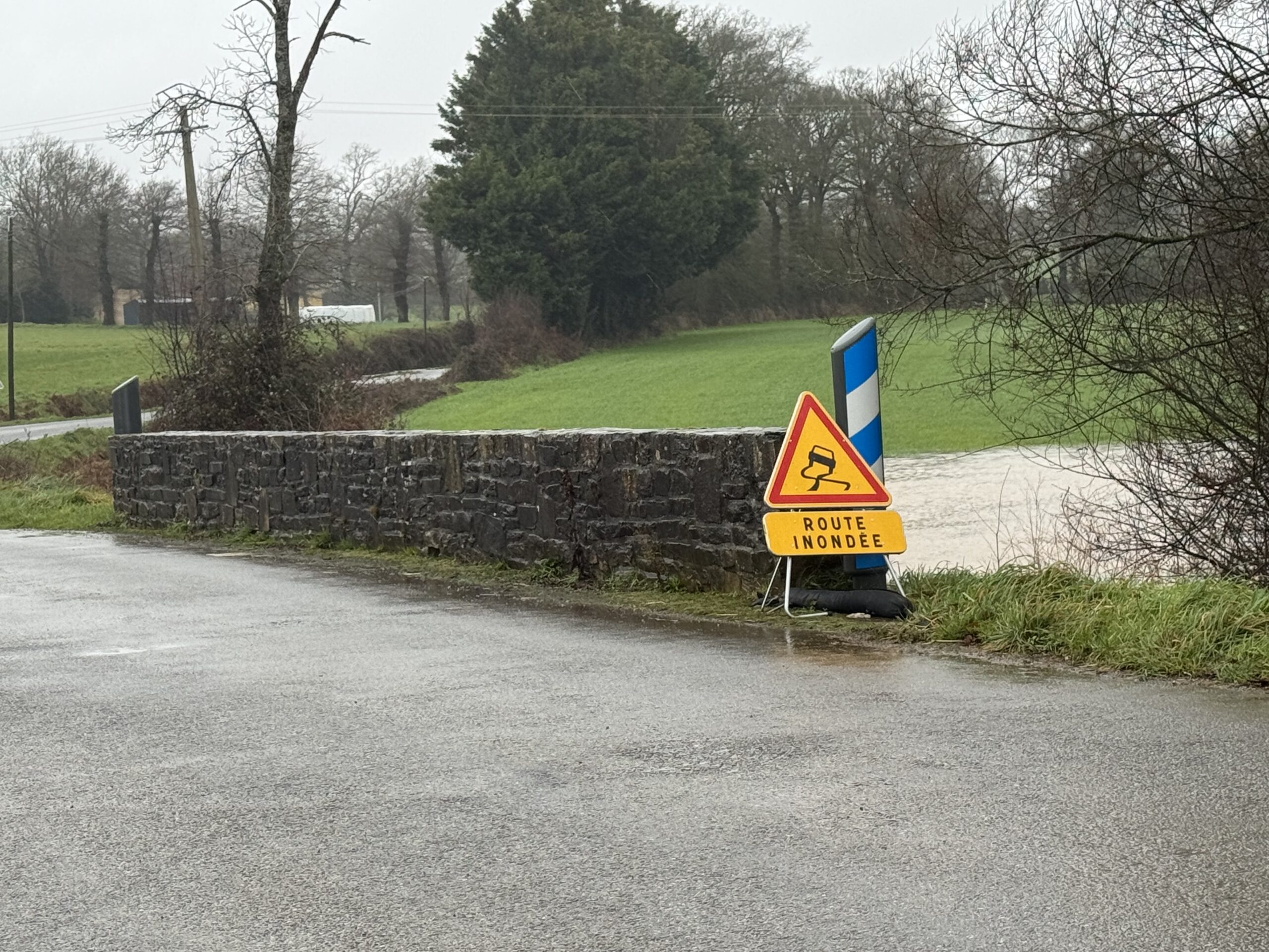 De fortes précipitations se sont abattue ces dernières heures sur la Bretagne provoquant une forte réaction de certains cours d’eau. C’est le cas dans le Morbihan qui était placé en vigilance oragne pluie-inondation depuis 4 heures cette nuit de mardi à mercredi. Le Blavet et la Laïta sont en vigilance orange crue et l’Oust en vigilance jaune depuis mardi. Les pluies de ce mercredi n’ont pas arrangé la situation arrivant sur des soles gorgés d’eau. A Malestroit le canal est sorti de son lit ce mercredi après-midi, provoquant toujours l’inquiétude des riverains. « J’ai organisé une réunion interne dès mardi soir pour anticiper les choses. Nous surveillons l’évolution de la situation attentivement. Ce mercredi en milieu d’après-midi nous étions à plus d’1,80 mètre à l’écluse et le niveau va continuer de monter. On pourrait atteindre les 2,50 m demain soir (ndlr: jeudi). Nous nous tenons prêts… Il faudrait que nous ayons 2 ou 3 jours de répit pour limiter la montée des eaux », nous indique Bruno Gicquello, le maire de Malestroit qui ne cache pas son inquiétude face aux prévisions météorologiques qui annonce de nouvelles pluies les jours prochains et surtout sur la répétition de ces phénomènes. « L’an dernier à la même époque nous avons déjà subi une crue. Cela devient de plus en plus fréquent… ». Les services techniques ont déjà mis en place des interdictions d’emprunter certaines routes. Tout le secteur de la digue est déjà sous les eaux.