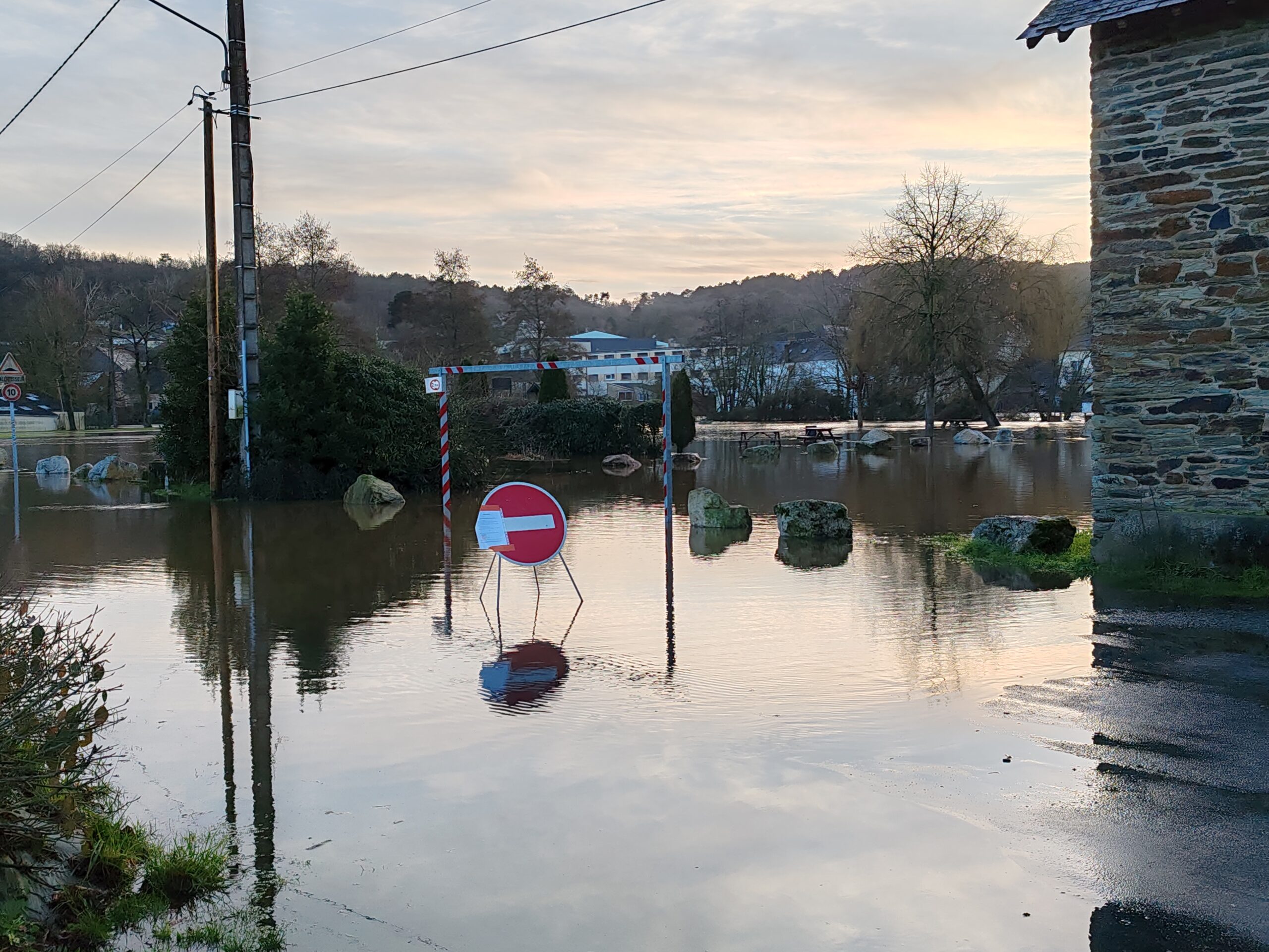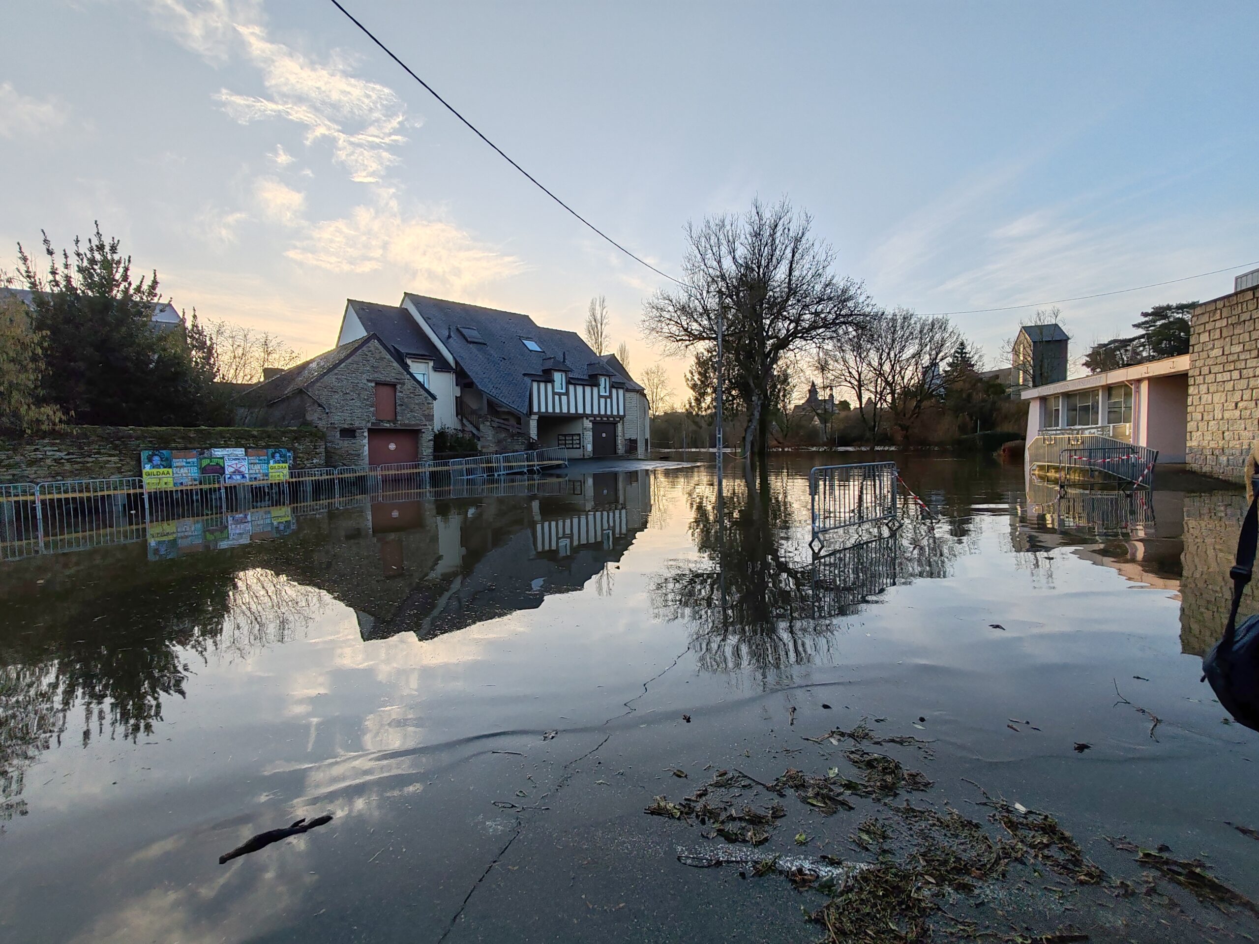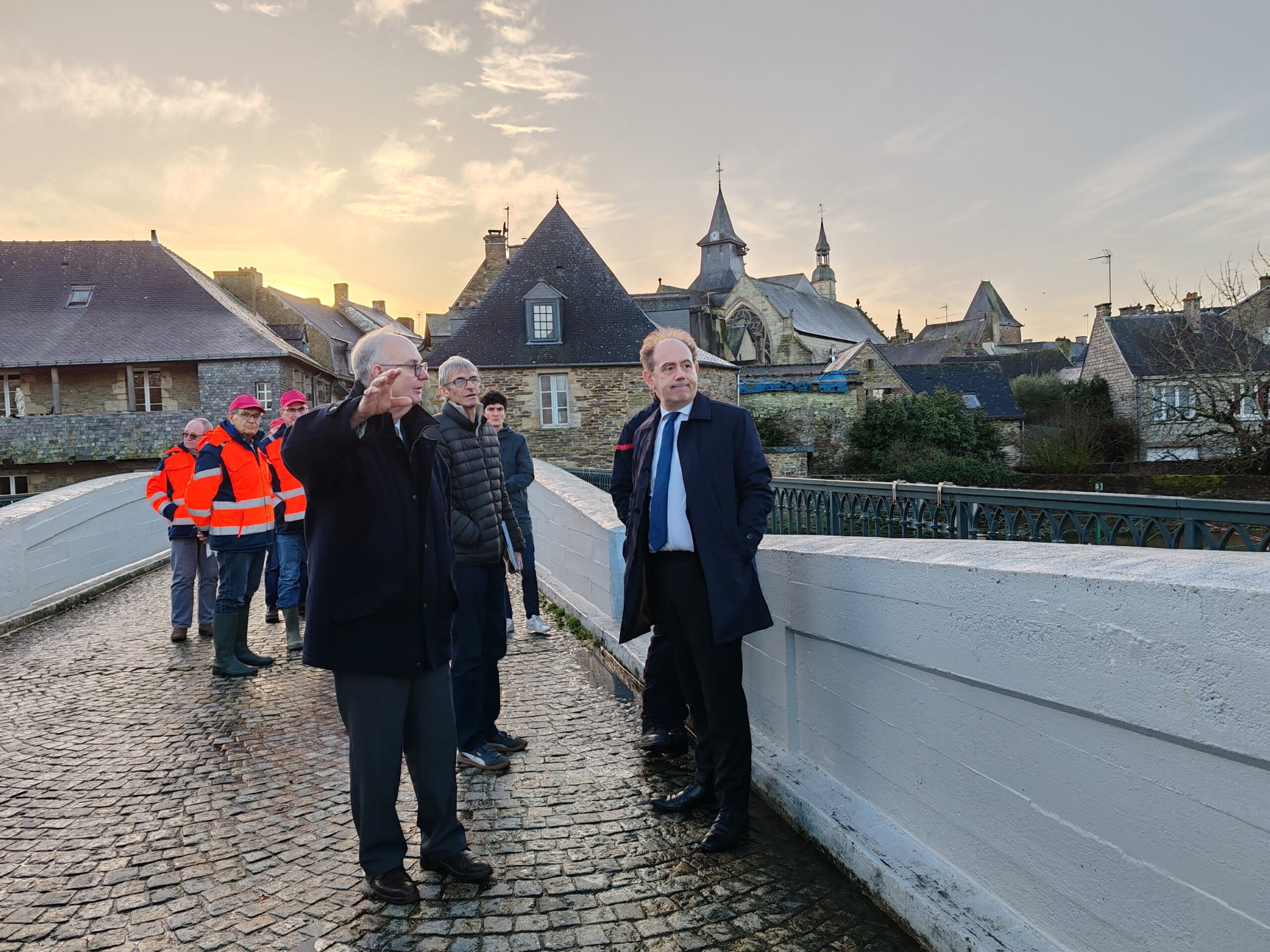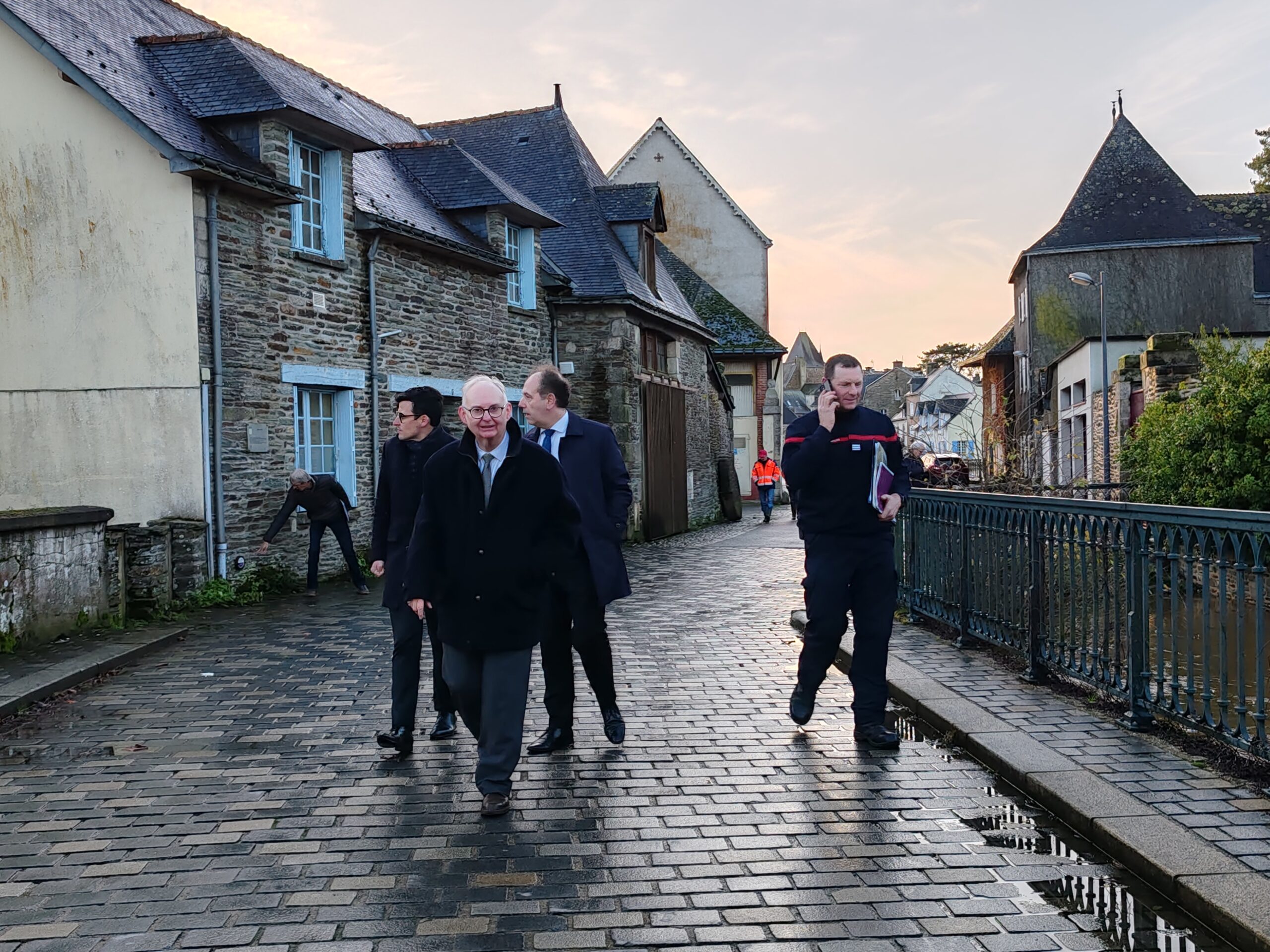 Le préfet du Morbihan, Michaël Galy est venu ce jeudi après-midi à Malestroit, prendre la mesure de la situation liée aux inondations consécutives aux fortes pluies qui se sont abattues sur le territoire ces derniers jours. Ce matin, Bruno Gicquello, le maire de Malestroit a activé le plan communal de sauvegarde et mobilisé la réserve communale de sécurité. Un certain nombre de mesures ont été prises dans la journée pour faire face à la montée des eaux. C’est notamment l’interdiction d’utiliser les terrains du complexe sportif mais aussi le parking de la salle des fêtes qui est sous les eaux. Un cheminement sur des bastaings posés sur des parpaings a été installé pour permettre aux habitants de la résidence riveraine de l’Oust place Bonsergent de sortir et de rentrer chez eux.