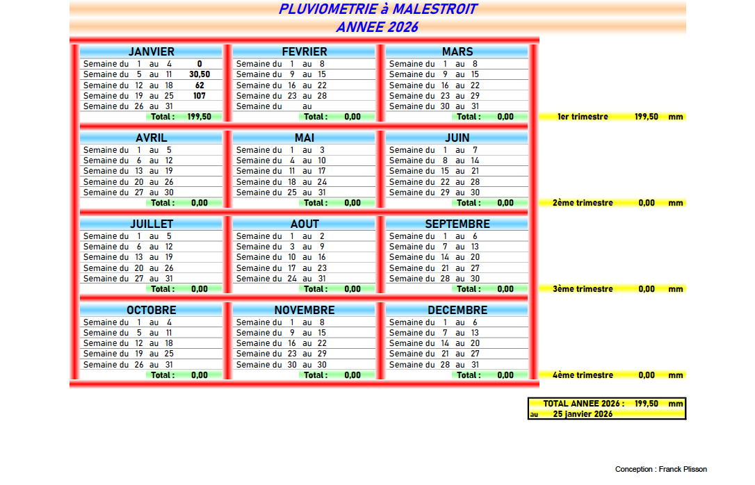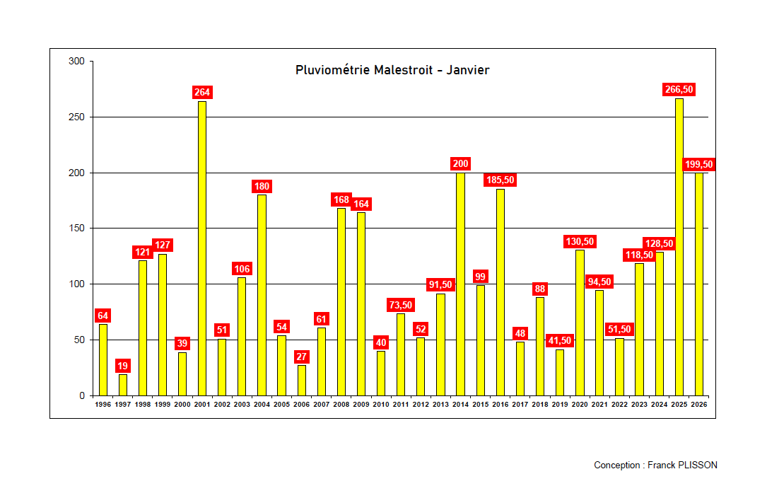 Déjà, ce mois de janvier 2026 ressemble étrangement à celui de l’année dernière qui avait battu un record de précipitations, comme nous le confirme Franck Plisson observateur attentif de la pluviométrie au coeur de Malestroit.