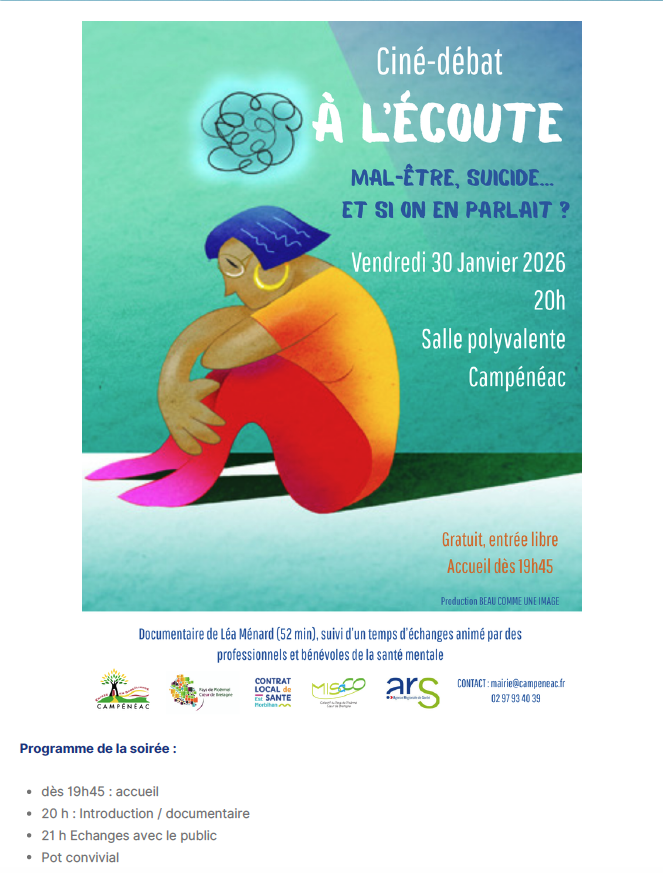 Intitulée « À l’écoute : mal-être, suicide… et si on en parlait », la rencontre se tiendra à partir de 20 heures à la salle polyvalente de Campénéac, avec un accueil du public dès 19 h 45.