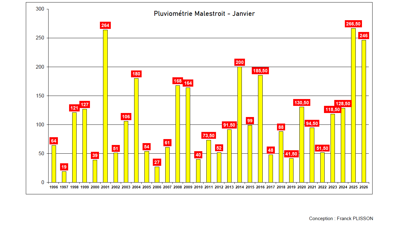 Et voila, ce qu’on attendait avec impatience, à savoir les relevés pluviométriques et l’analyse du mois de janvier 2026 faite par Franck Plisson. Un mois de janvier marqué par une crue importante de l’Oust qui a mis la ville sur le devant de l’actualité nationale. Mais pour autant, s’il a beaucoup plu, le mois de janvier 2026 arrive en 3è position des mois de janvier les plus humides de ces 30 dernières année. II cumule 246 mm de pluie contre 265,5 mm en janvier 2025 et 264 mm en janvier 2001 (date d’une crue historique). Mais il faut aussi mettre ce chiffre en perspective avec la moyenne pluviométrique d’un mois de janvier calculée sur les 30 dernières années qui est seulement de 110 mm.