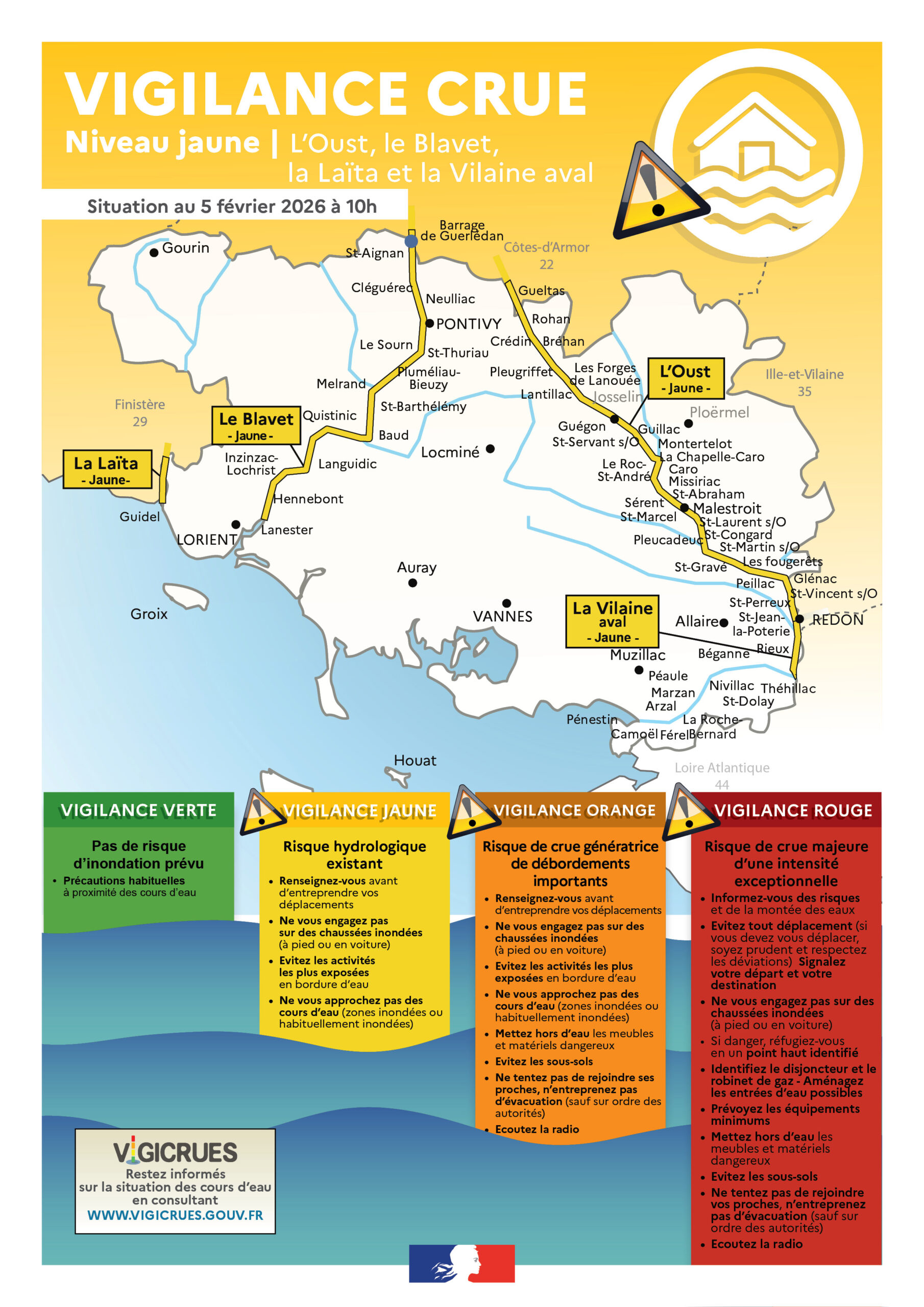 « Le préfet du Morbihan vous informe que le service de prévision des crues « Vilaine et côtiers bretons » vient de placer, ce jour, jeudi 5 février 2026, le fleuve côtier du Blavet et la rivière de l’Oust en état de vigilance « Crues » de niveau jaune (niveau 2 sur une échelle de 4). La Laïta et la Vilaine aval sont également placées en niveau de vigilance jaune (niveau 2 sur 4).