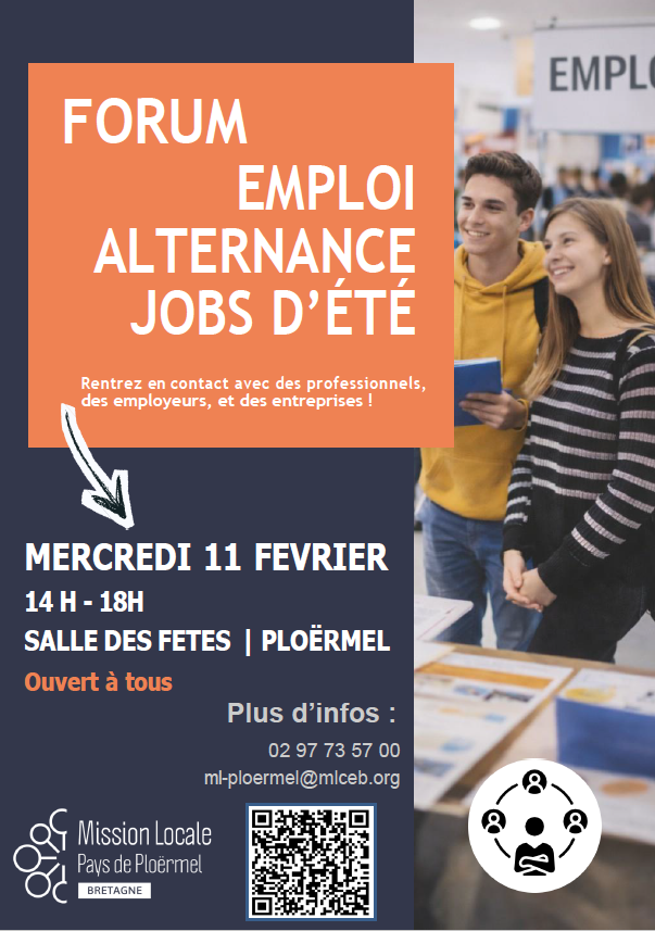 La Mission locale du Pays de Ploërmel organise un Forum Emploi/Alternance/Jobs d’été le mercredi 11 février, de 14 h à 18 h, à la salle des fêtes de Ploërmel.