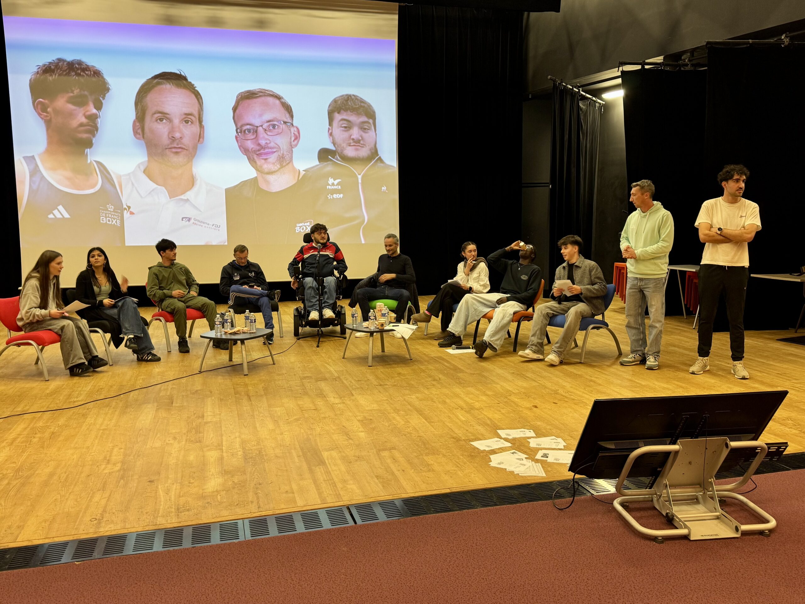 C’est quoi le monde du sport de haut niveau? C’est pour tenter de répondre à cette question que les élèves de 1ère spécialité sport du lycée La Mennais ont reçu ce mardi après-midi 4 sportifs de haut niveau. Benoît Vaugrenard ancien champion cycliste et actuel directeur sportif de l’équipe Groupama-FDJ, Aurélien Fillatre, champion du monde de foot-fauteuil, Yohan Hobé, entraineur de boxe du Brocéliande Full boxing et Jozué Gaucher, champion de France de boxe -60 kg se sont livrés de bonne grâce au jeu des questions. Celles-ci avaient été préparés en classe et 5 élèves, Romann, Noëlie, Elsa, Louane et Ih Pei étaient chargés d’interroger les sportifs. Une mission pas simple que de se retrouver face aux 4 classes de la section rejoints par les élèves des sections foot et basket, soit un auditoire d’une centaine d’étudiants. A la fin de la séance, ces derniers ont également pu interroger à leur tour les sportifs.