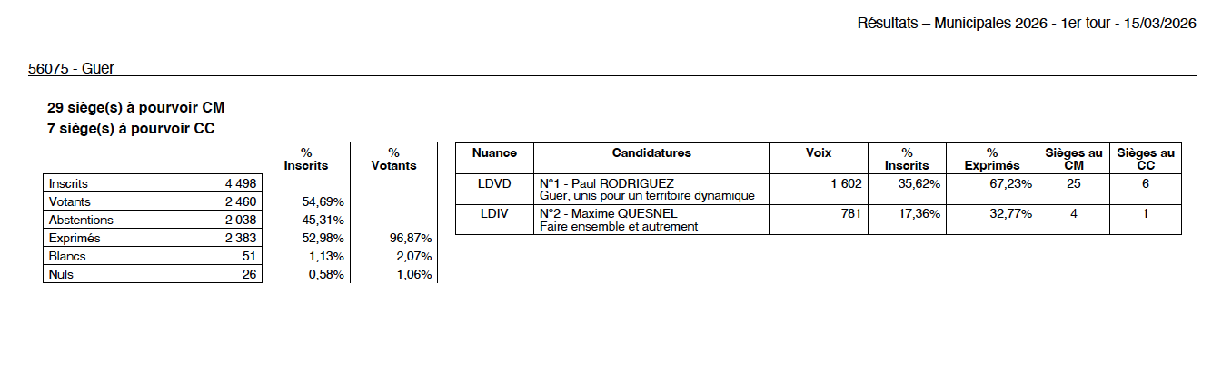 La liste « Guer, unis pour un territoire dynamique » conduite par Paul Rodriguez a donc largement remporté les élections municipales de Guer (près de 68%) devant la liste participative « Faire Ensemble et Autrement » constituée par le Collectif citoyen guerrois et conduite par Maxime Quesnel. La liste de Paul Rodriguez est le prolongement de l’actuelle équipe municipale. Après la proclamation des résultats, Paul Rodriguez a remercié ses électeurs et remercié la 2è liste d’avoir mené une campagne digne. « Je leur tends la main pour travailler avec nous au profit des guerrois », a-t-il assuré. il a annoncé que le conseil municipal de Guer se réunira le vendredi 20 mars prochain à 18 h 30 pour la mise en place de la nouvelle équipe.