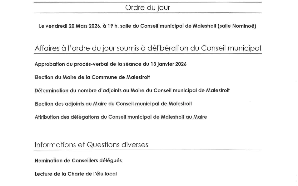 L’installation du nouveau conseil municipal de Malestroit aura lieu ce vendredi 20 mars à 19 heures, salle du conseil municipal (salle Nominoë).