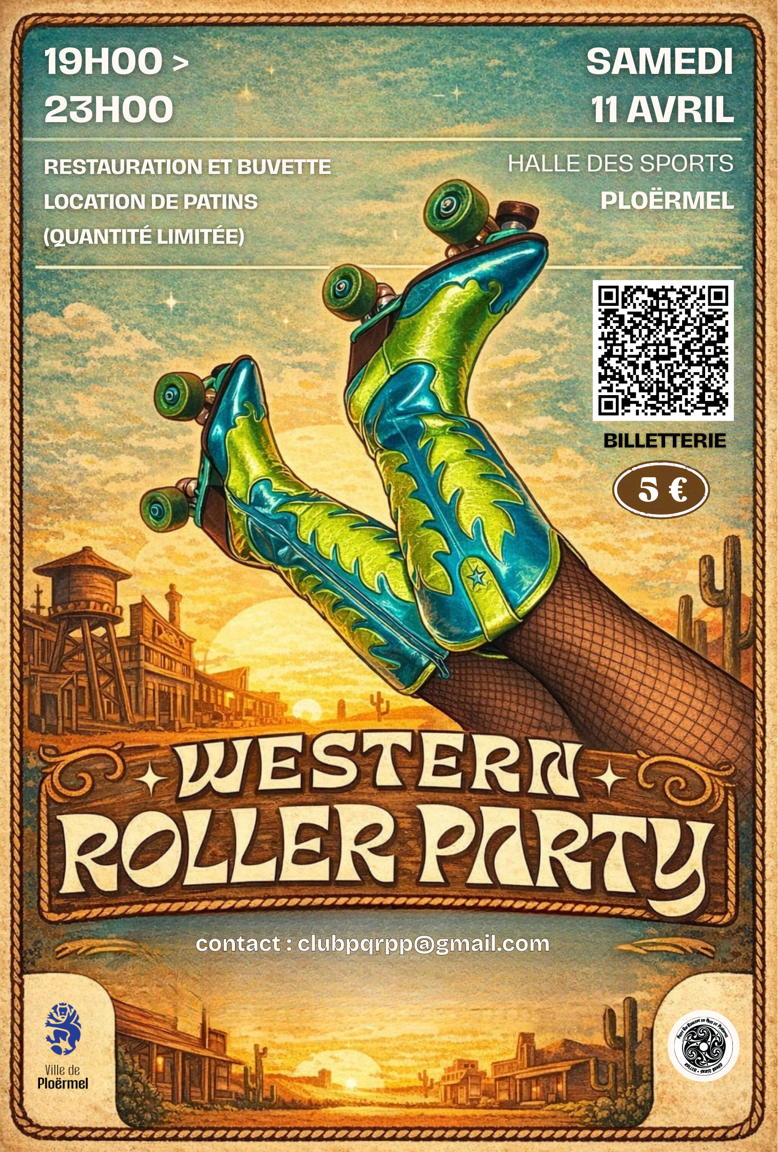 Samedi 11 avril, rendez-vous Ploërmel pour une soirée pas comme les autres : une grande Roller Party sur le thème Western qui promet de faire vibrer la piste ! Que vous soyez adepte de roller ou simplement amateur de bonne ambiance, cet événement est fait pour vous.