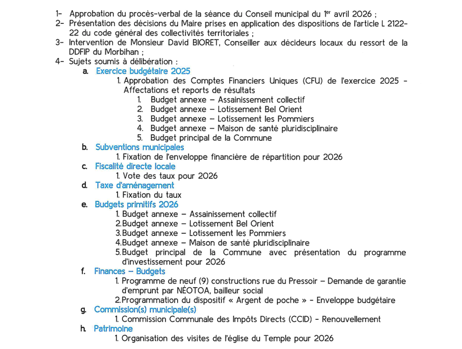 Voici l’ordre du jour du prochain conseil municipal de la ville de Carentoir qui se tiendra le mardi 28 avril à 19 heures à la mairie.