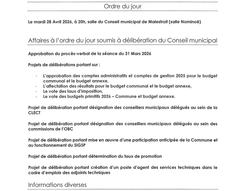 Voici l’ordre du jour de la réunion du conseil municipal de Malestroit qui se réunira ce mardi 28 avril à 20 heures, salle Nominoë.
