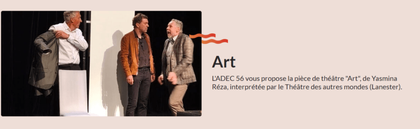 Né en 2012, le Théâtre des autres mondes réunit à Lanester des passionnés de théâtre qui s’entourent de metteurs en scène professionnels. Après la réalisation du « Dieu du Carnage », la troupe retrouve l’écriture de Yasmina Reza et, sous la direction de Jean Quiclet, met en scène « Art ».